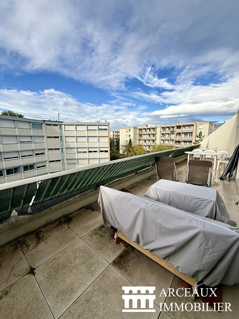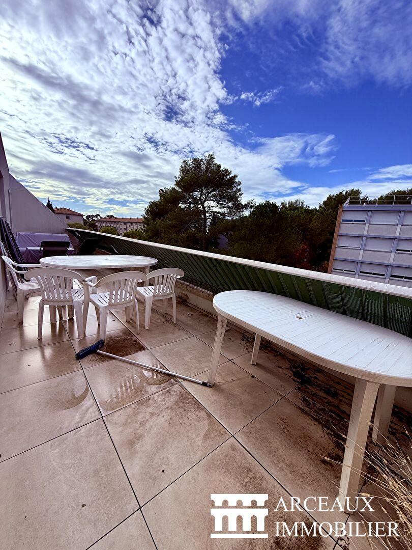 Montpellier - Faculté de Pharmacie / Stade Philippidès. Votre agence Arceaux Immobilier vous propose un appartement 2 pièces traversant, au 3ème et dernier étage d'une copropriété à taille humaine. Entrée avec placards et séjour lumineux ouvert sur balcon et terrasse de plus de 30m² exposée Sud Ouest. Cuisine séparée, chambre avec salle de bains et toilettes. Cave en sous-sol et parking libre dans la résidence. Tram L1 à 850m et Bus n°10 et 15 à 250m. Copropriété de 22 lots - dont 20 lots habitation. (). Charges annuelles : 1800 euros.