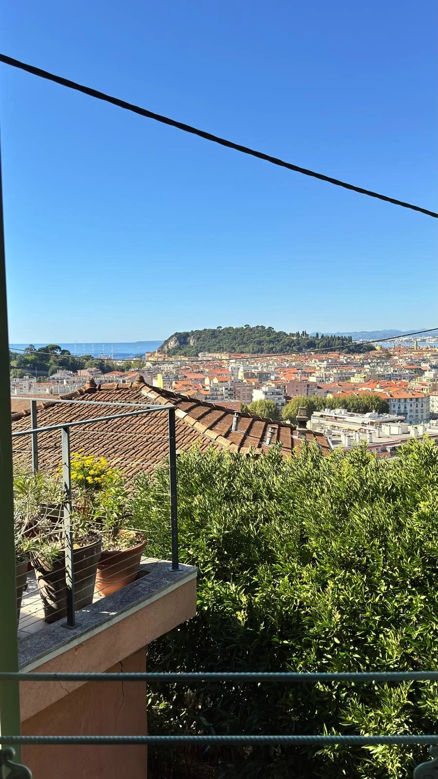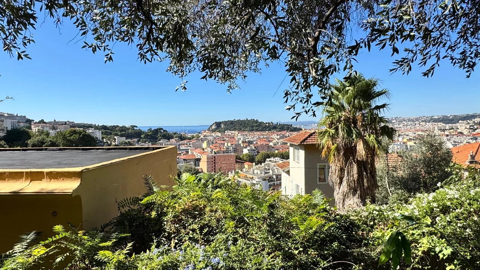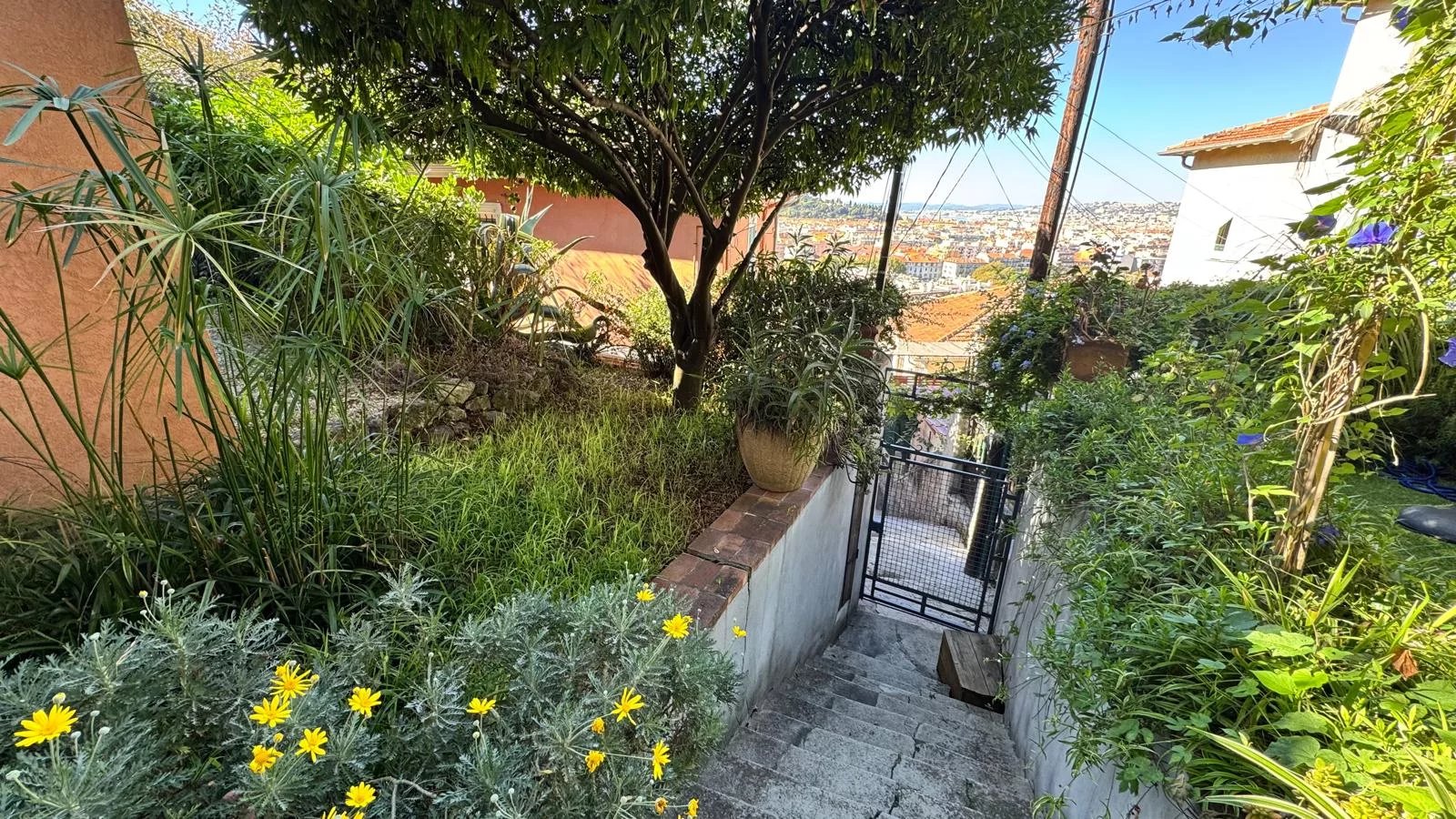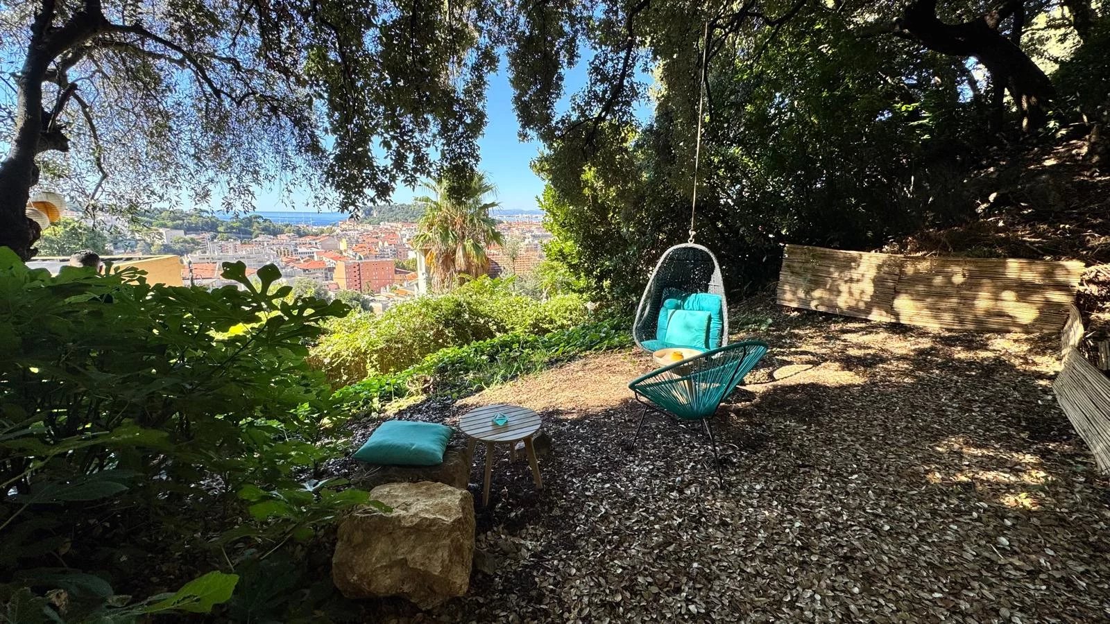 Le tout s’ouvre sur un jardin d’environ 400 m², un véritable havre de paix à l’arrière de la maison, à l’abri des regards et du bruit. On y découvre plusieurs coins détente, des terrasses ombragées et une vue imprenable sur Nice jusqu’à la mer.
