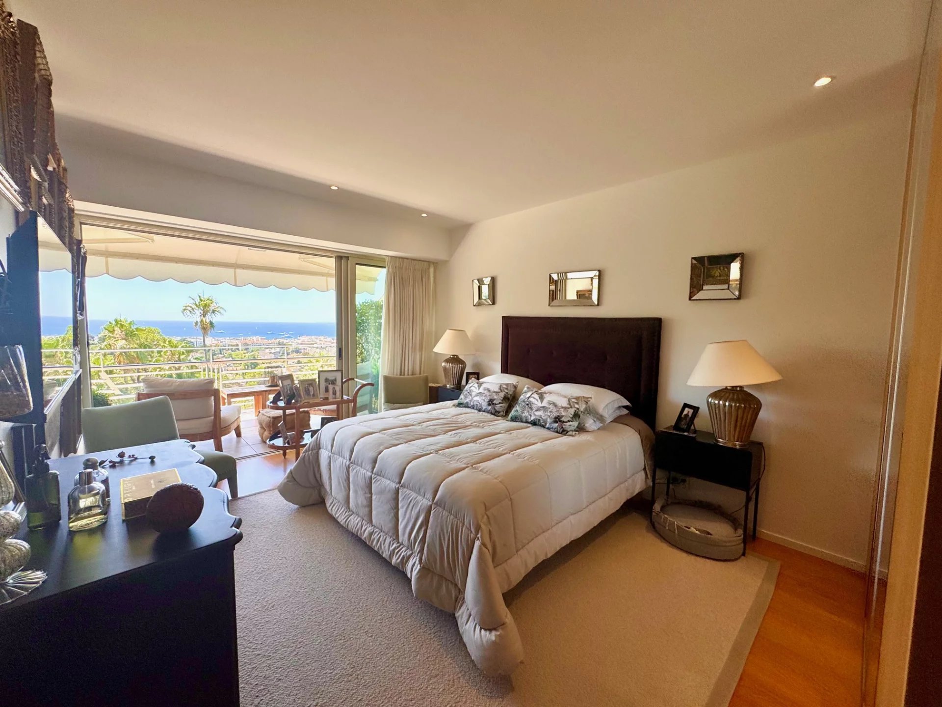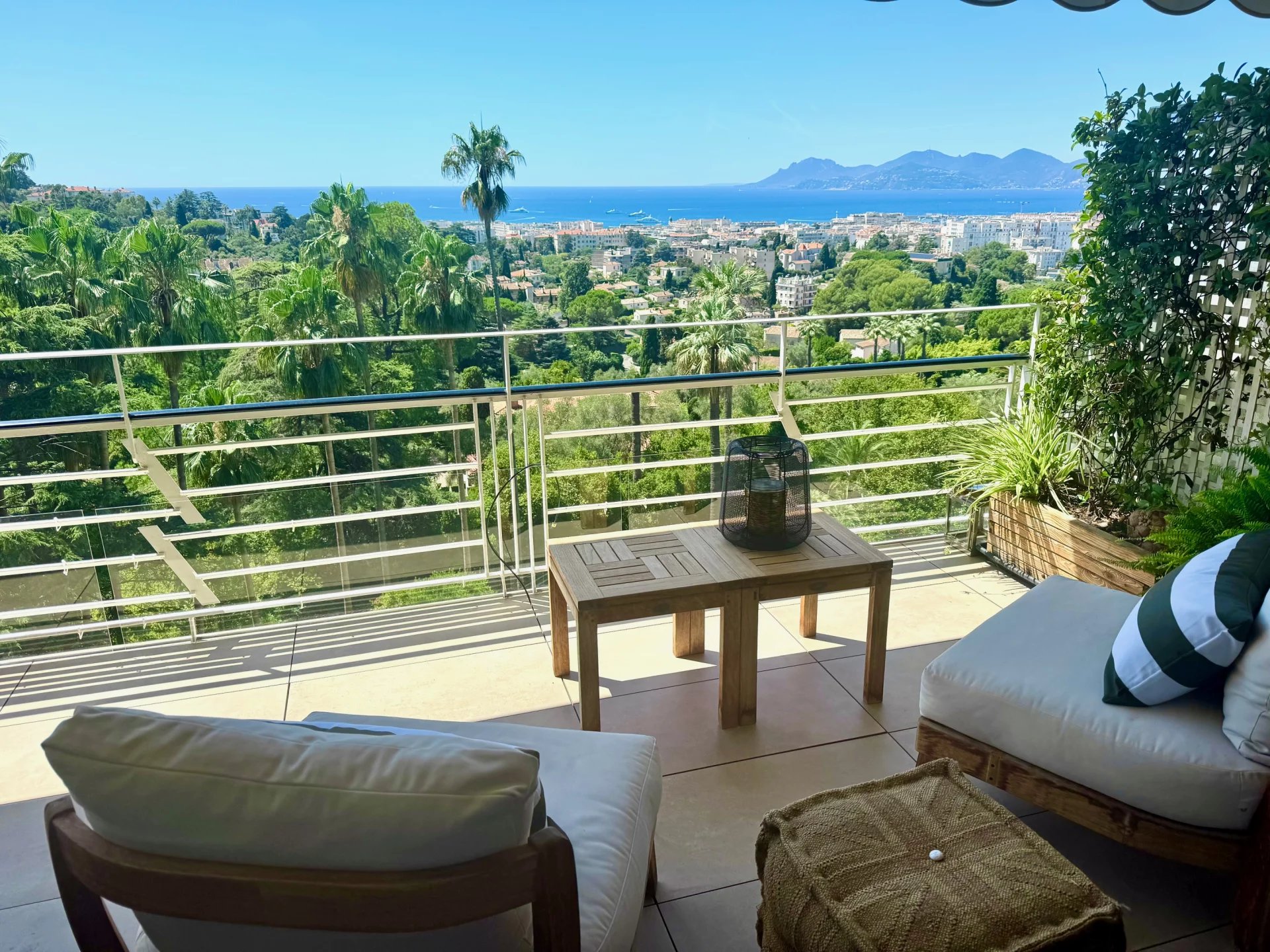 Le séjour baigné de lumière s'ouvre largement avec une baie vitré à galandage sur une grande terrasse offrant une vue mer panoramique .