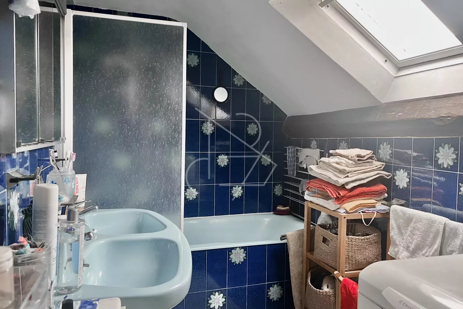 Le bien se compose d'un premier étage avec une entrée et un séjour avec cuisine ouverte. À l'étage supérieur, un palier dessert une salle de bain, un WC séparé, et deux chambres, dont une traversante et d'une belle surface de 24m² au sol.