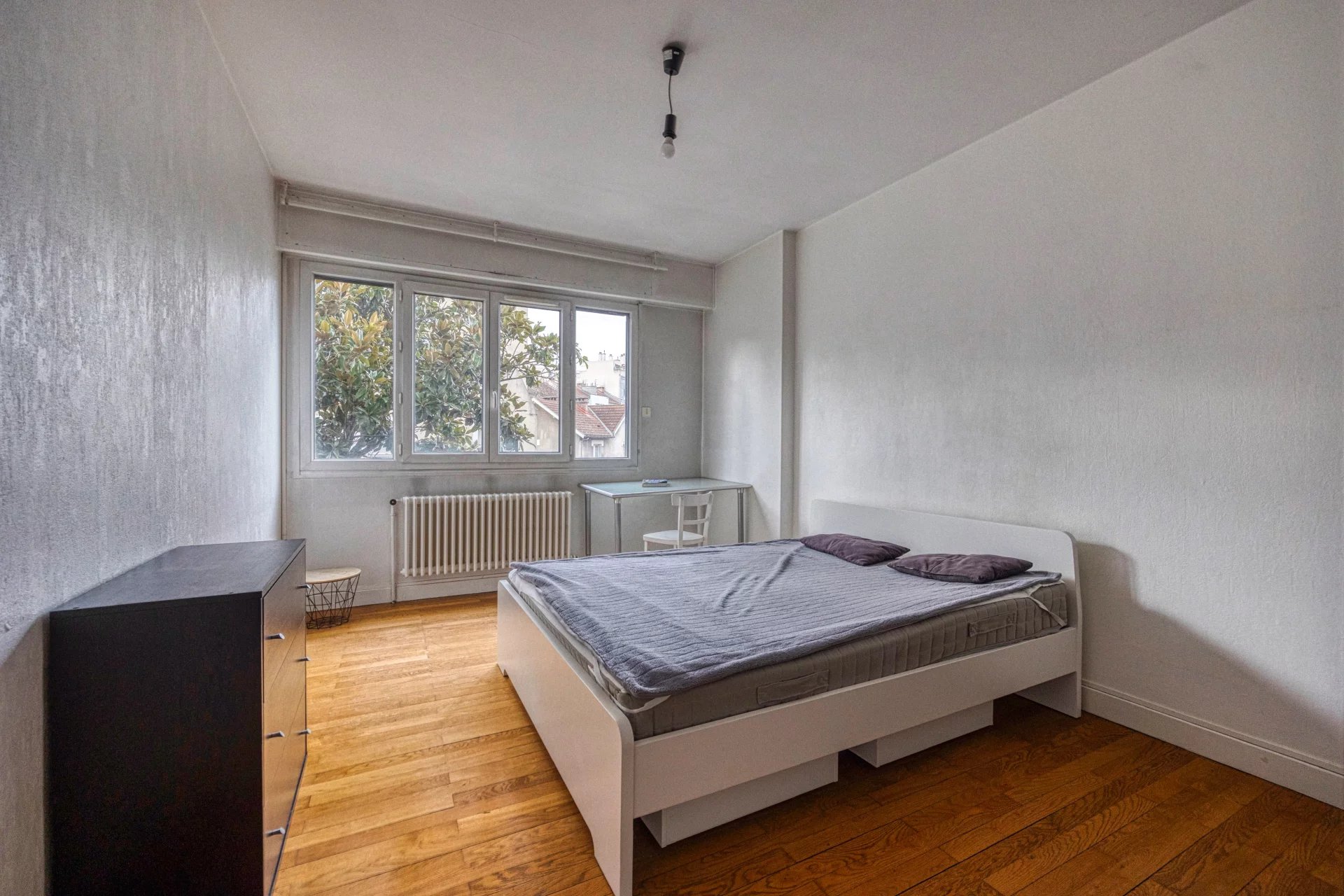 L'entrée centrale dessert tout l'appartement : le séjour exposé plein sud, les 3 chambres (15,60 - 15,50 et 11 m²), la cuisine séparée semi équipée ouvrant sur un balcon face à la Bastille, la salle de douche et les WC indépendants.