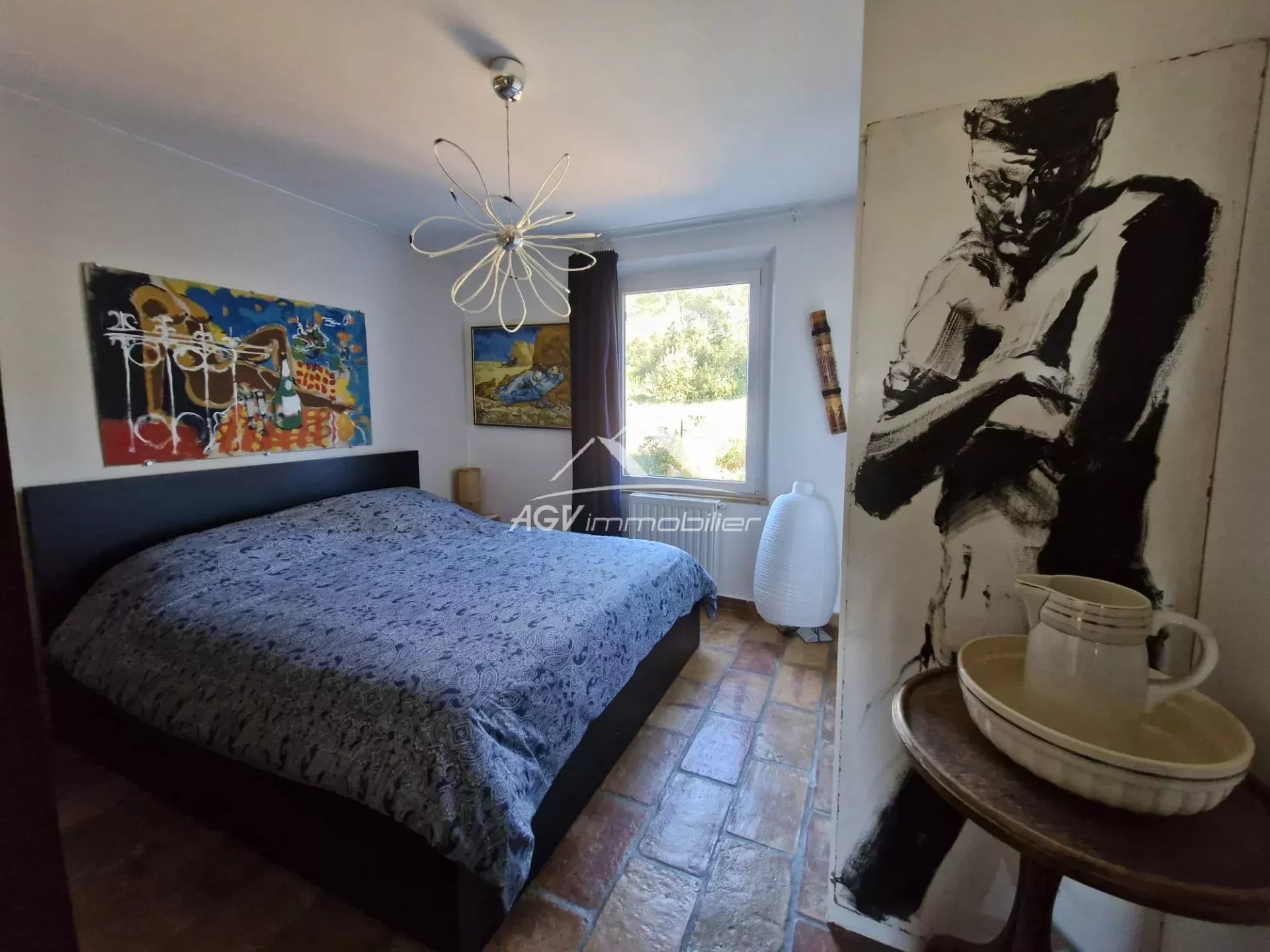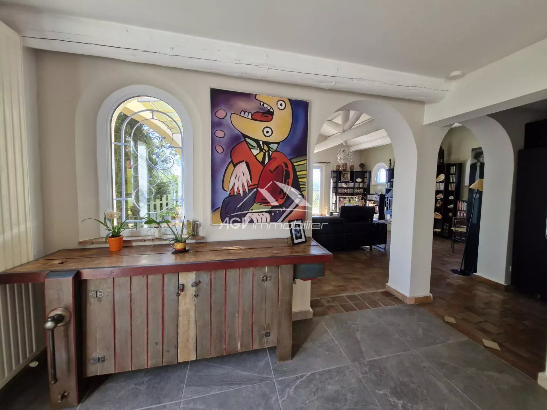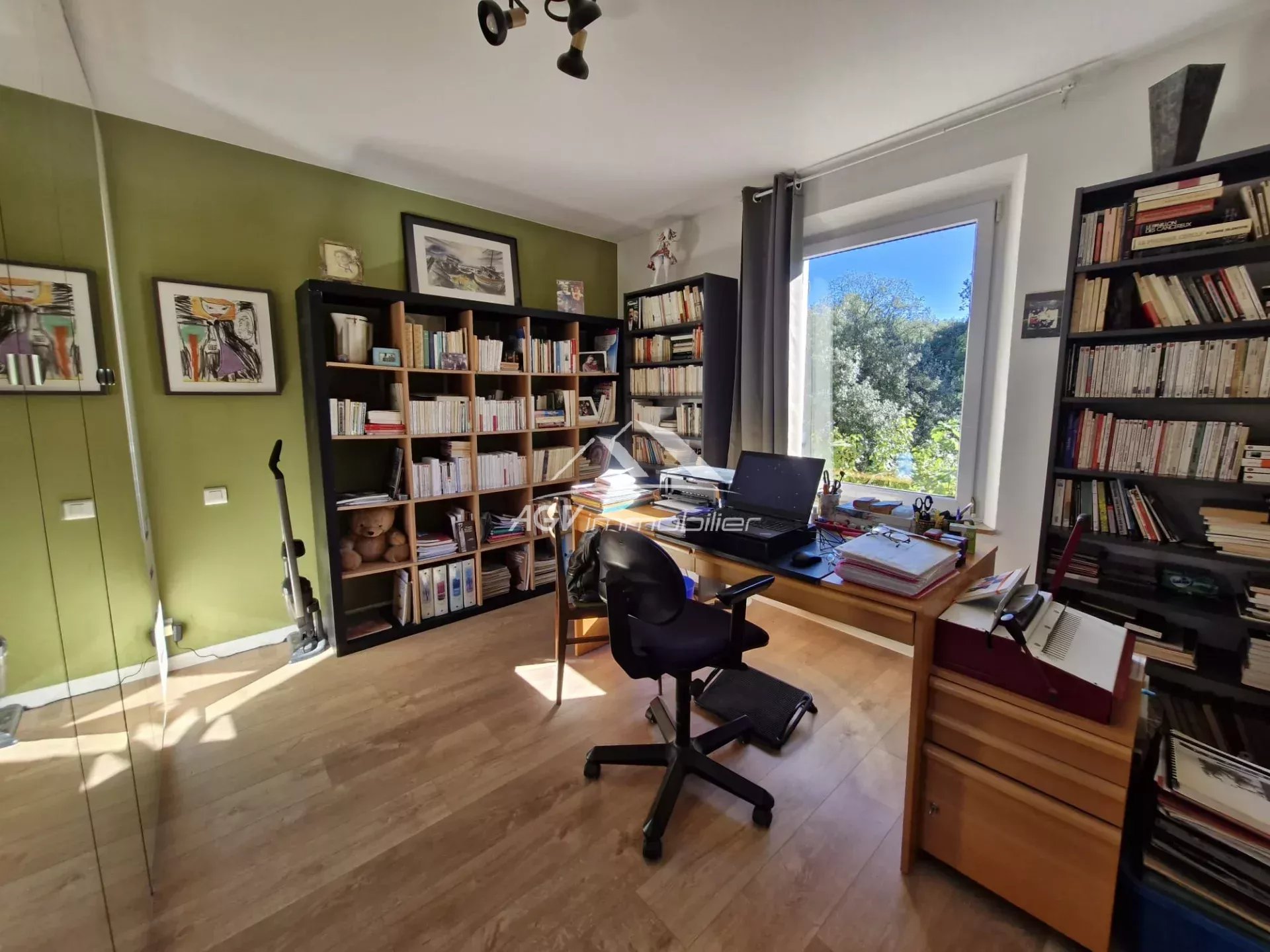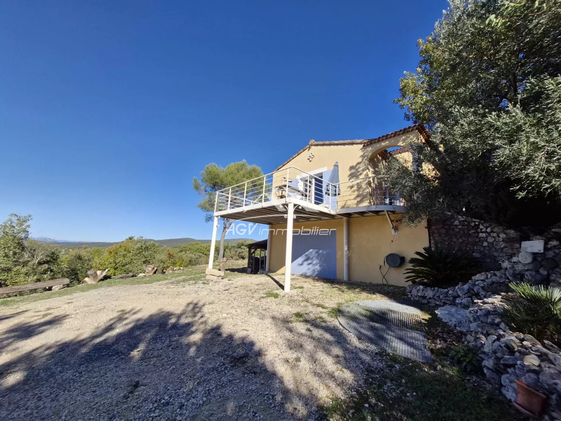 Maison d'environ 130 m² avec vue dominante sur les Cévennes, au calme sur 2436 m² de terrain arboré. Elle se compose en rez-de-chaussée d'une pièce de vie donnant sur deux terrasses , une cuisine équipée, un coin bureau, un toilette et une chambre, l'étage comprend trois chambres et une salle de bain avec toilette. En sous sol un vaste garage.