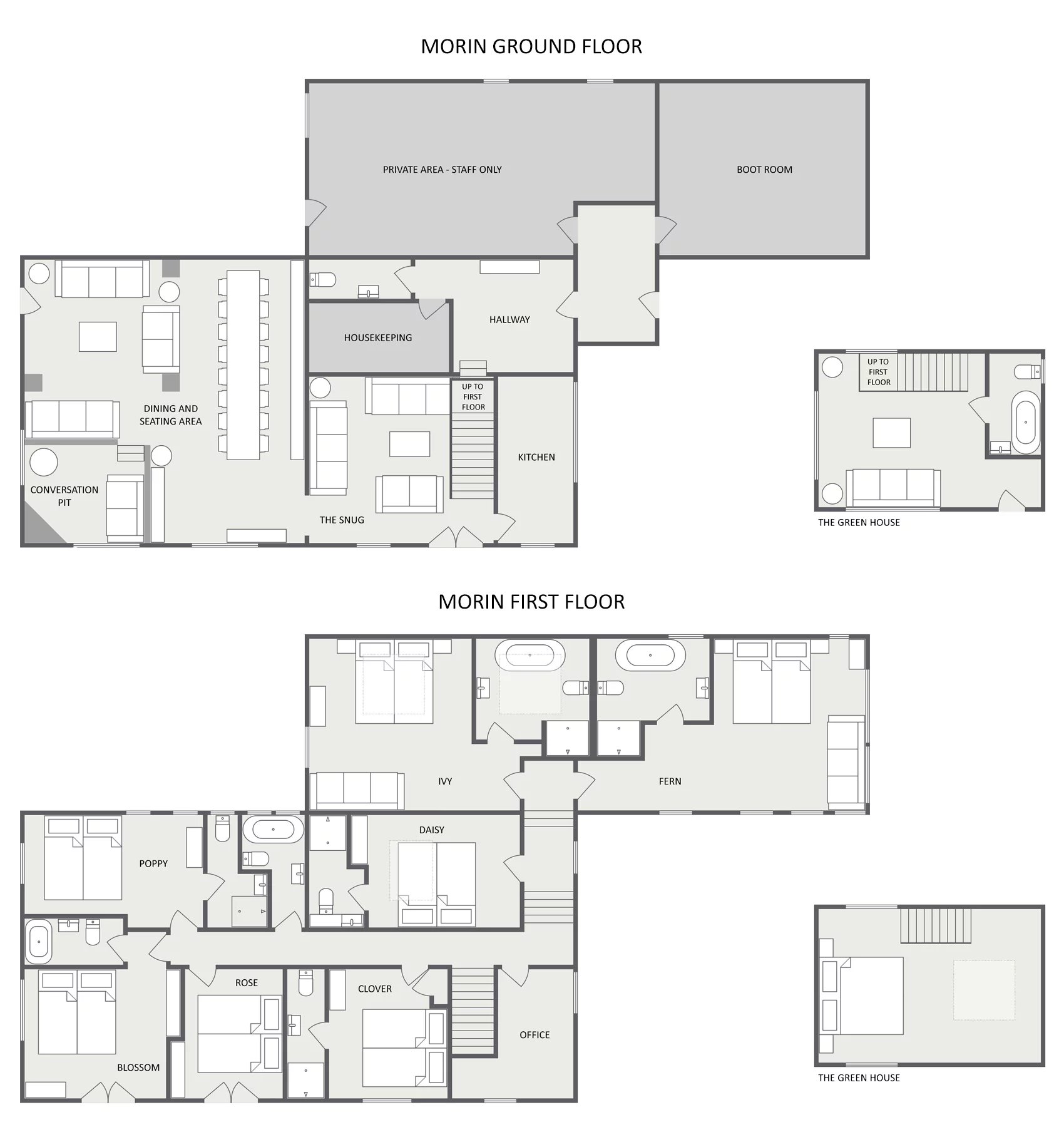 Au premier étage, nous disposons de 4 chambres doubles avec salle de bain ensuite, deux chambres d'enfant avec une grande salle de bain comprenant une baignoire et une douche séparée, une chambre double avec une salle de bain.