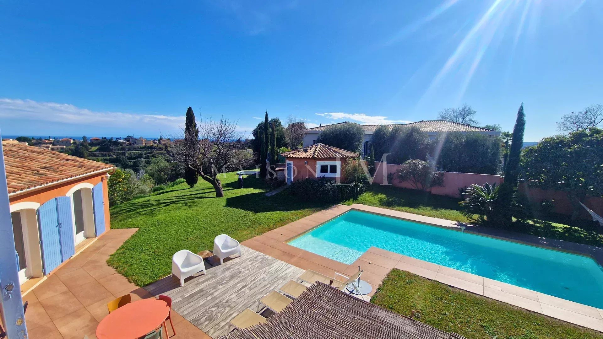 Implantée sur un terrain d'environ 4000 m², cette belle propriété offre une vue dégagée sur les collines environnantes et un ensoleillement optimal grâce à son exposition Sud/Sud-Ouest.