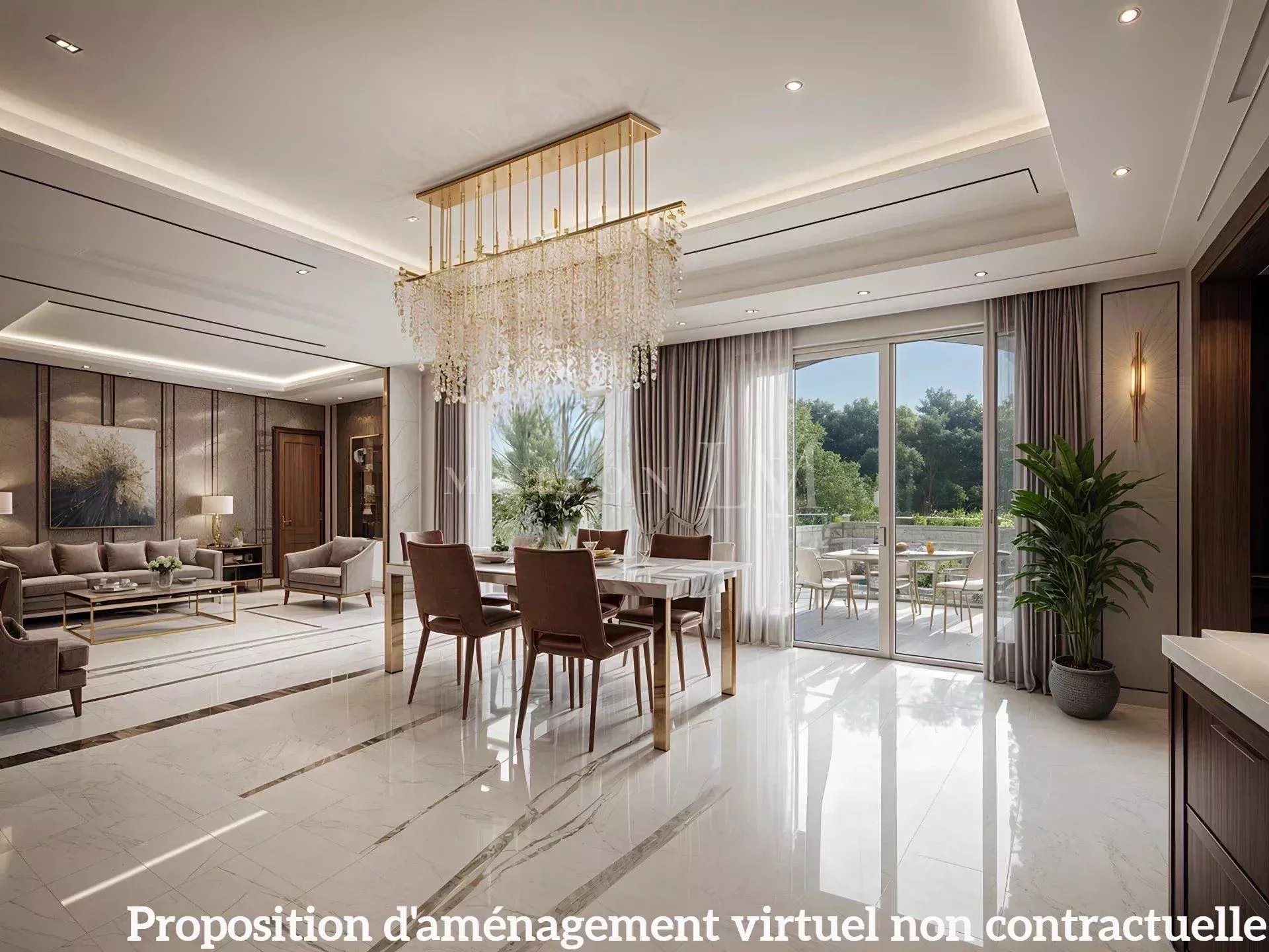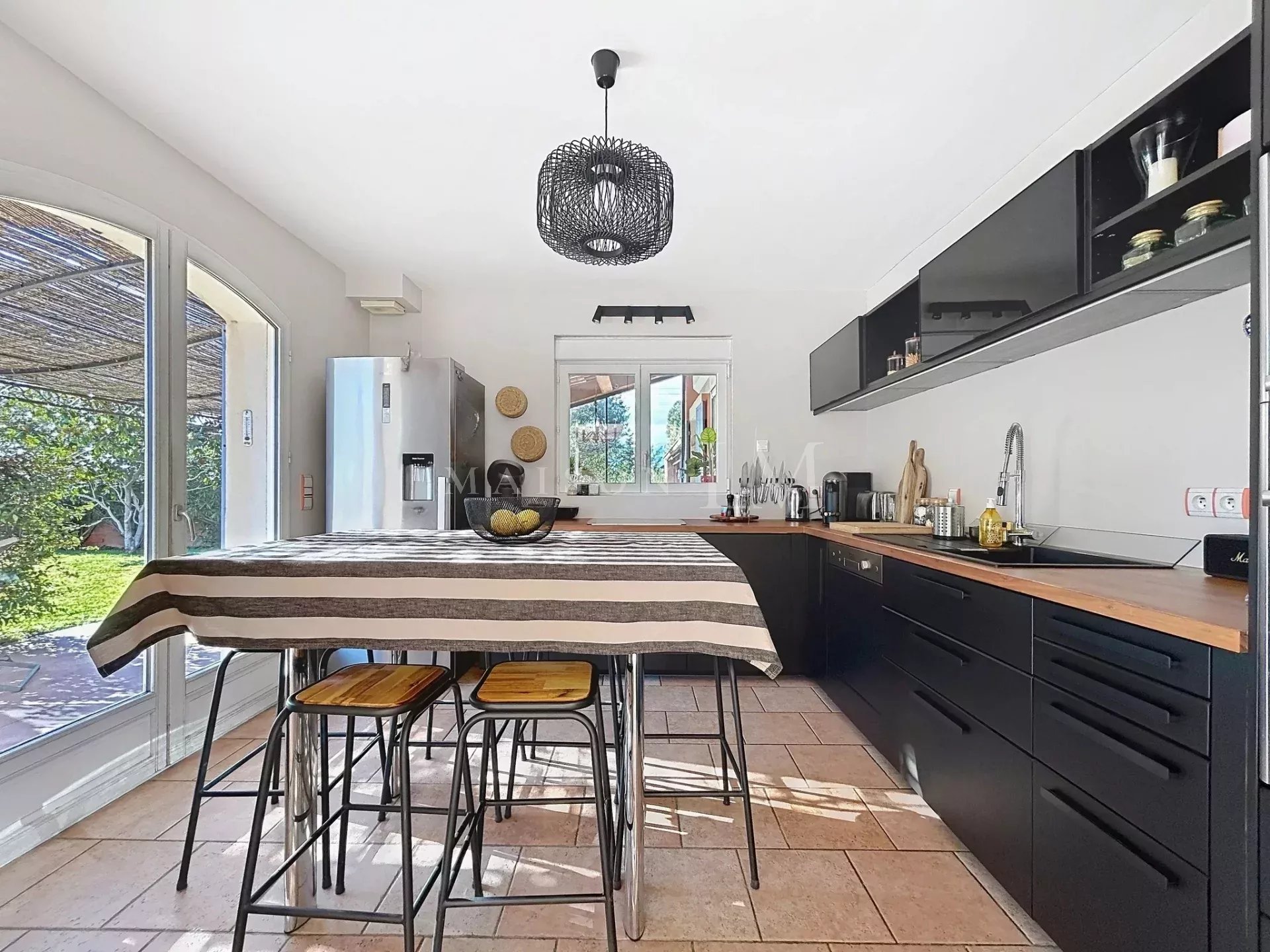 Le rez-de-jardin : Comprend deux chambres de plain-pied avec salles d'eau, un agréable salon avec cheminée, une salle à manger de 65 m², ouvrant sur une terrasse ensoleillée, et une cuisine semi-ouverte équipée.