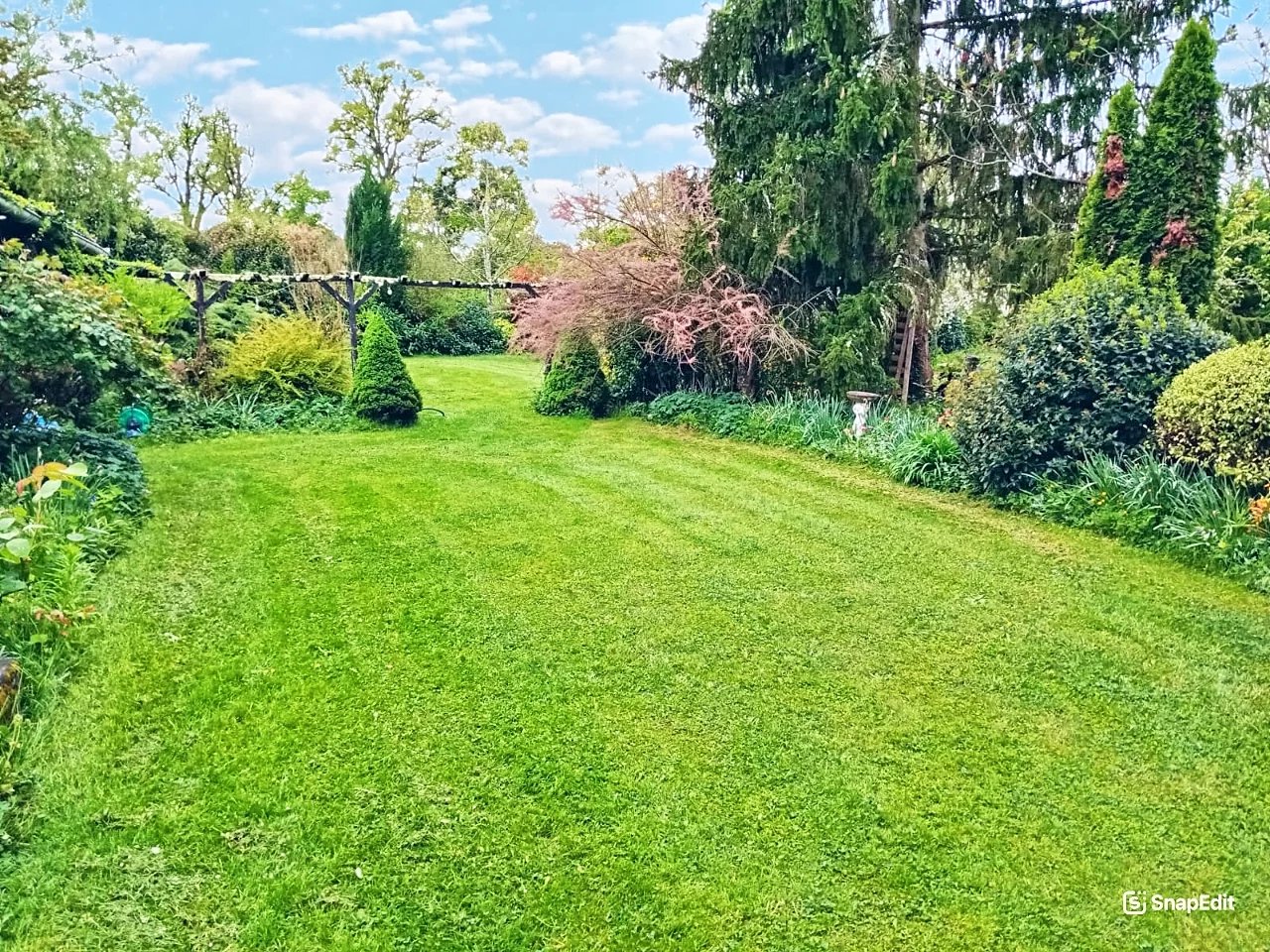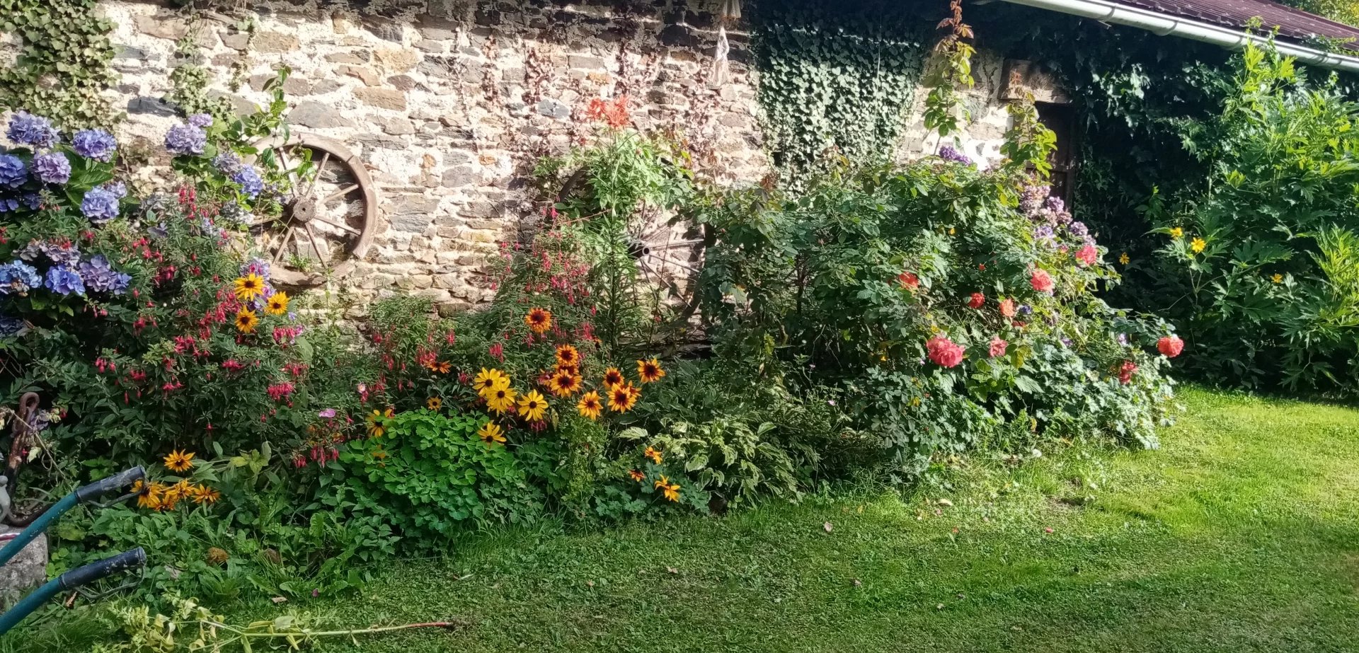 Entièrement clos, le jardin est un vrai cocon de verdure structuré par la pelouse bordée des arbustes et de magnifiques massifs de fleurs. De nombreux fruitiers s'épanouissent à la belle saison. Une serre et un puits apportent un vrai confort.