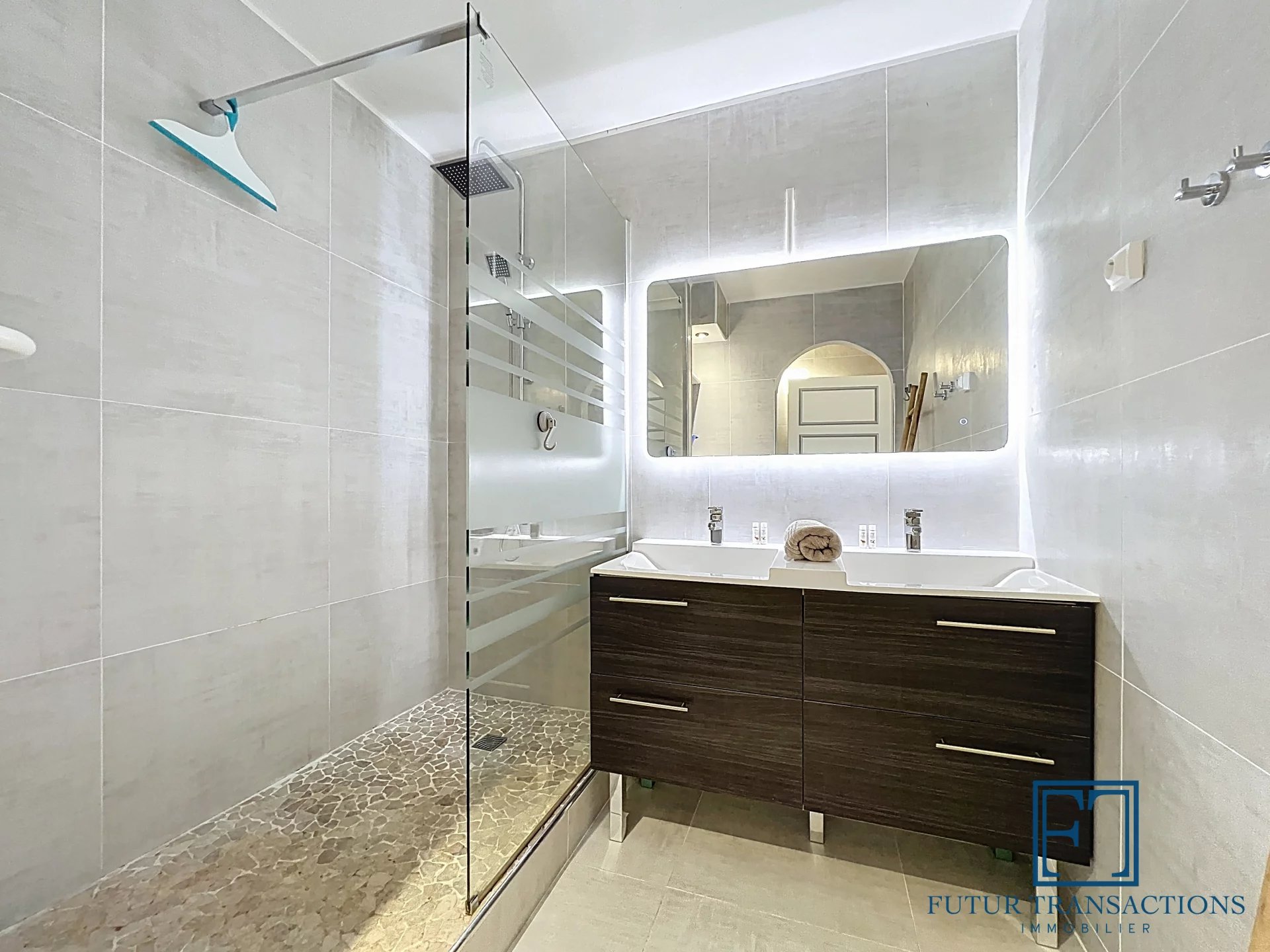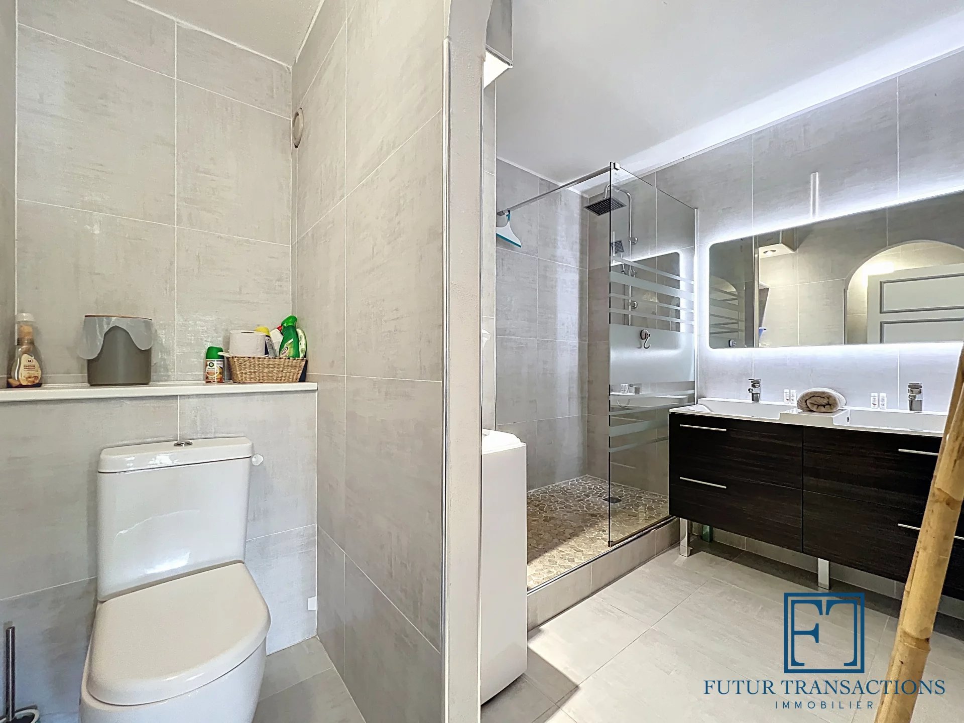 - Salle d’eau moderne avec douche, meuble vasque et lave-linge