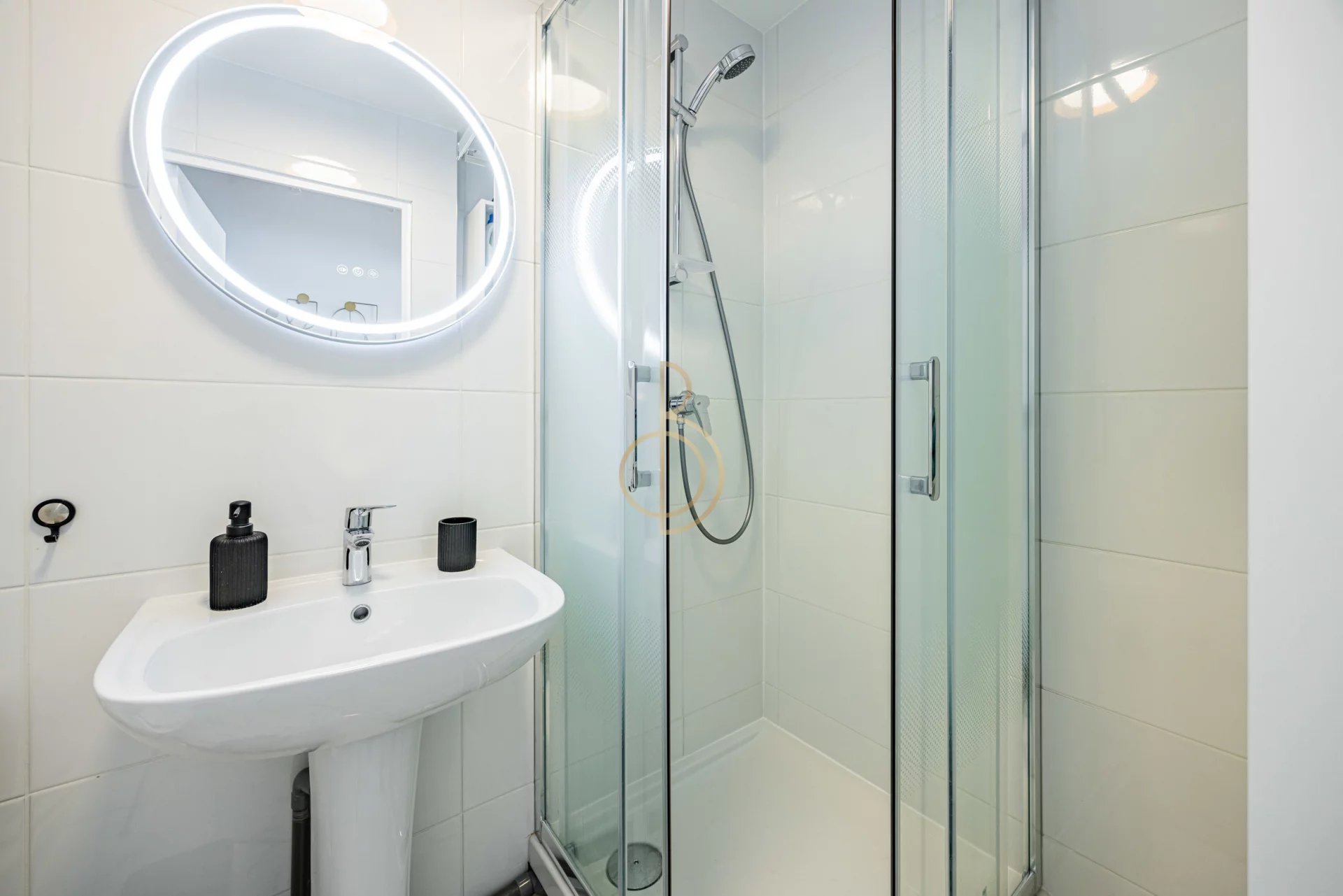Coin cuisine fonctionnel et moderne et équipée, une salle d'eau comprenant une douche, un lavabo et un WC, le tout dans un espace optimisé et contemporain.