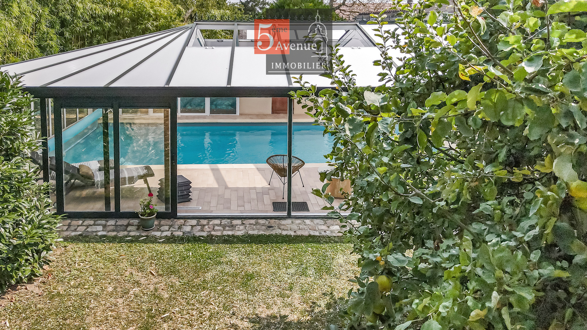 On accède à une vaste piscine intérieure sous véranda, véritable atout bien-être de la maison, accompagnée d'un espace bar.
