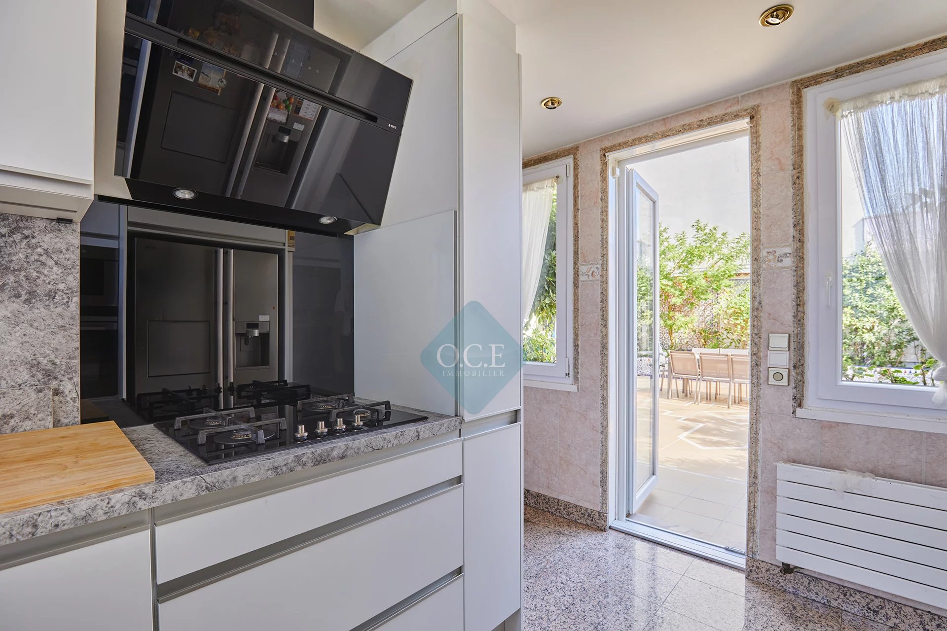 L’espace de vie se compose d’un vaste séjour avec verrière de type industriel, baigné de lumière, et d’une cuisine attenante à la terrasse, idéale pour les repas en extérieur.