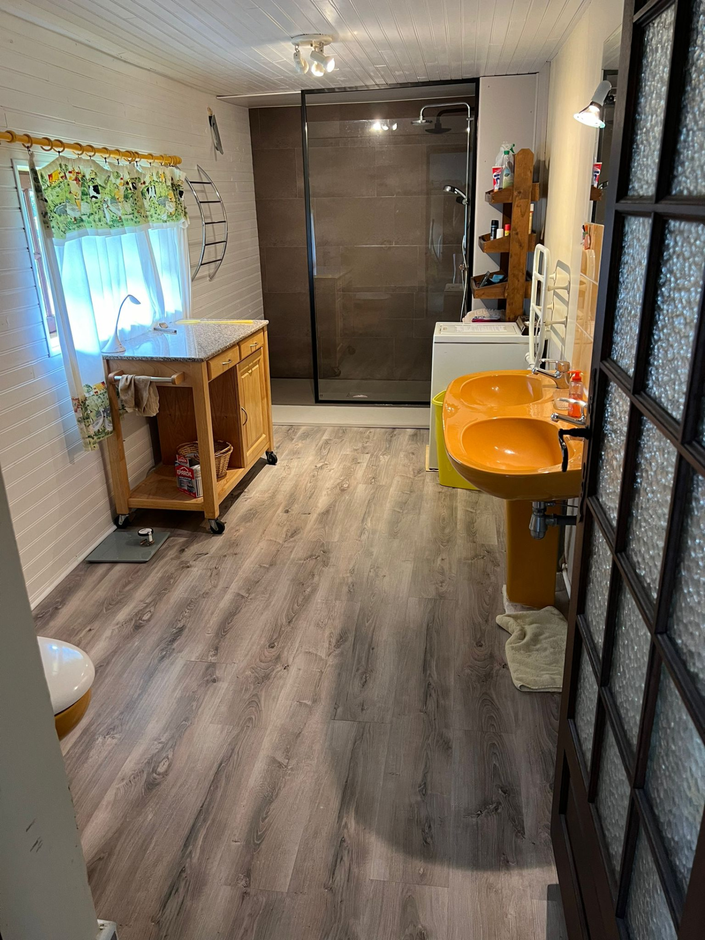 Tout droit, un petit couloir avec des placards mène à la salle d'eau, équipée d'un WC, d'un double vasques, d'une douche à l'italienne et d'un raccordement pour une machine à laver. Ce couloir dispose d'une porte donnant sur l'arrière de la maison et mène à un espace de rangement.