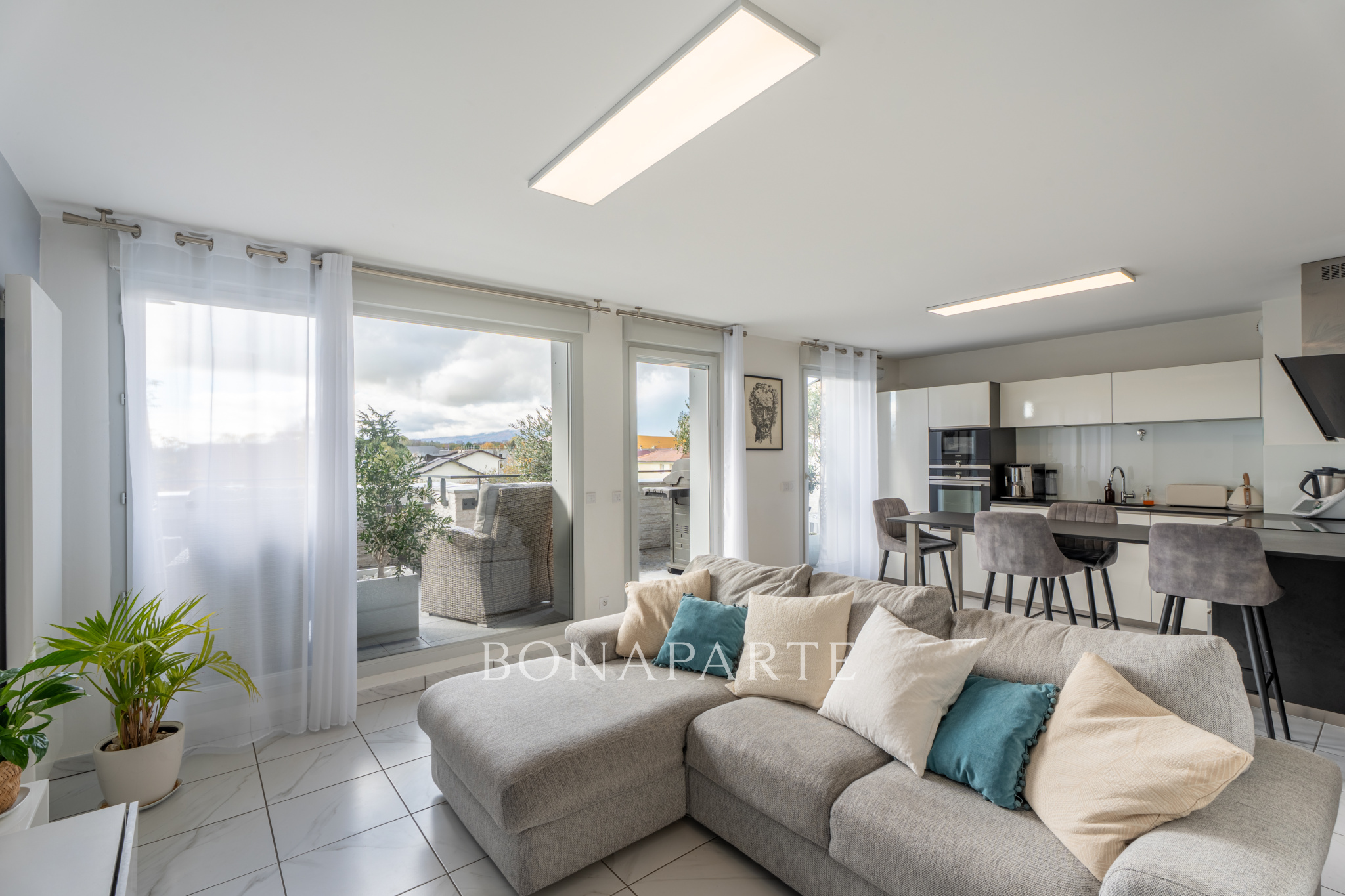 Situé sur la commune de Segny, dans une résidence récente et sécurisée, cet appartement traversant de 89 m2 offre un cadre de vie lumineux et spacieux. Le séjour s'ouvre sur une cuisine entièrement équipée et donne accès à une 1ère grande terrasse coté Ouest, avec une vue dégagée sur le Jura. L'espace nuit se compose de trois belles chambres, dont une suite parentale avec une salle de douche et accès à la 2ème terrasse, coté Est. Une salle de bains moderne, des rangements intégrés et un WC indépendant assurent un confort au quotidien. Le bien dispose d'une cave, d'une place de parking extérieure et d'un grand garage double de 40m2 proposé en supplément.