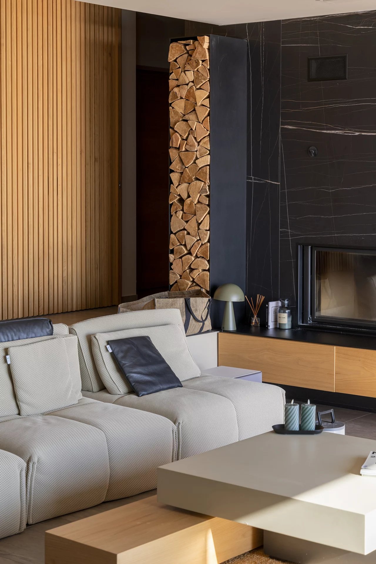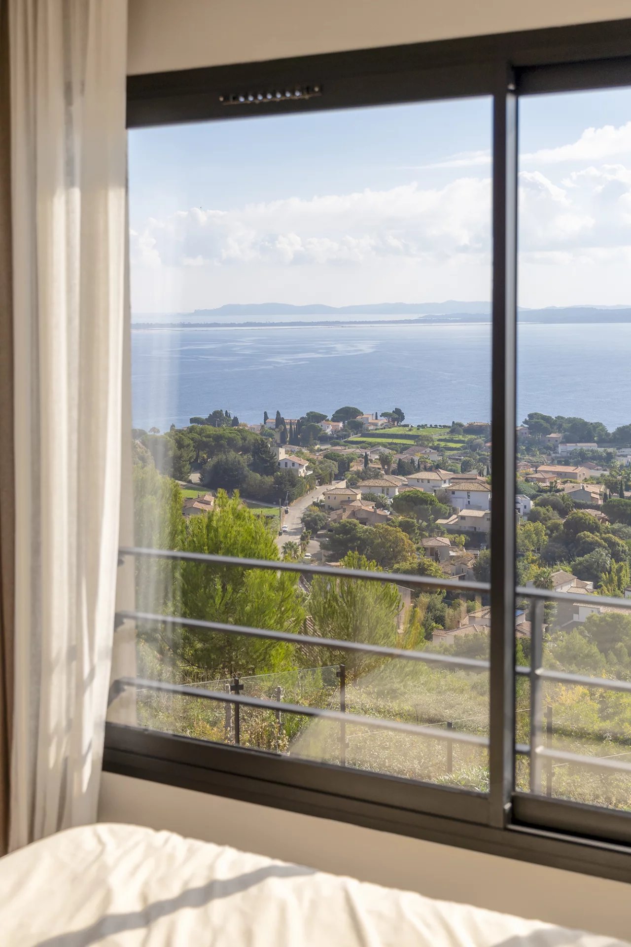 Dès l’entrée, la villa dévoile des volumes généreux : un vaste séjour avec cheminée baigné de lumière grâce à de larges baies vitrées qui ouvrent la perspective sur une mer spectaculaire. L’atmosphère y est à la fois raffinée, épurée et résolument tournée vers l’extérieur.