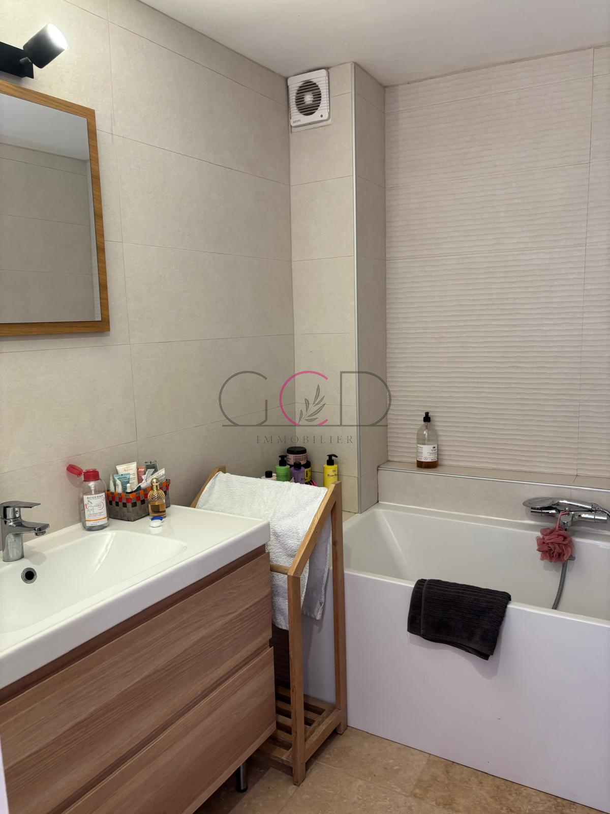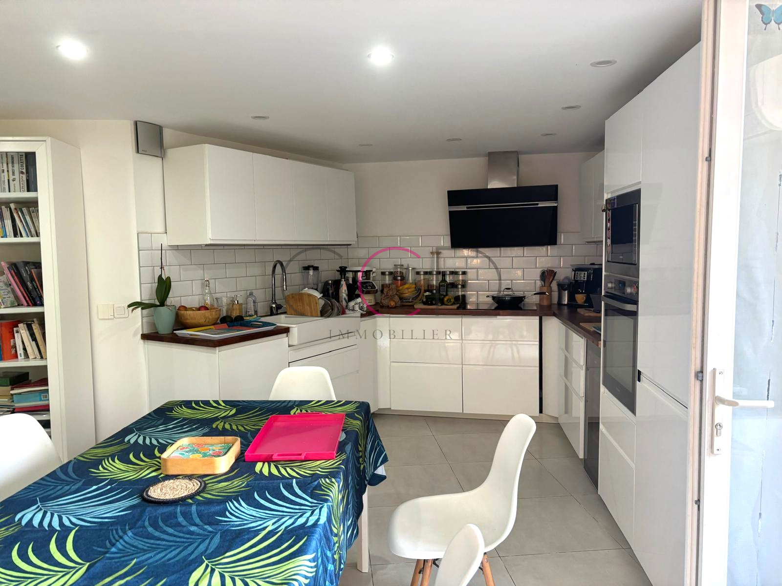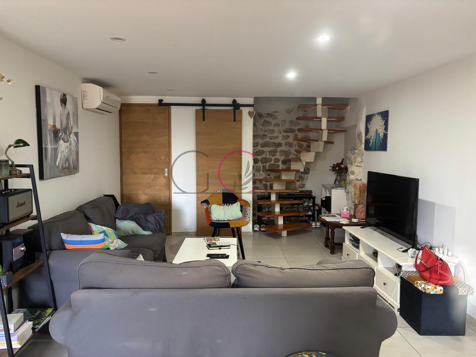 Ce duplex T3 de 99m2 possède une pièce de vie d'environ 43m2 avec cuisine ouverte très récente et complète ouvrant sur une terrasse et un jardinet, ainsi qu'un WC.