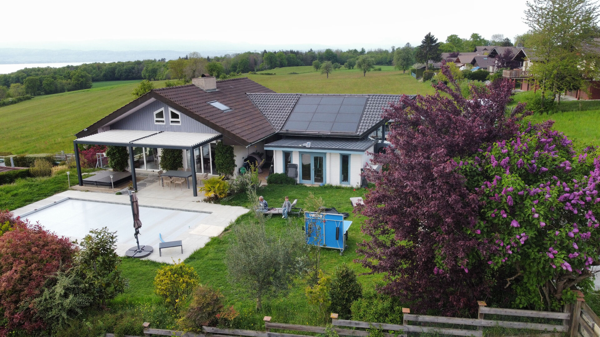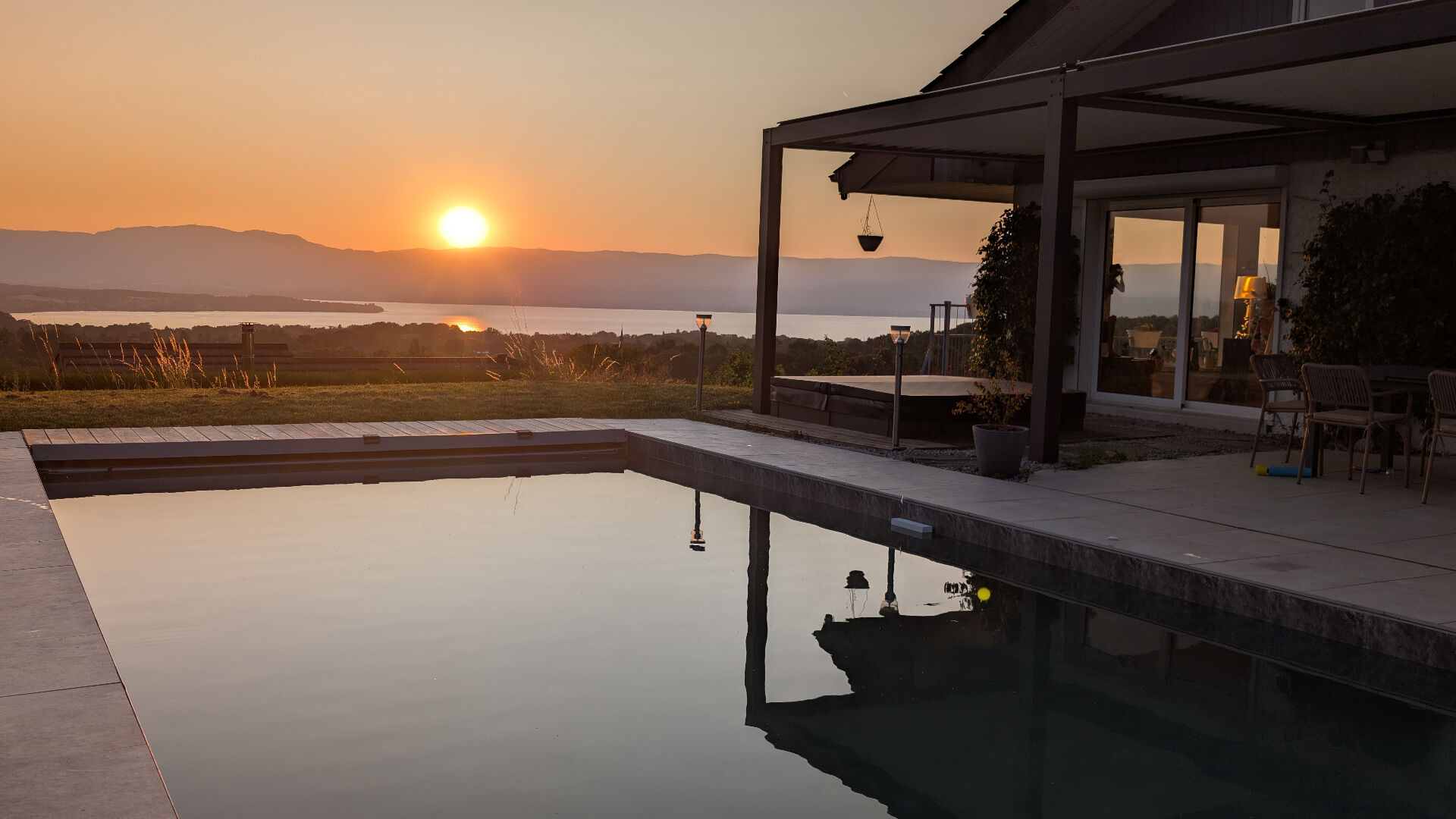A vendre. Maison d'architecte avec vue panoramique sur le lac Léman ! Rare sur le marché, cette villa d'architecte d'environ 170 m², entièrement rénovée, se distingue par son design contemporain, son confort et sa vue imprenable à 180° sur le Lac Léman et la campagne environnante. La vaste pièce de vie de près de 65 m² est baignée de lumière grâce à ses baies vitrées permettant de savourer une vue imprenable sur le lac en toute saison. On y profite d'une cheminée chaleureuse qui renforce l'atmosphère conviviale des lieux. Le tout s'ouvre sur une terrasse où détente et plaisir sont à l'honneur. L'étage est idéalement dédié au domaine parental avec une suite comprenant salle de bains, mezzanine et bureau. Au quotidien, l'intimité et le confort sont assurés. Le rez inférieur accueille quatre chambres spacieuses, dont deux équipées de leur propre salle de douche. La villa bénéficie d'équipements modernes et économes grâce à ses panneaux solaires. Elle s'inscrit dans une démarche de confort durable. Pensée pour le bien-être, la propriété propose un jacuzzi sous pergola sur la terrasse, un espace dédié au sauna ainsi qu'une piscine chauffée et traitée au sel, avec vue plongeante sur le lac. Le terrain est joliment arboré, véritable cocon de nature. Des dépendances complètent ce bien : deux carports pour stationner en toute sérénité, une buanderie, un atelier ainsi qu'une cave pour un espace de rangement optimal. Un lieu de vie unique, harmonieux et privilégié, parfait pour votre famille où chaque détail a été pensé pour savourer l'instant. Contactez-nous dès maintenant pour une visite ! EXCLUSIVITE RSAC 528.304.900