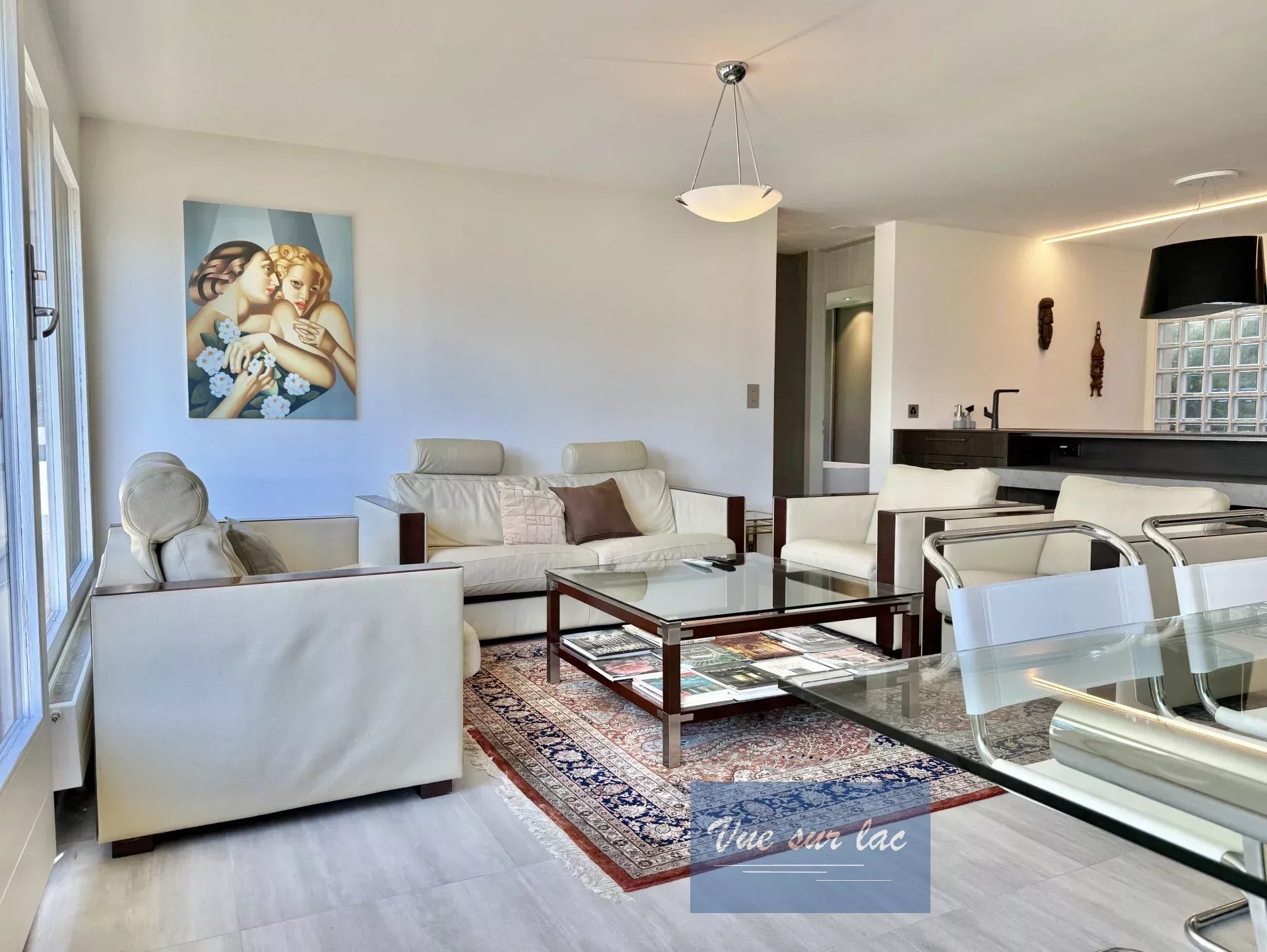 - Le séjour/salle à manger profite d'un accès direct à la terrasse panoramique et la magnifique cuisine moderne et luxueuse est intégrée dans cet espace pour recevoir vos invités dans un cadre convivial et élégant. Les grandes baies vitrées du séjour illuminent l’intérieur tout en offrant une vue magnifique sur la nature et le lac.