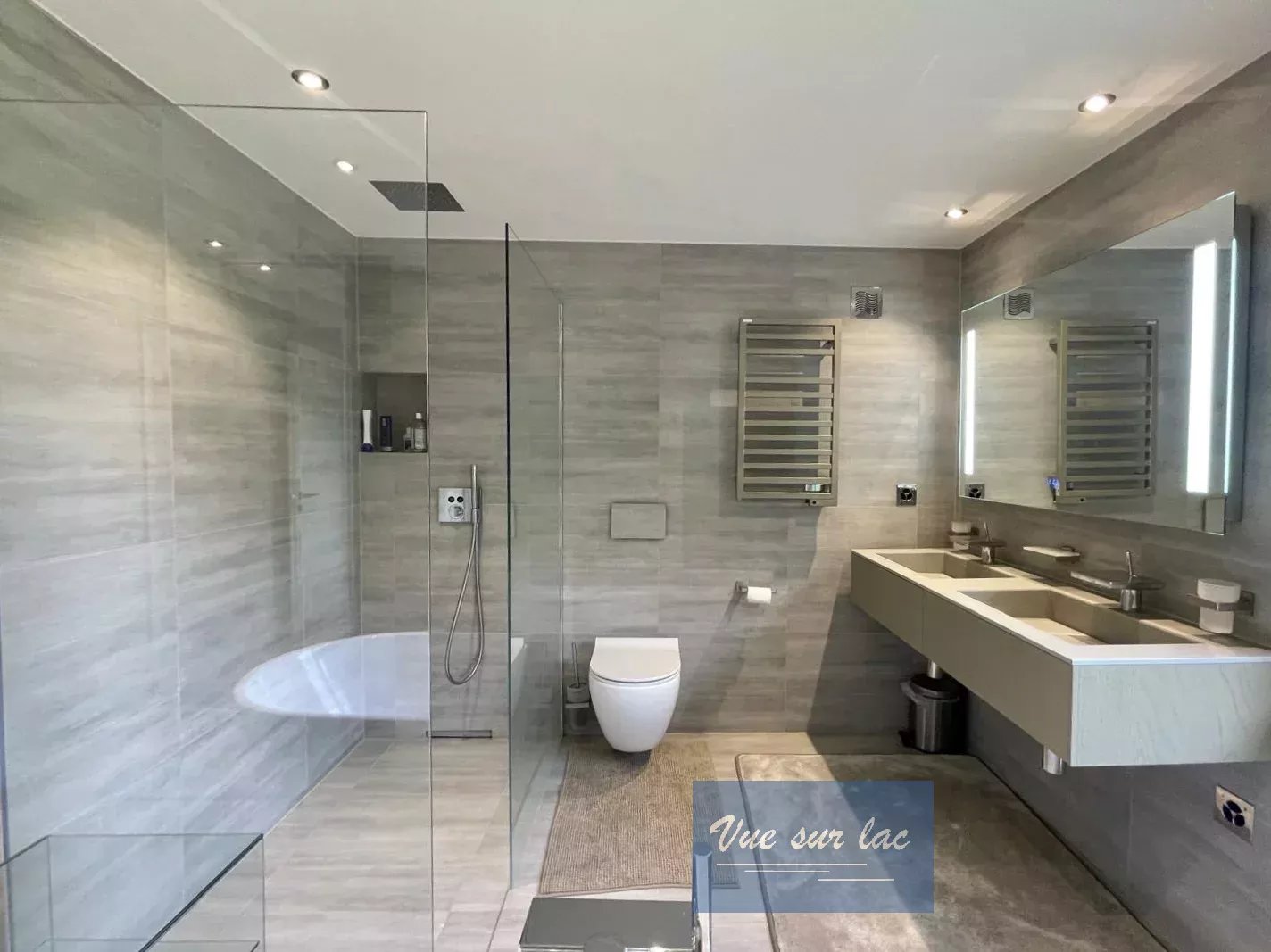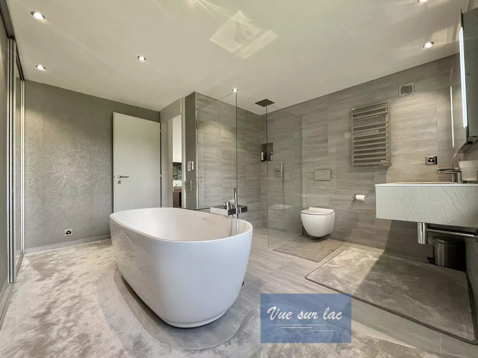 - Elle est complétée par une très grande et splendide salle de bains indépendant et totalement équipée d'une grande baignoire au centre de la pièce, ainsi que d'une douche à l'italienne, une double vasque et de nombreux rangements très discrets.