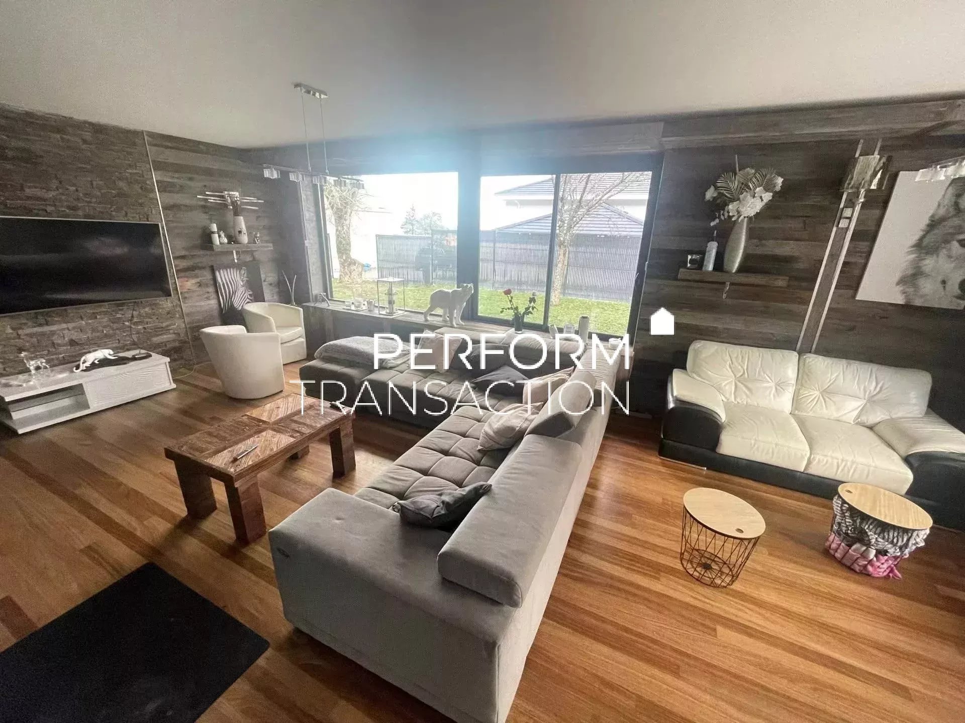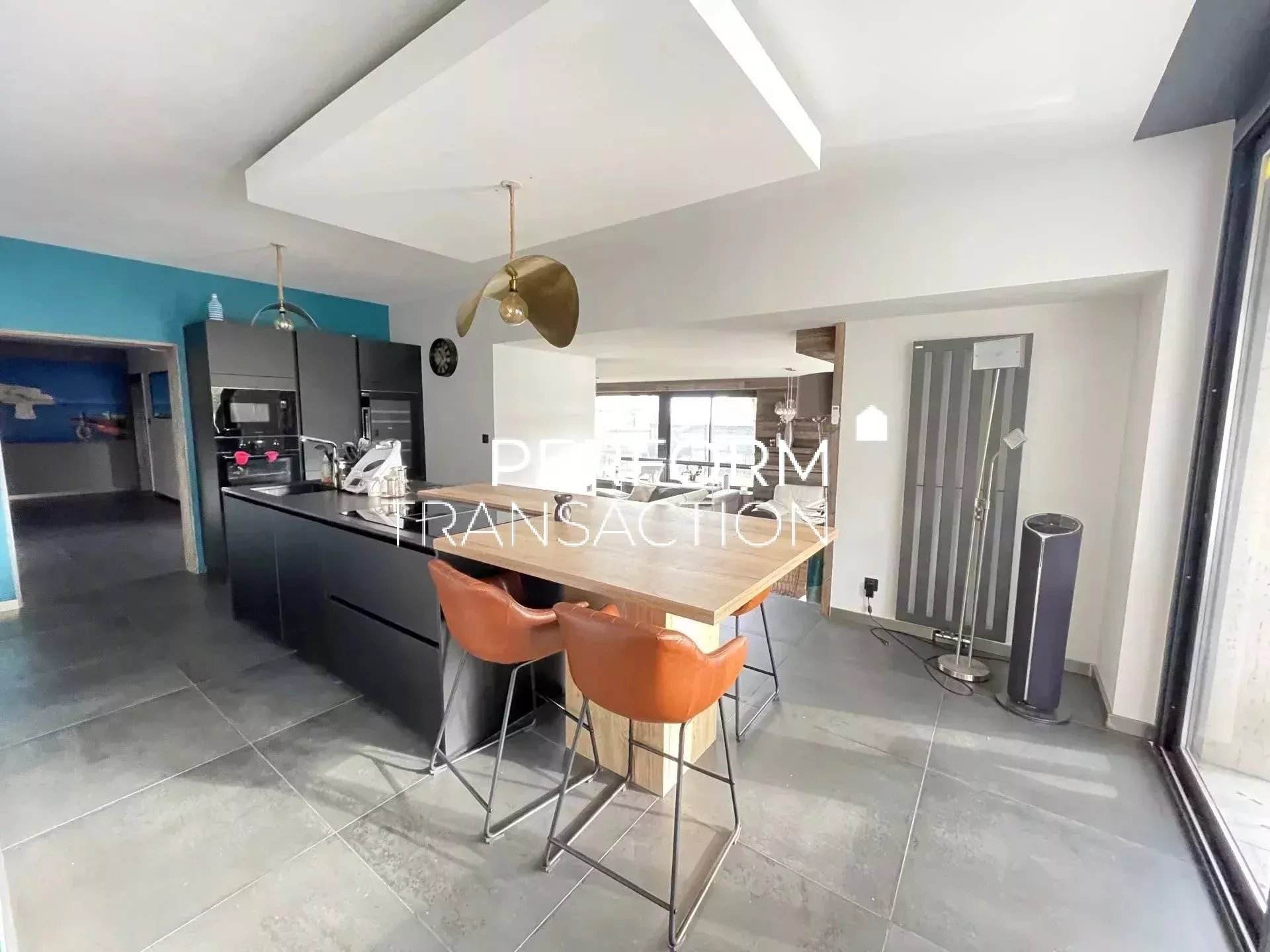 Très belle maison d'architecte de 190m2 de plain pied, 5 P+C, composée d'un espace de vie remarquable avec une grande cheminée, une cuisine ouverte équipée avec une arrière cuisine. Deux chambres + deux suites parentale. Une pergola bioclimatique. Un sous-sol complet avec une cave à vins. Chauffage fioul + électrique. Avec un murs mitoyen sans gêne. Abris deux voitures. Le tout sur un terrain de 1600m2 avec piscine. Dans un agrèable lotissement. Perform Transaction Fabien Andréoléty 06 23 21 25 01