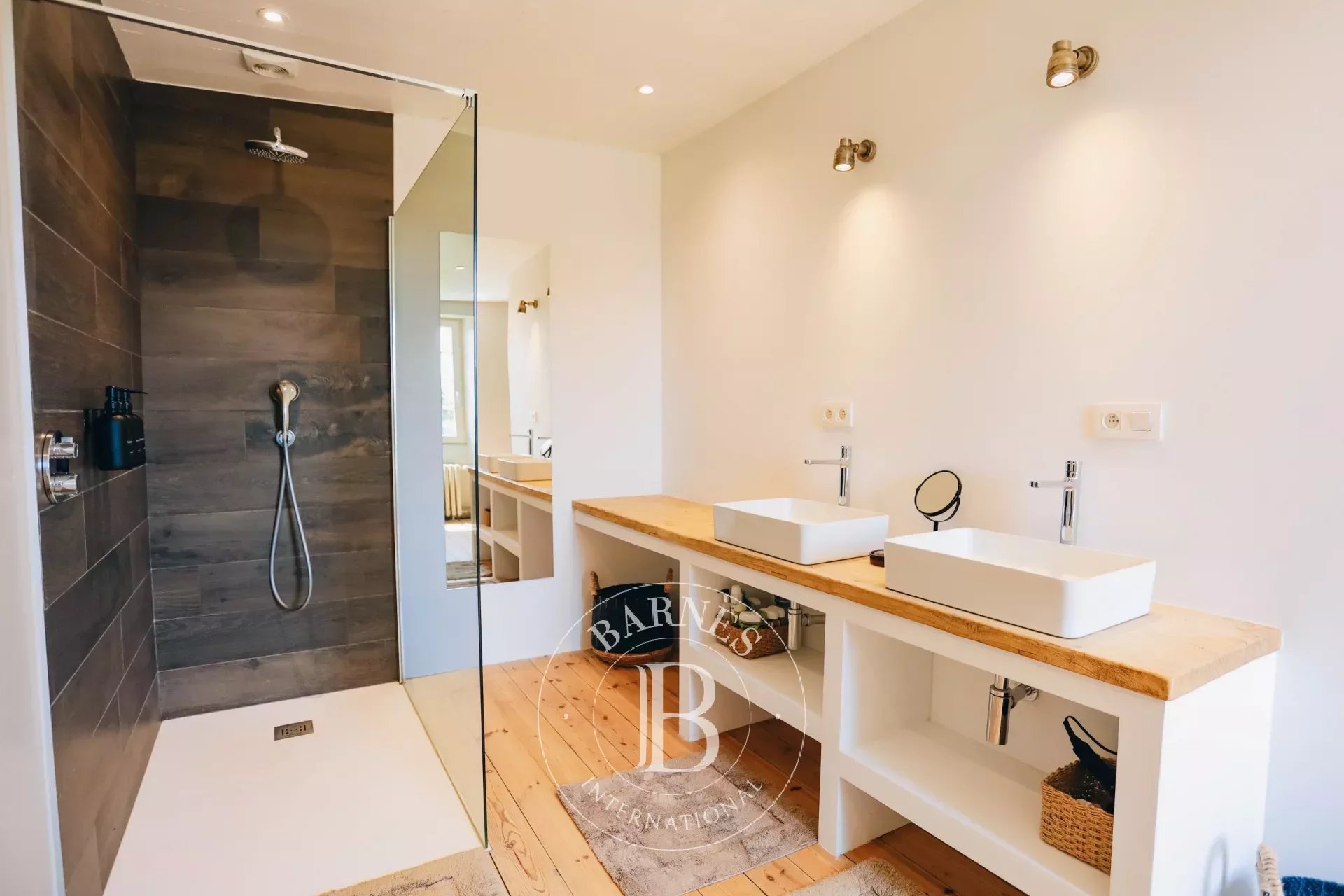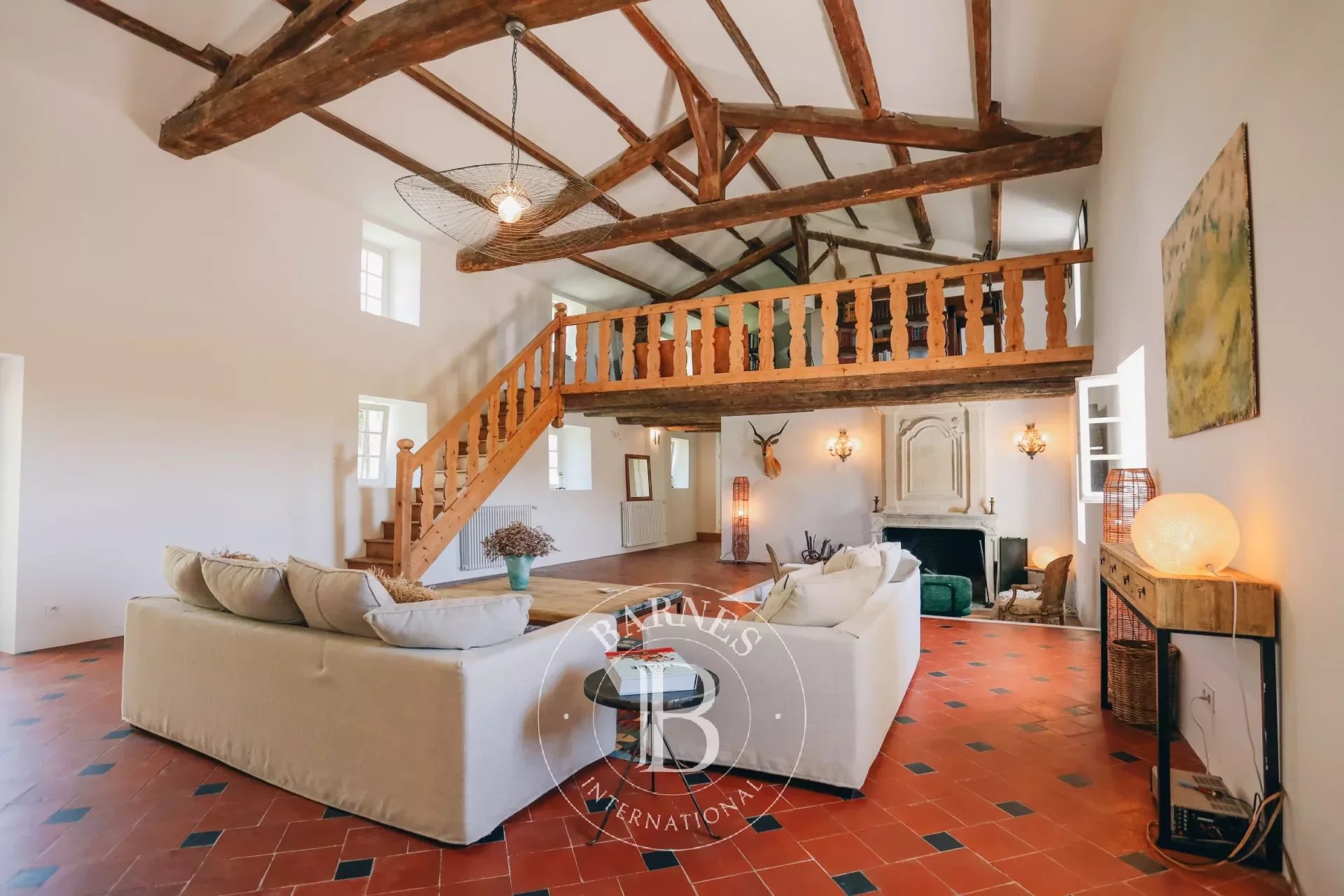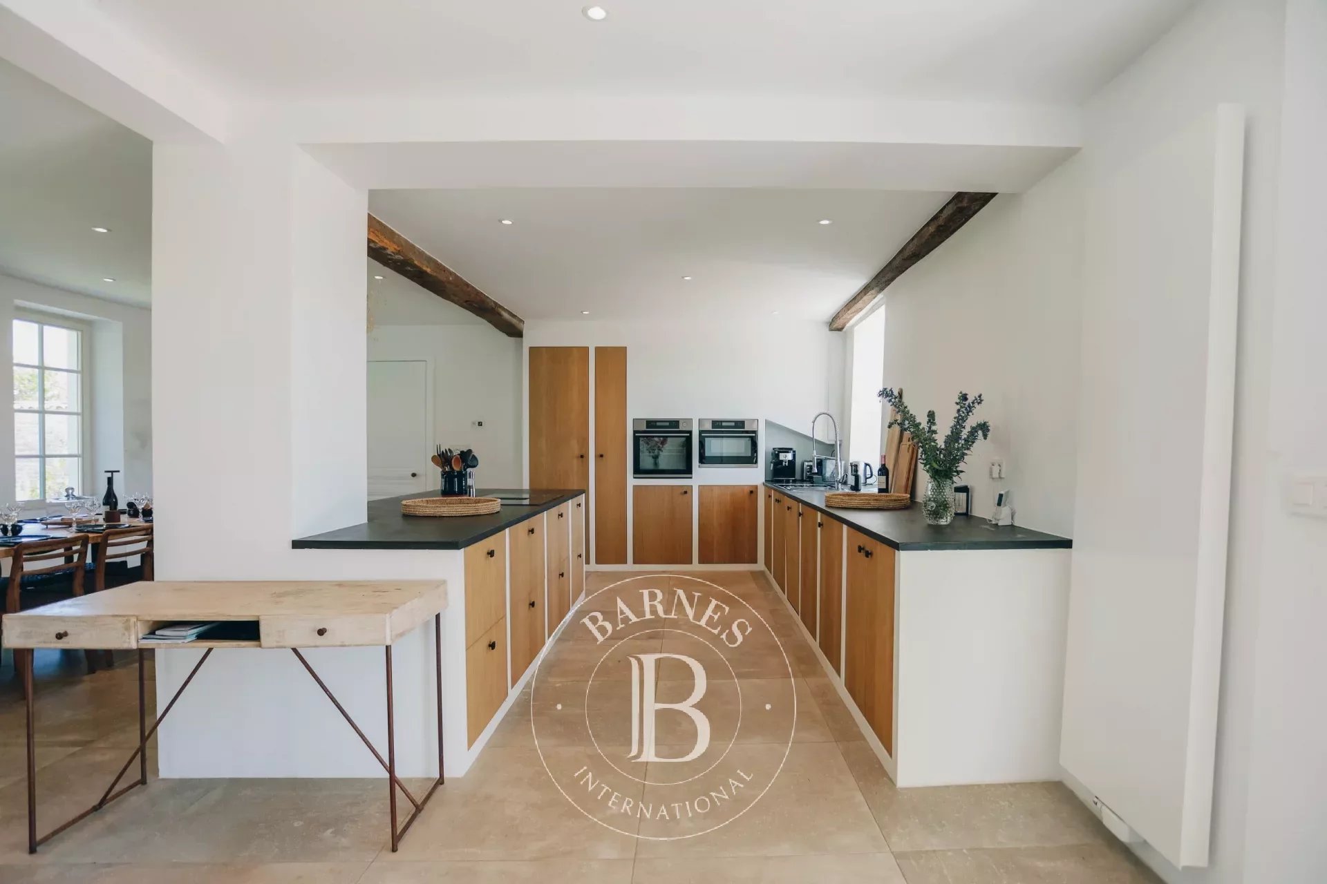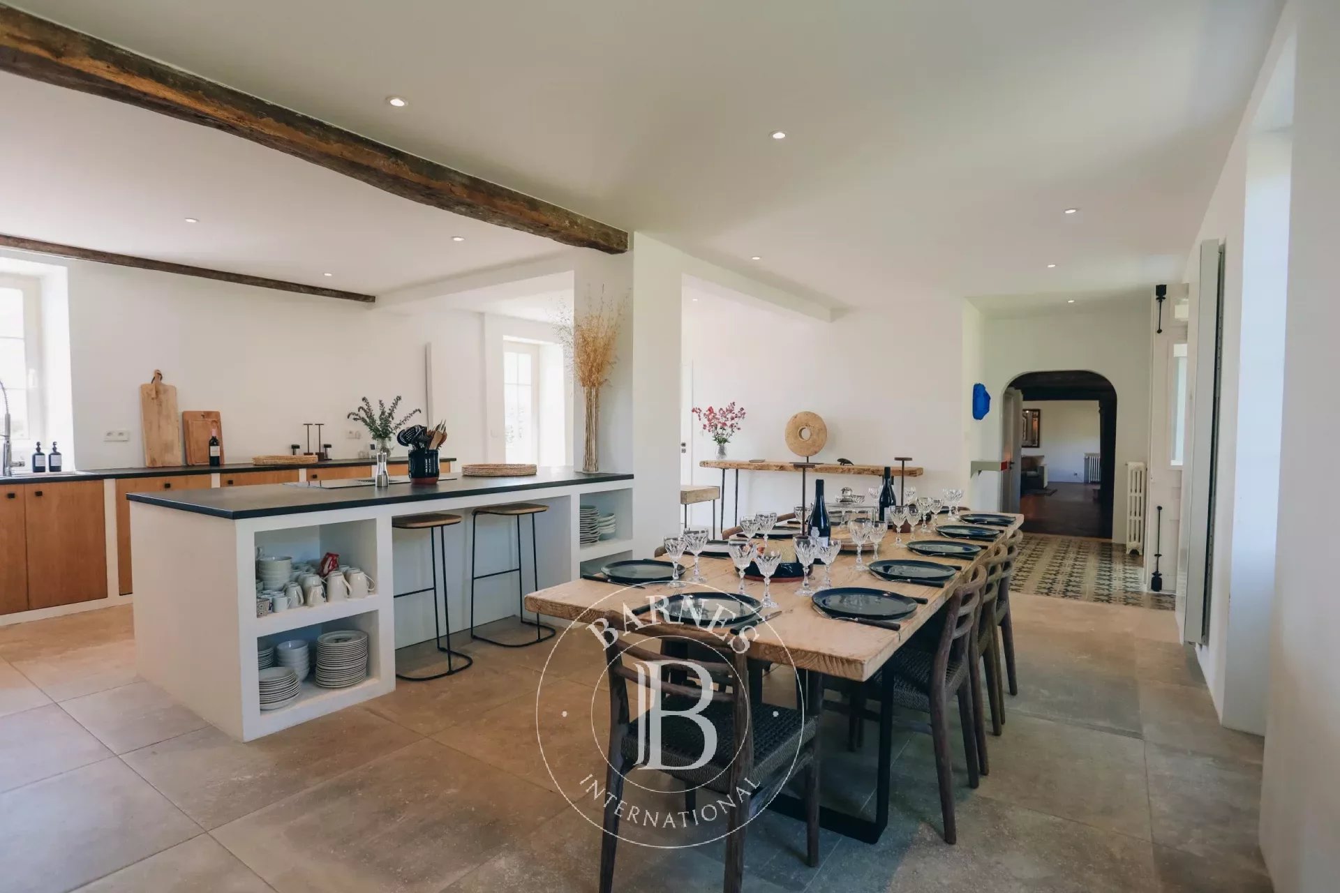 En entrant, la maison principale révèle ses intérieurs spacieux et magnifiquement aménagés, ayant été restaurés avec soin pour conserver les caractéristiques d'origine. La cuisine ouverte est le rêve d'un cuisinier, avec un bar à petit-déjeuner, une table à manger et tous les appareils modernes dont vous pourriez avoir besoin. Le salon comprend un coin cheminée, deux grands canapés et un système audio, parfait pour des soirées détendues.