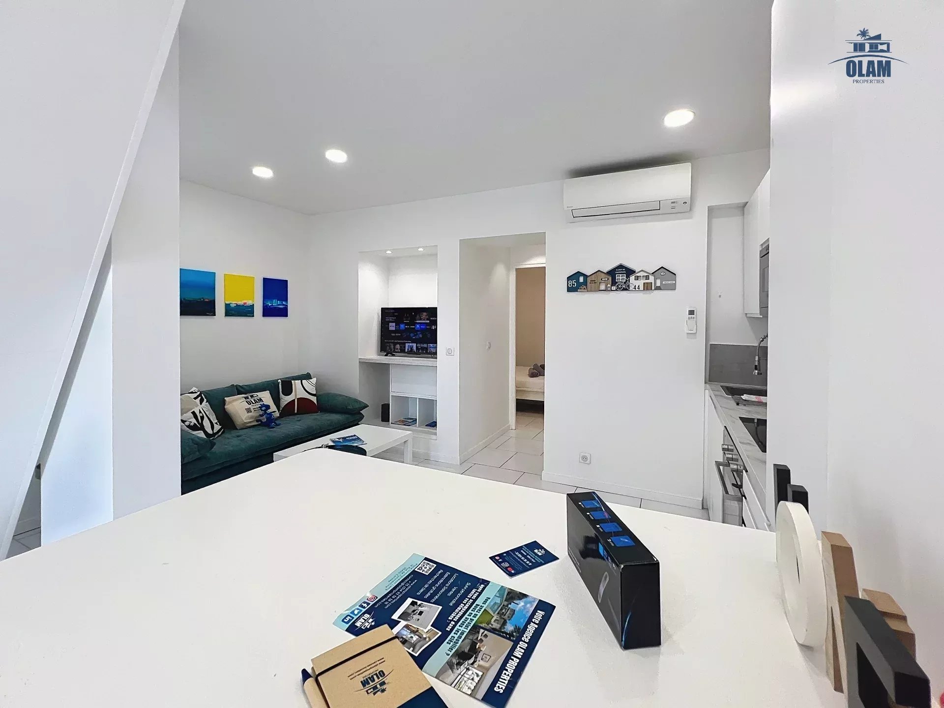 La pièce de vie, spacieuse et baignée de lumière naturelle, vous accueille avec sa décoration moderne et son ambiance chaleureuse 🌞. La cuisine ouverte, parfaitement équipée 🍷, donne sur un coin repas et un salon cosy, idéal pour partager des instants conviviaux après une journée à la plage ou une soirée sur la Croisette.