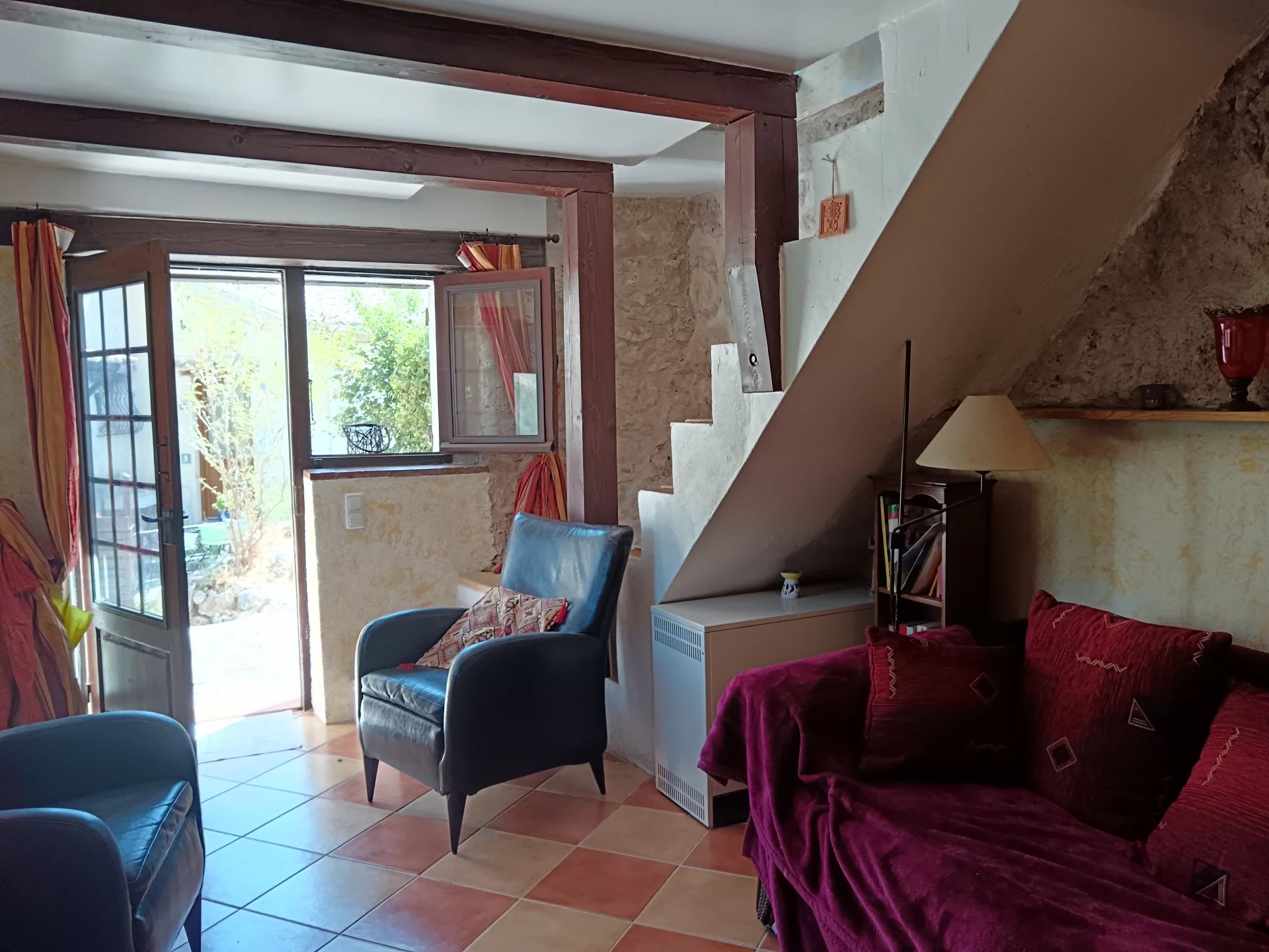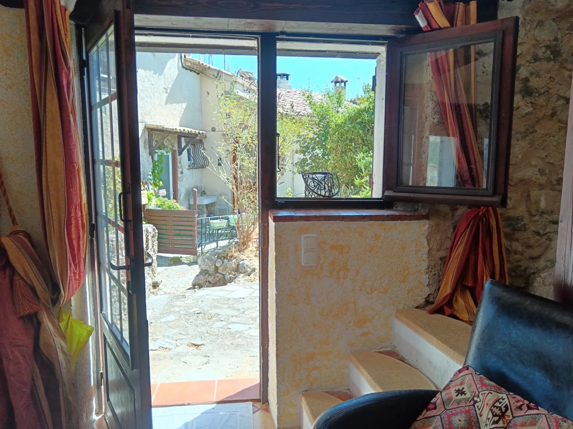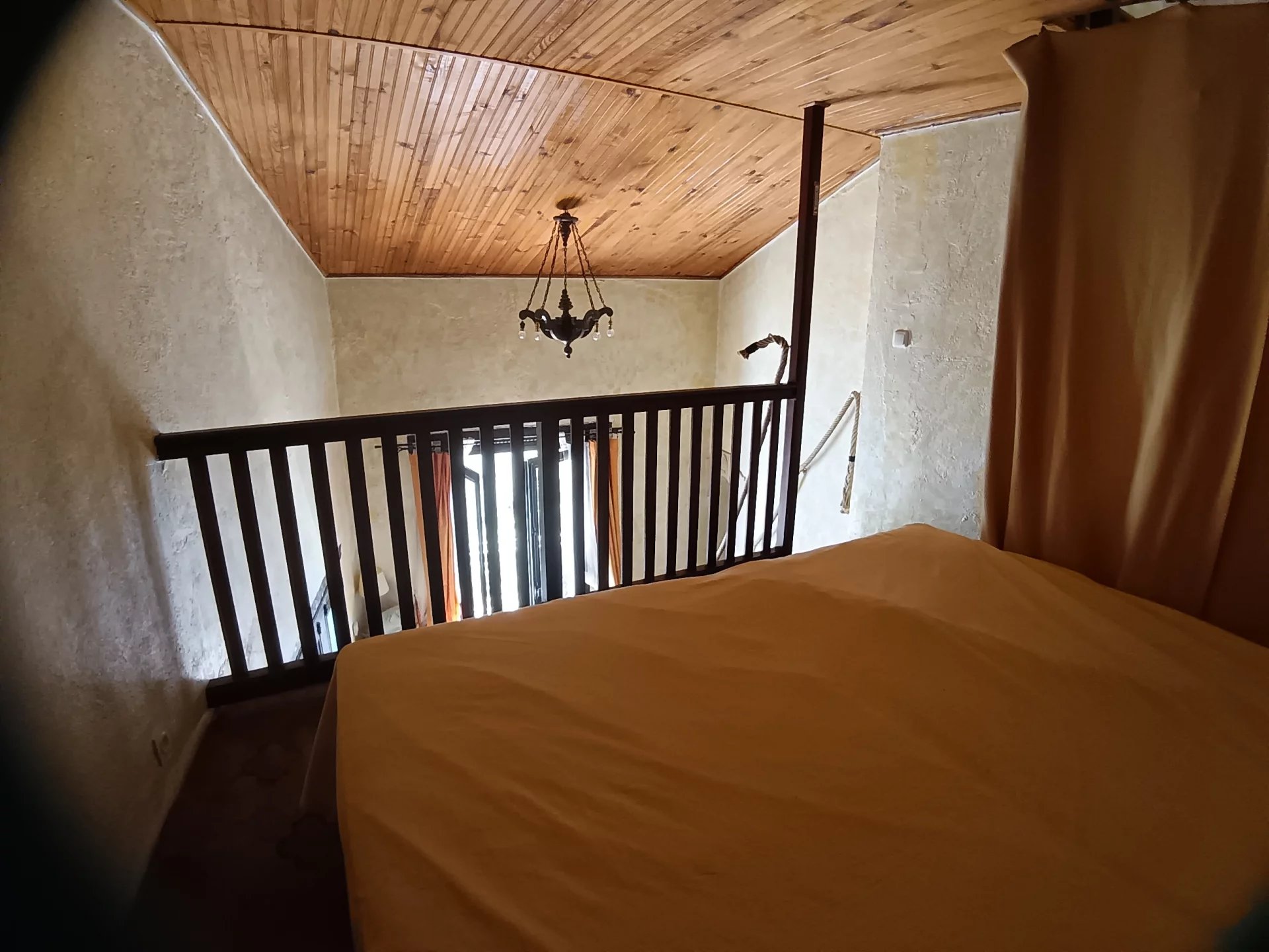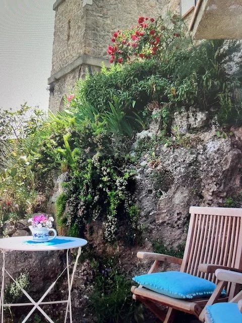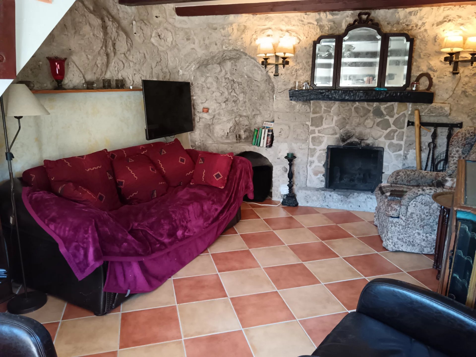Au rez de chaussée: le salon (chambre)avec cheminée et murs en pierres. Niveau qui s'ouvre sur l'exterieur et sa rocaille plantée.