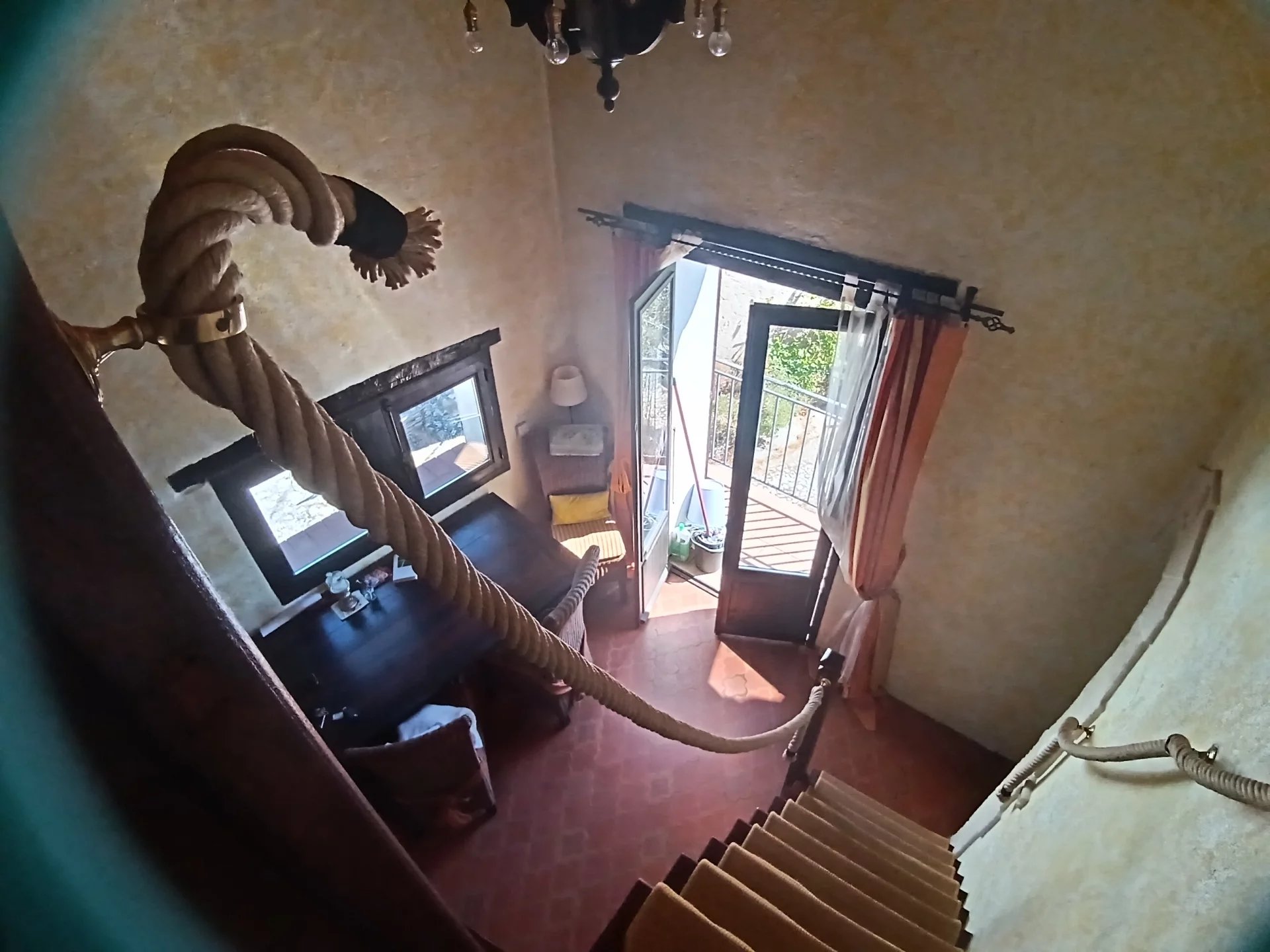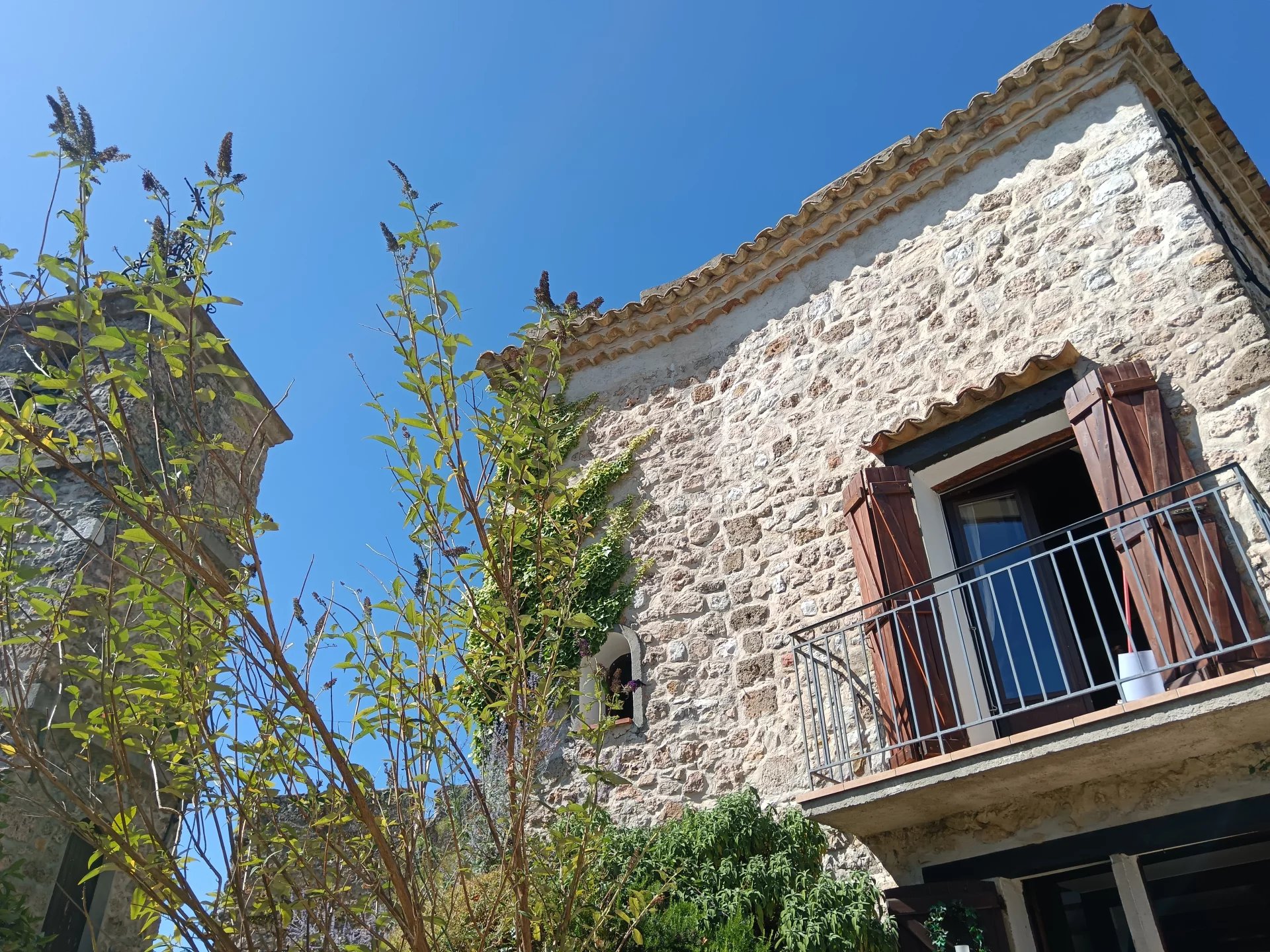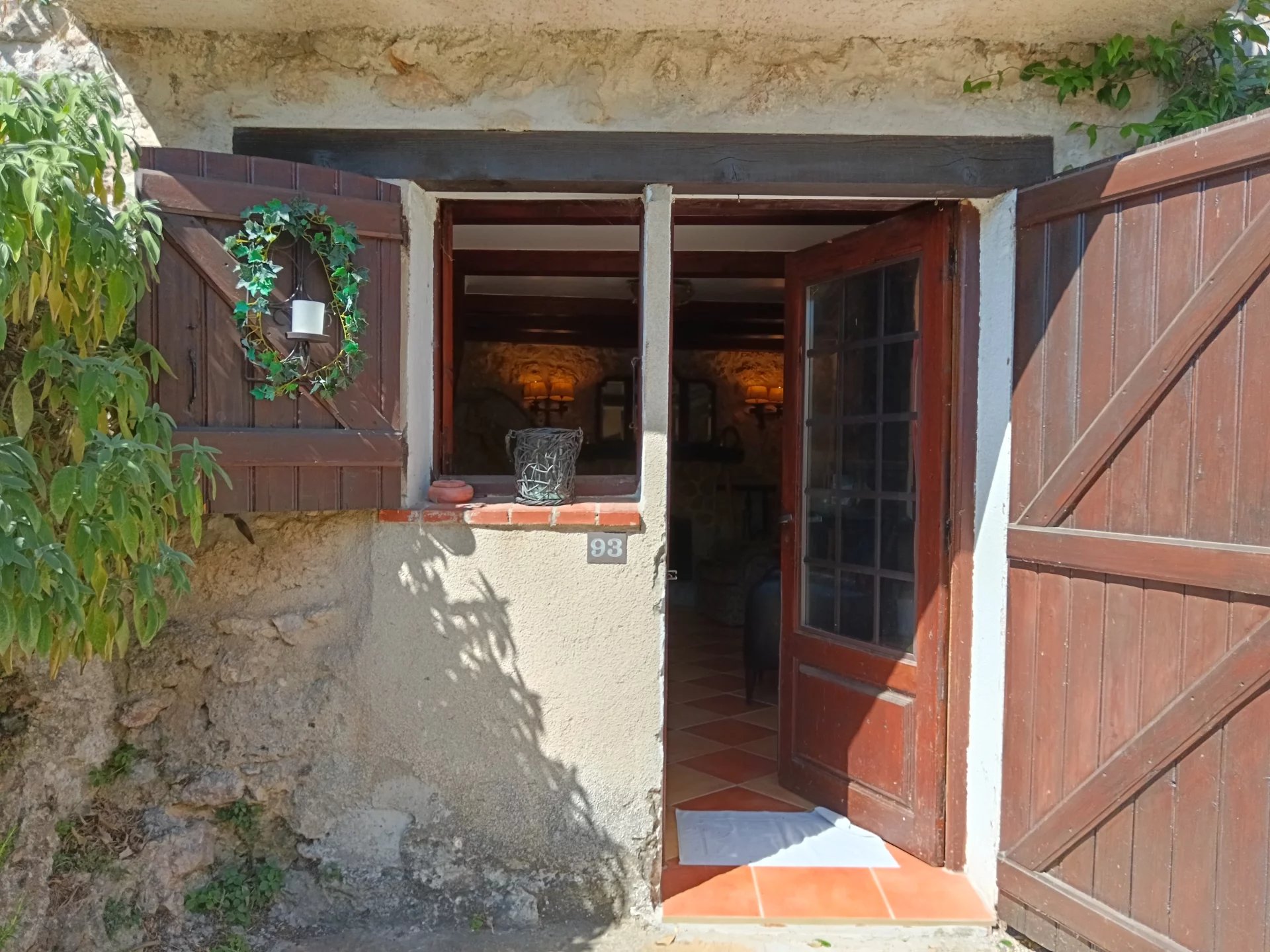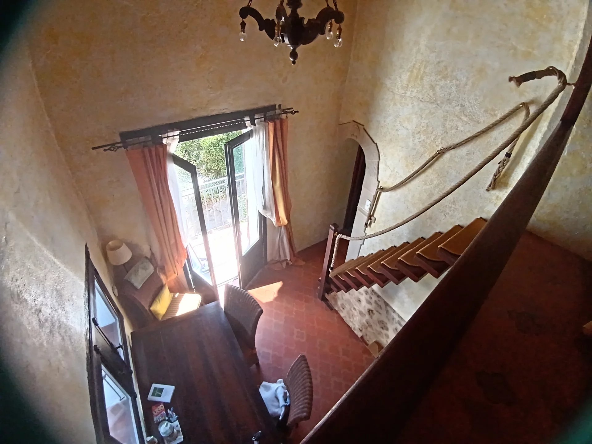 Au rez de chaussée: le salon (chambre)avec cheminée et murs en pierres. Niveau qui s'ouvre sur l'exterieur et sa rocaille plantée.