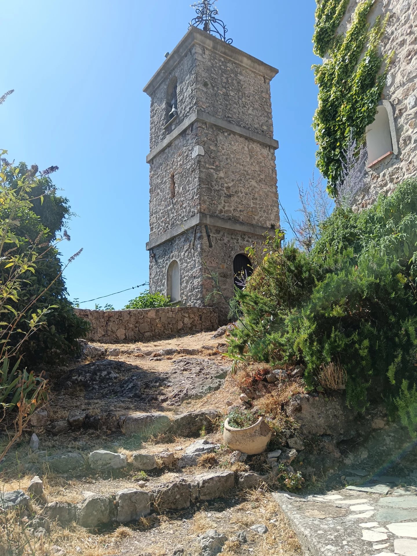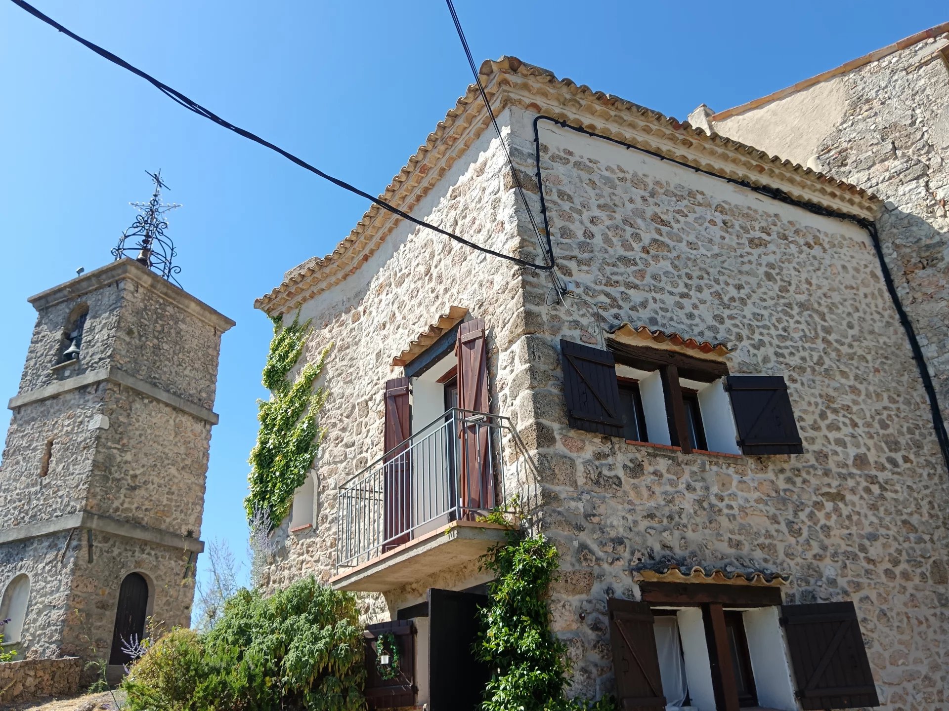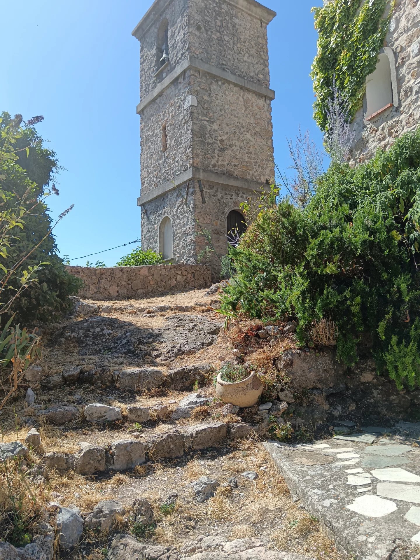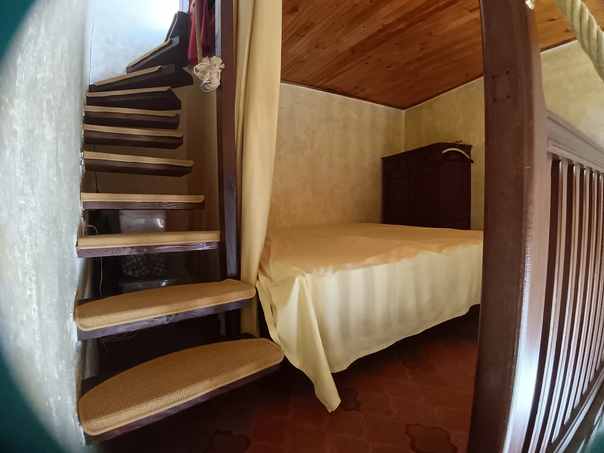 Au rez de chaussée: le salon (chambre)avec cheminée et murs en pierres. Niveau qui s'ouvre sur l'exterieur et sa rocaille plantée.