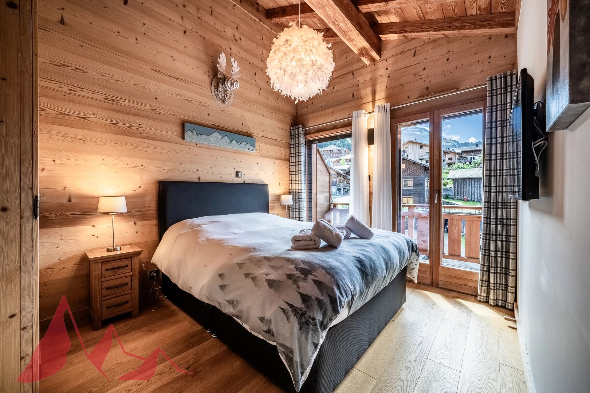 La pièce de vie de 40m², véritable cœur du chalet, s'ouvre sur un magnifique balcon offrant une vue directe sur les pistes et la Pointe de Nyon. Un poêle à granules y a été installé pour vos soirées cocooning.