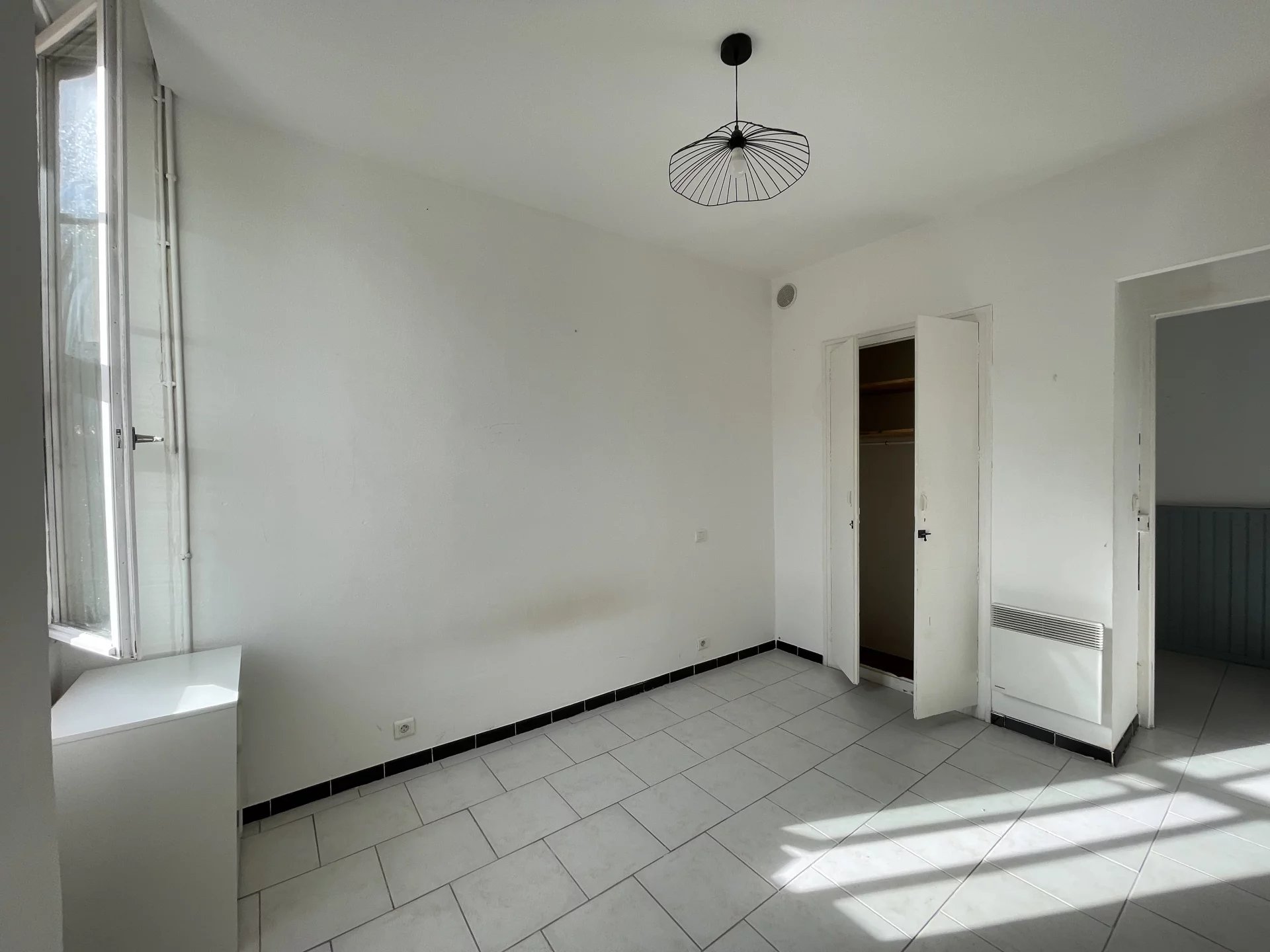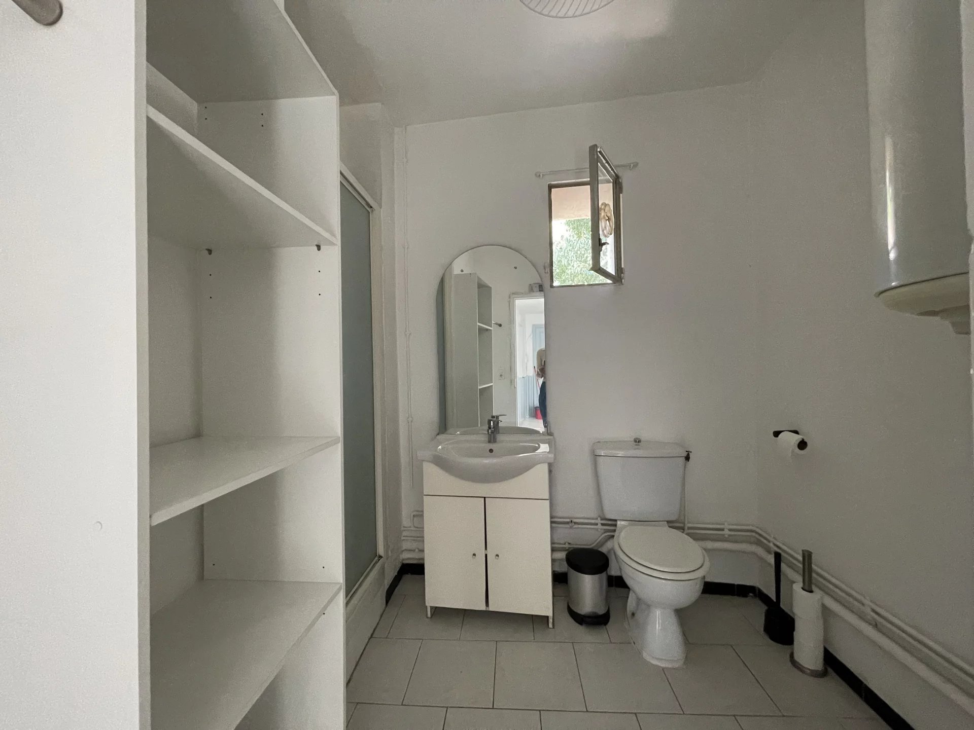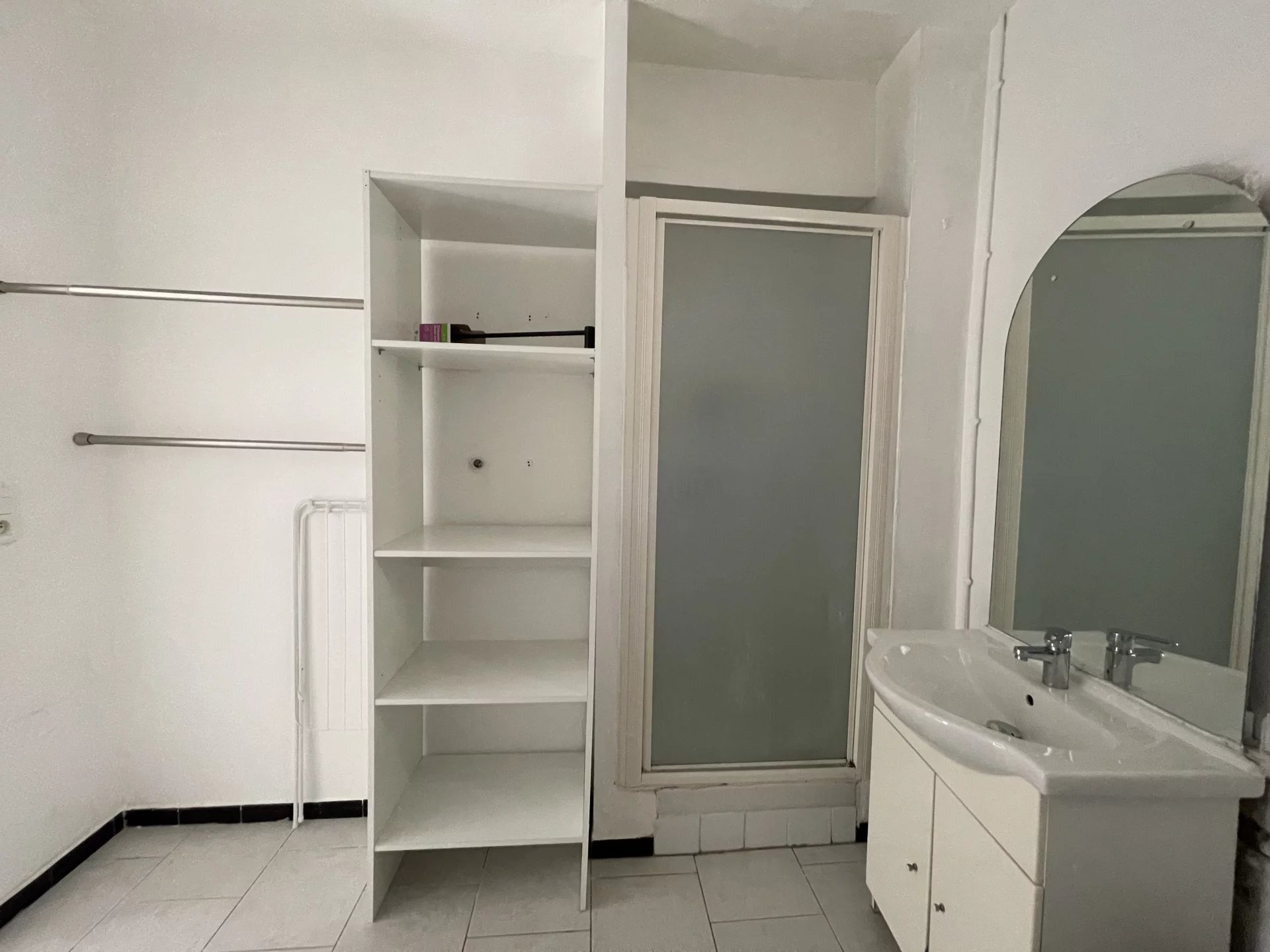 Appartement T2 au 2e étage d'un immeuble composé 5 appartements. Ce logement de 38,69 m² de surface habitable avec balcon, comprend une entrée, une chambre avec placard, un séjour-cuisine (meubles, plaque de cuisson, hotte) accès au balcon, salle d'eau-toilettes avec vasque sur meuble, miroir, douche avec porte, wc, étagères.