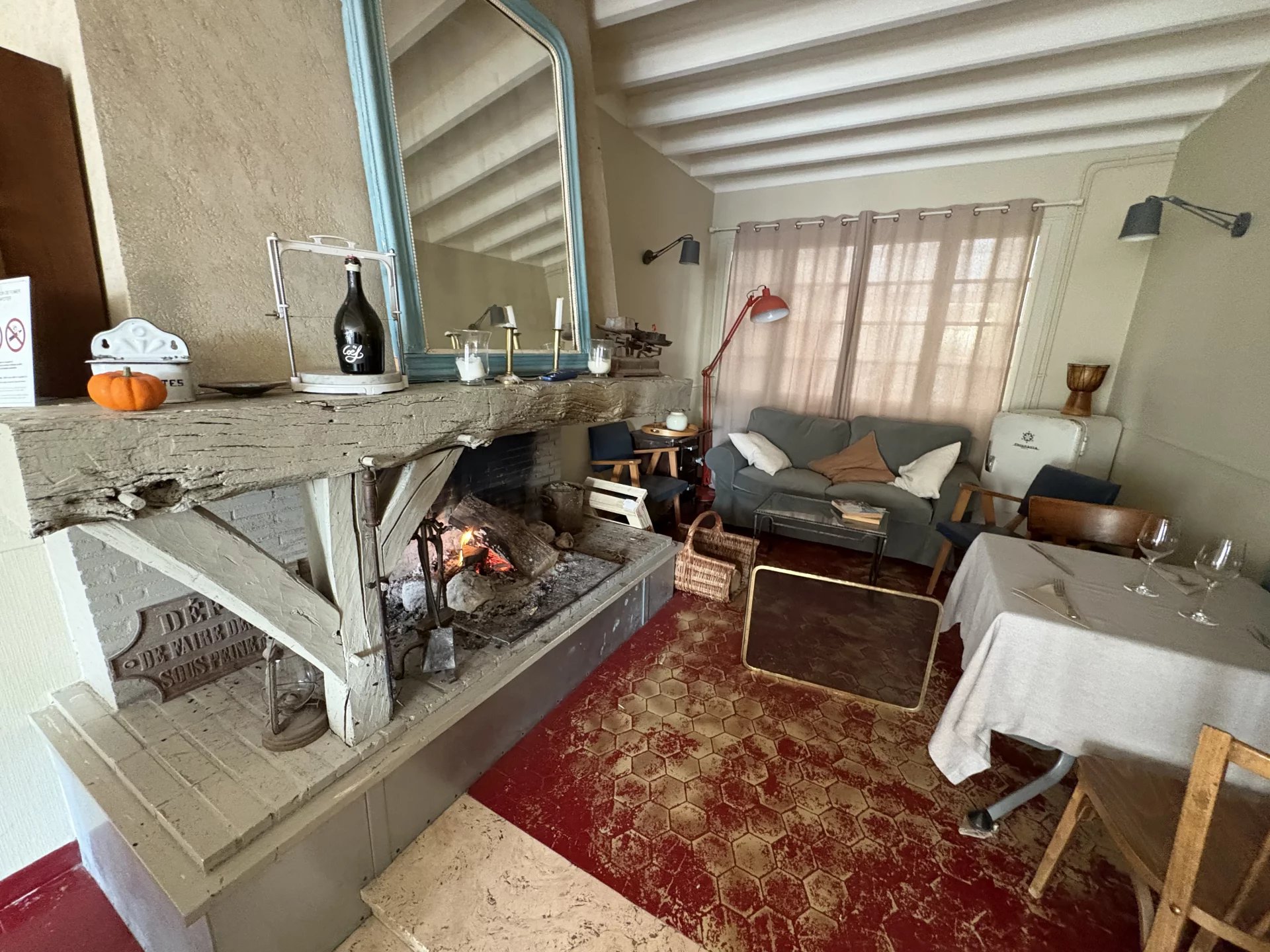 👉 Au rez-de-chaussée : un local commercial (bail en cours) actuellement exploité en restaurant (spécialités du terroir, clientèle fidèle) avec salle de restauration, cuisine équipée, chambre froide, salle annexe avec cheminée, cave à vin et véranda.