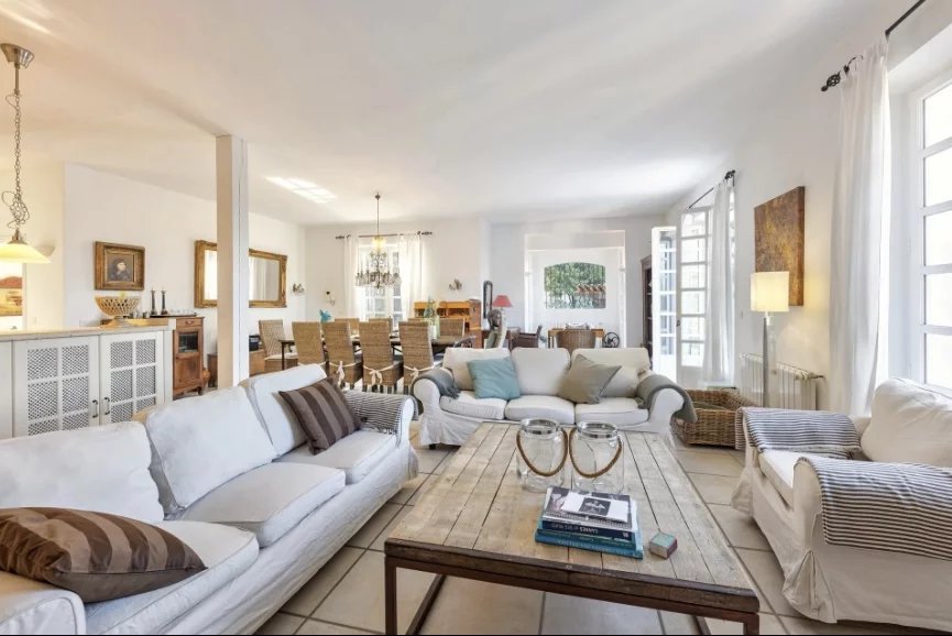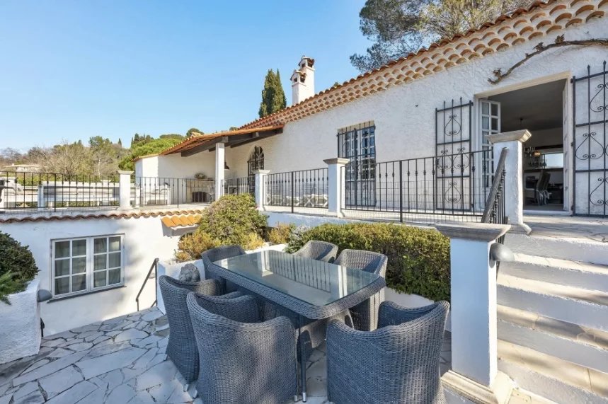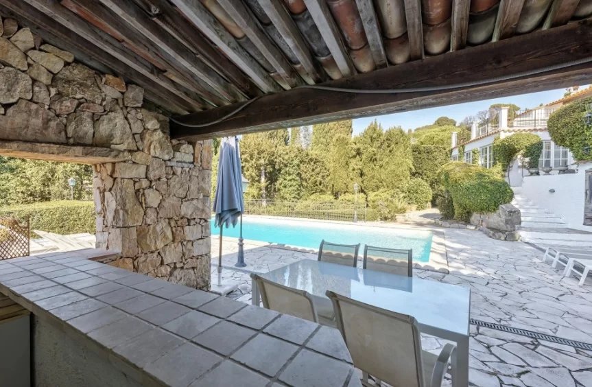 MOUGINS : Magnifique villa avec 5 chambres, vue dégagée et piscine située dans un environnement verdoyant et paisible, cette villa unique de 207m² habitables vous séduira par ses volumes généreux, son agencement fonctionnel et ses prestations de qualité. La propriété, en parfait état et de plain-pied pour l'essentiel, s'ouvre sur un spacieux séjour baigné de lumière avec une belle cheminée. La cuisine ouverte, parfaitement équipée, invite à partager des moments conviviaux. L'espace nuit principal comprend trois suites avec leurs salles d'eau privatives, complétées par un bureau fonctionnel et une buanderie pratique. Un studio indépendant avec kitchenette et salle d'eau, idéal pour recevoir famille ou amis, est aménagé sous la terrasse. Un écrin de verdure de 1720m² Le terrain paysagé, parfaitement entretenu et exposé sud-ouest, offre un cadre idyllique avec une piscine entourée de plages ensoleillées, un pool-house équipé pour des déjeuners d'été, des espaces de détente ombragés et une vue dégagée sur les collines environnantes. Située à seulement 25 minutes de Cannes, cette villa bénéficie d'un accès rapide aux écoles internationales réputées de la région, au parc naturel de la Valmasque pour les amateurs de nature et au village pittoresque de Mougins, accessible en 30 minutes par des sentiers forestiers. Une opportunité rare d'acquérir une propriété d'exception alliant confort moderne, tranquillité absolue et proximité des commodités de la Côte d'Azur.