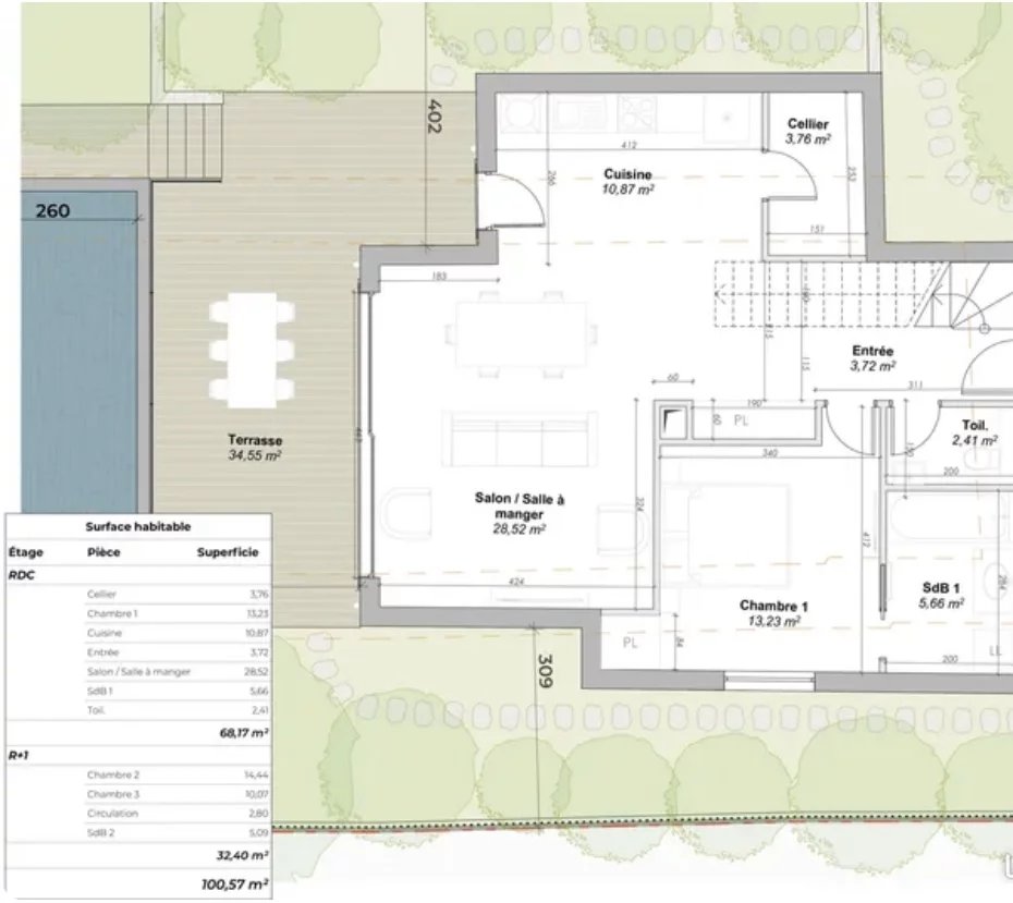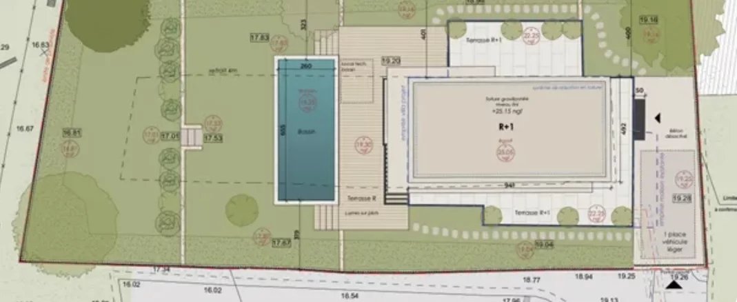 Caractéristiques du terrain : • Superficie : 385m² • Permis de construire accordé: Maison en R+1 de 100m², comprenant un vaste séjour de 43m² avec cuisine américaine, 3 chambres, 2 salles de bains, une piscine et plusieurs places de parking. • Exposition : Sud, offrant un excellent ensoleillement tout au long de la journée. • Vis-à-vis : Possibilité de planter une haie de cyprès ou autre pour préserver l'intimité. Option de rénovation : Vous avez également la possibilité de démolir et reconstruire l'existant : une maison de 86m² déjà présente sur le terrain.
