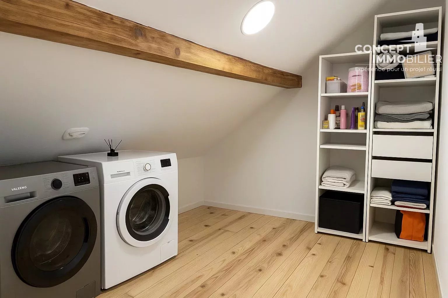 À l’étage, l’espace nuit se compose de deux chambres spacieuses, d’une buanderie fonctionnelle et d’un petit bureau parfaitement adapté au télétravail. L’ensemble dégage une atmosphère chaleureuse et soignée, où chaque détail a été pensé pour le confort au quotidien.