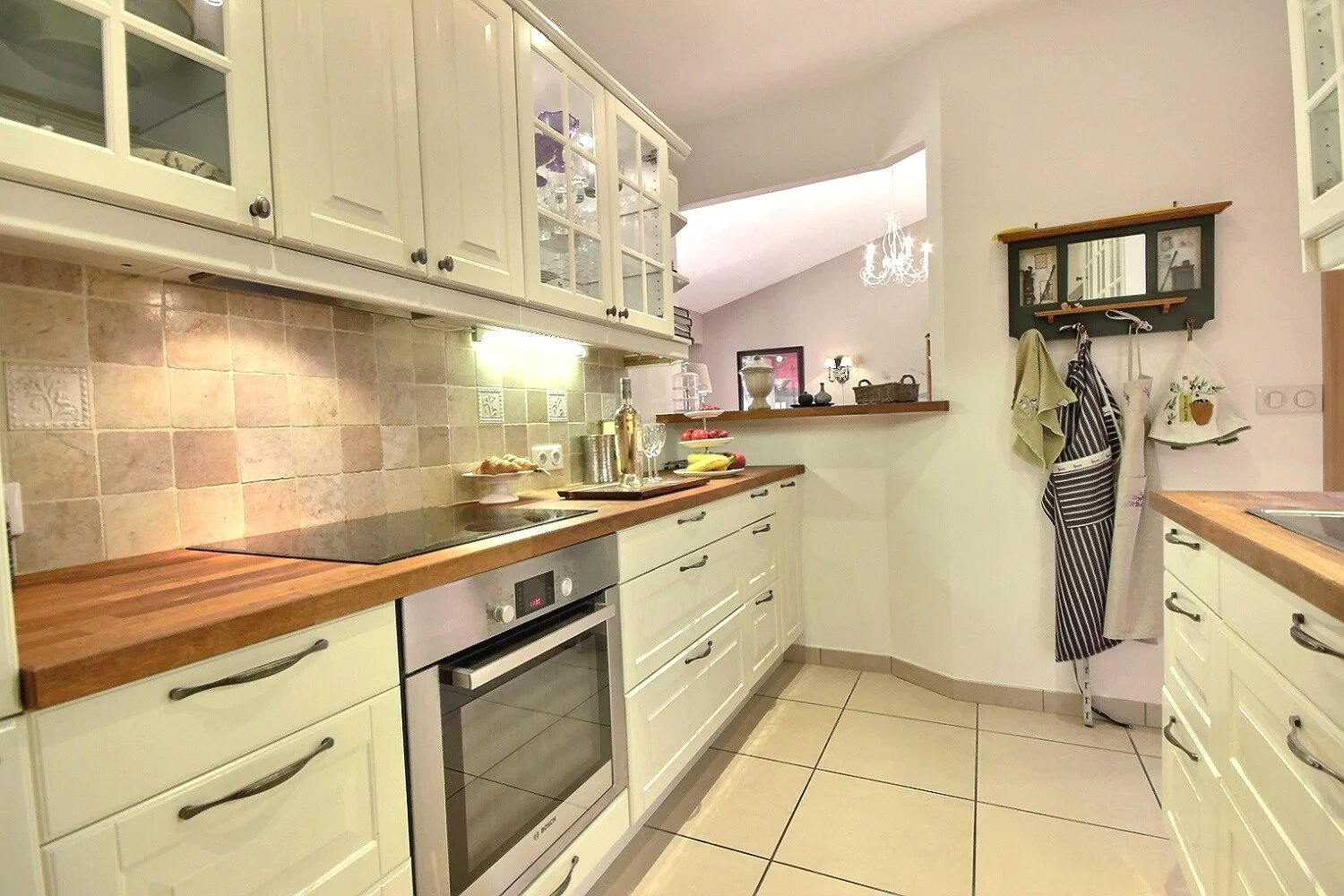 La cuisine équipée, réalisée avec des matériaux de qualité, allie esthétique et fonctionnalité.