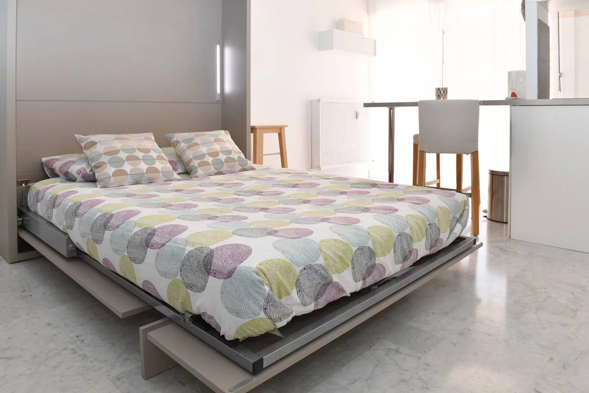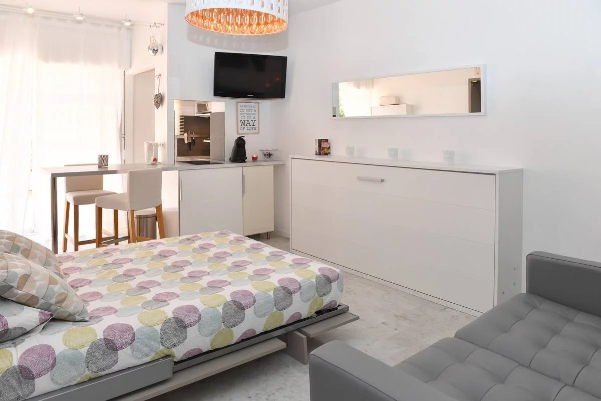 Le studio est entièrement équipé et il y a un lit double escamotable (140 cm). Il dispose d'un coin cuisine ouvert entièrement équipé avec plaques électriques, bouilloire, grille-pain, cafetière, four micro-ondes, lave-linge etc. La salle de bain dispose d'une belle douche à l'italienne, d'un lavabo et d'un WC. Il y a également un climatiseur reversible, WIFI, une télévision à écran plat dans le studio.