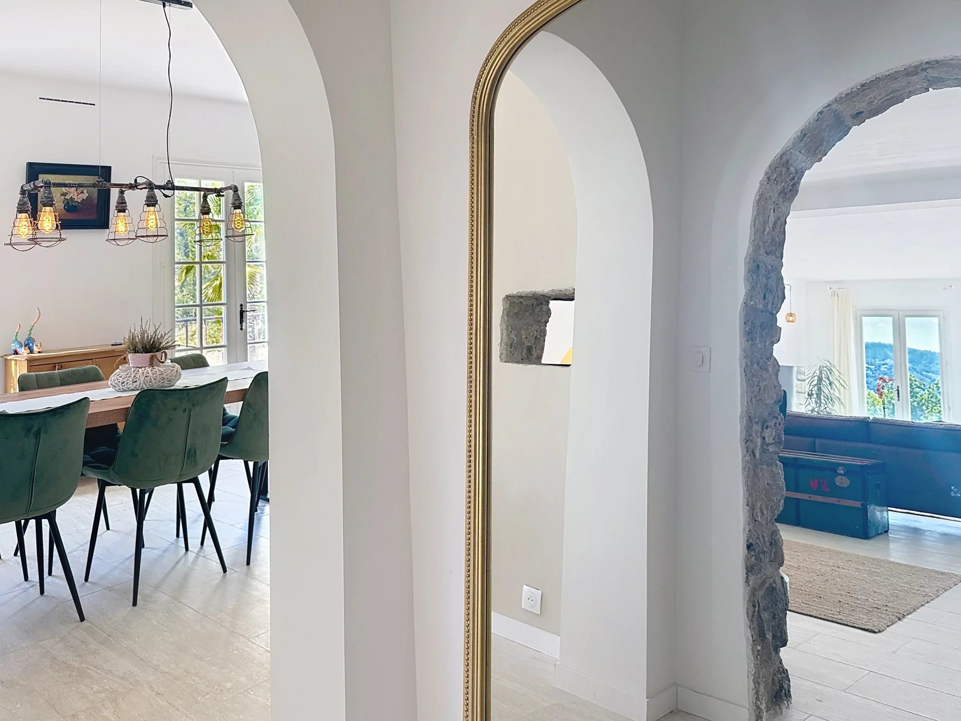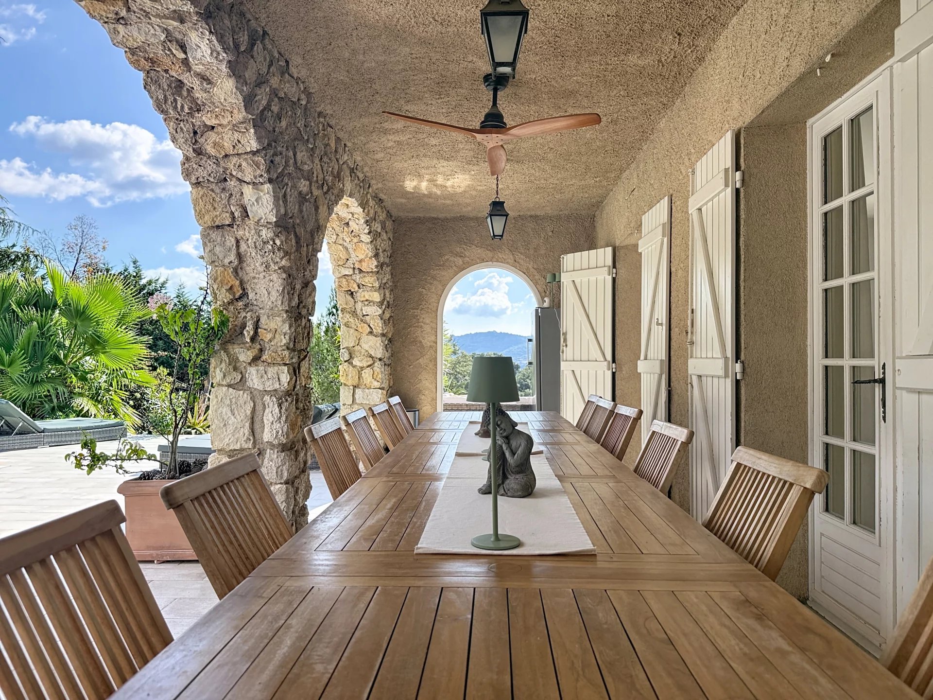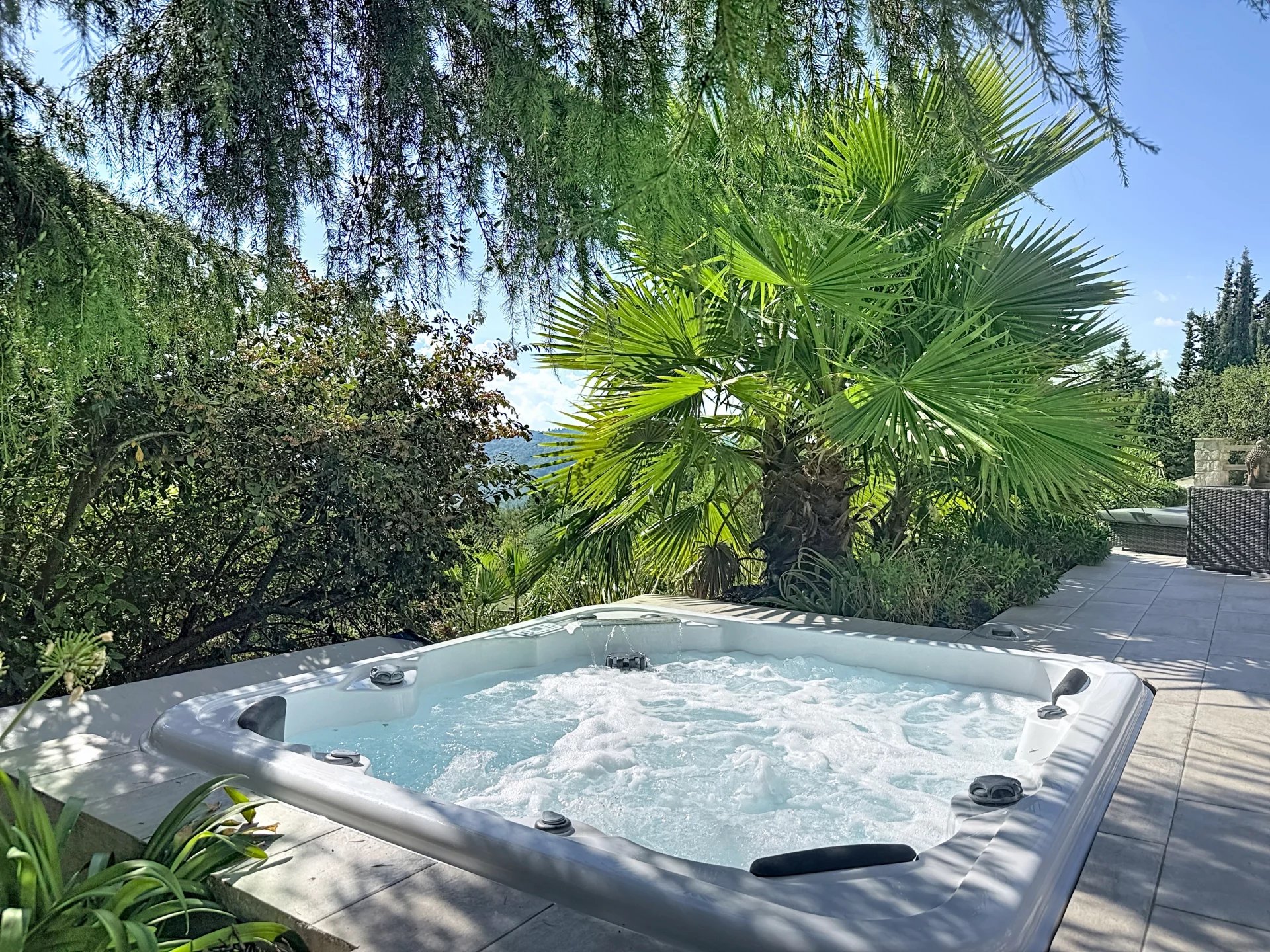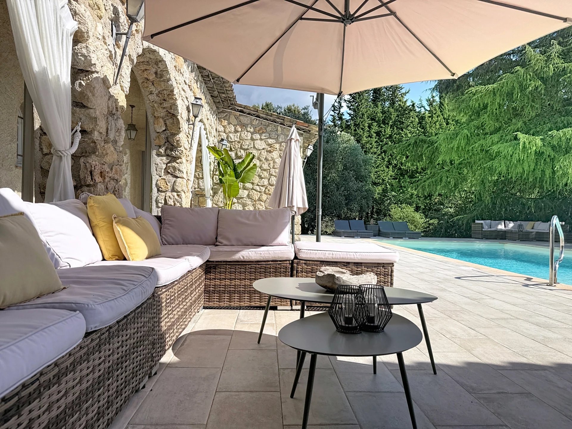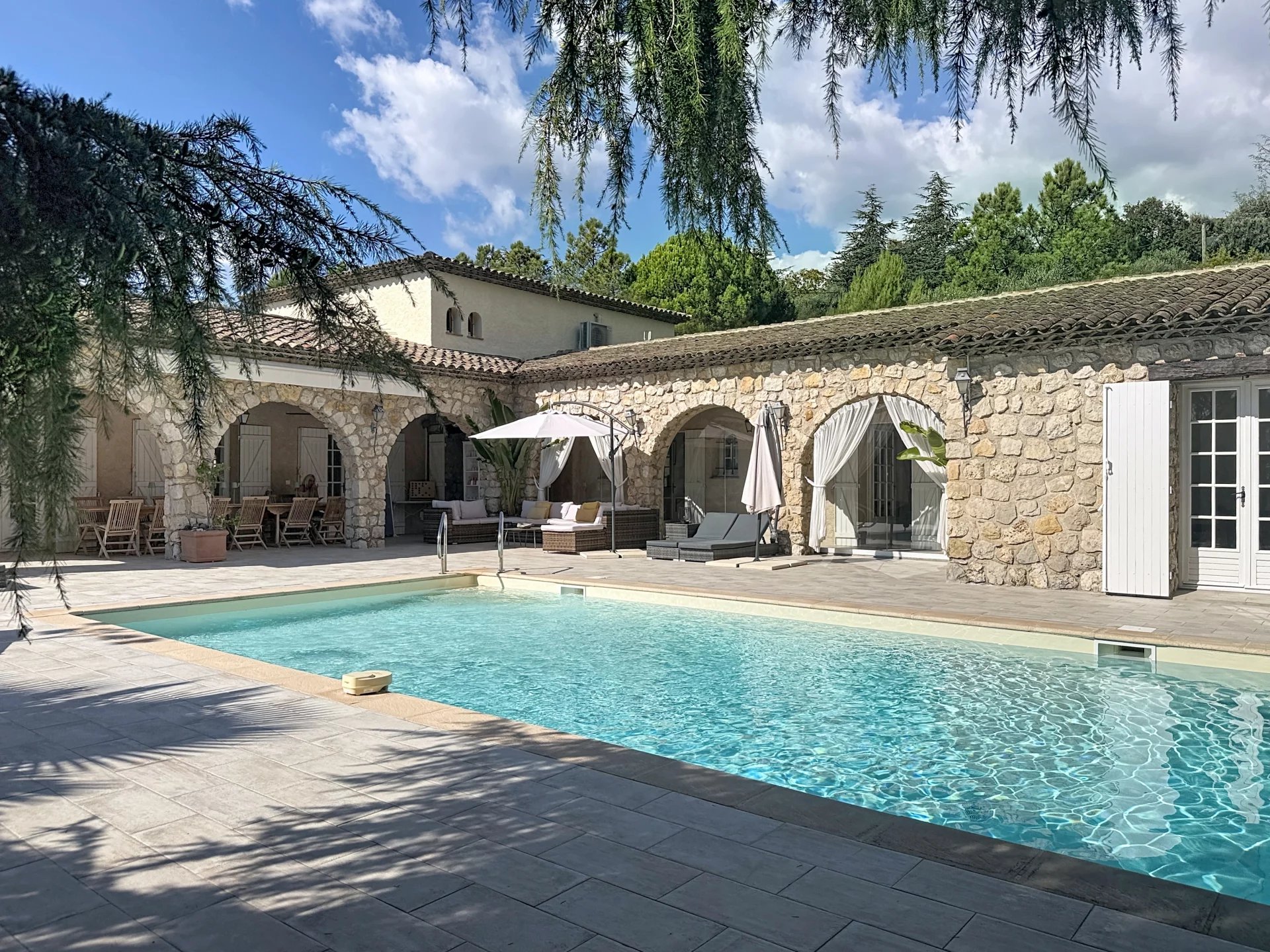 Située dans un secteur recherché et en vue dominante, cette propriété de 340 m² entièrement renovée, édifiée sur un terrain de 7 500 m² offre un havre de paix idyllique. Elle se compose d'une vaste pièce de vie avec une cuisine à l'américaine s'ouvrant sur une vue imprenable sur les collines et de 7 chambres et 5 salles de bains. Une piscine au sel chauffée, un jacuzzi, un jardin paysagé ainsi qu'un terrain de pétanque et volley-ball complètent le bien. Un grand appartement 2 P avec entrée indépendante. Un double garage et de nombreux stationnements à l'intérieur de la propriété