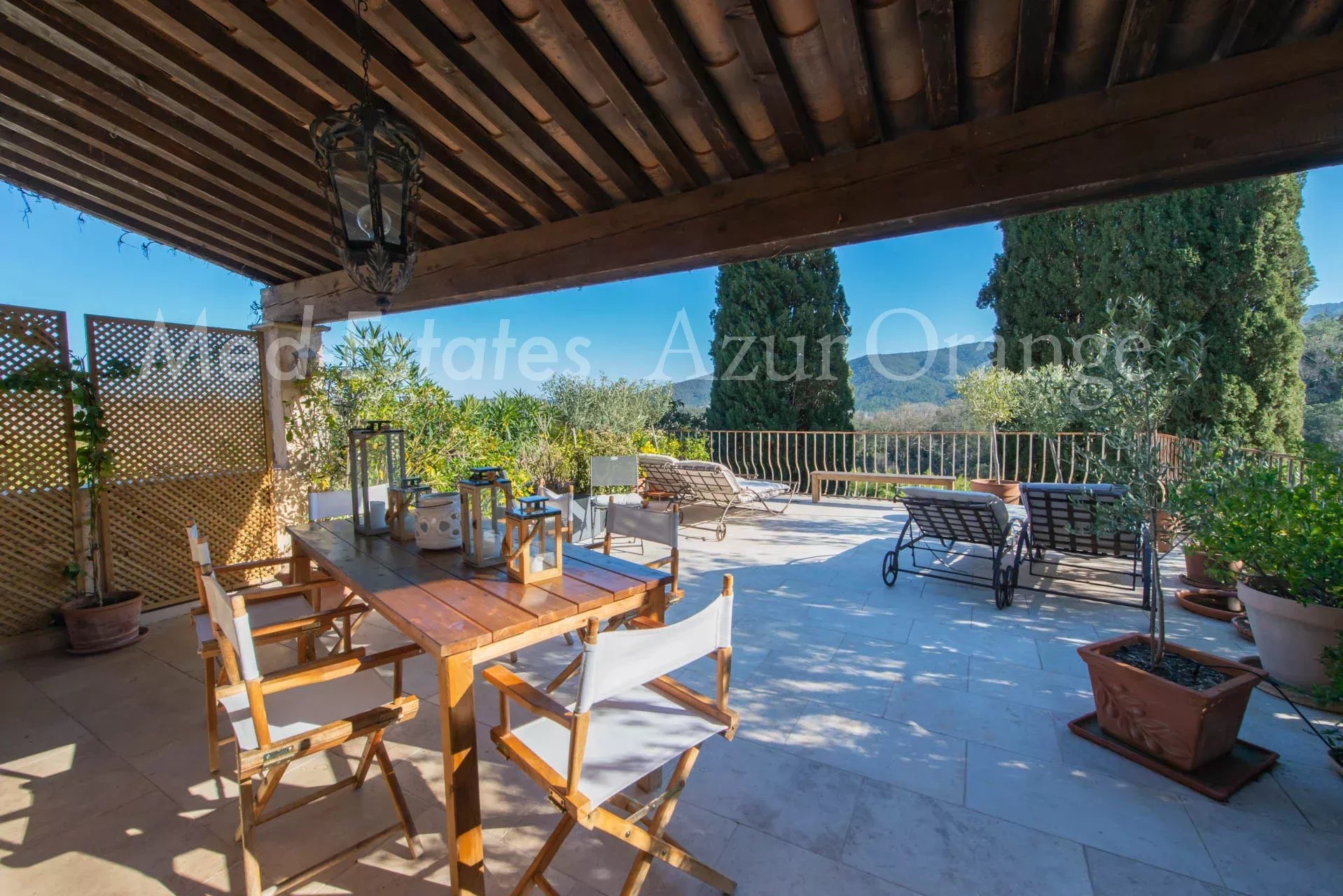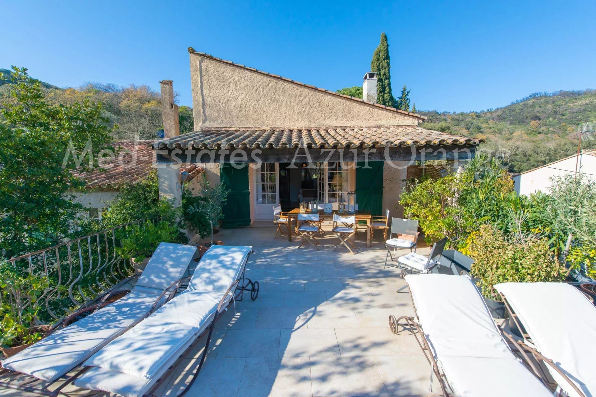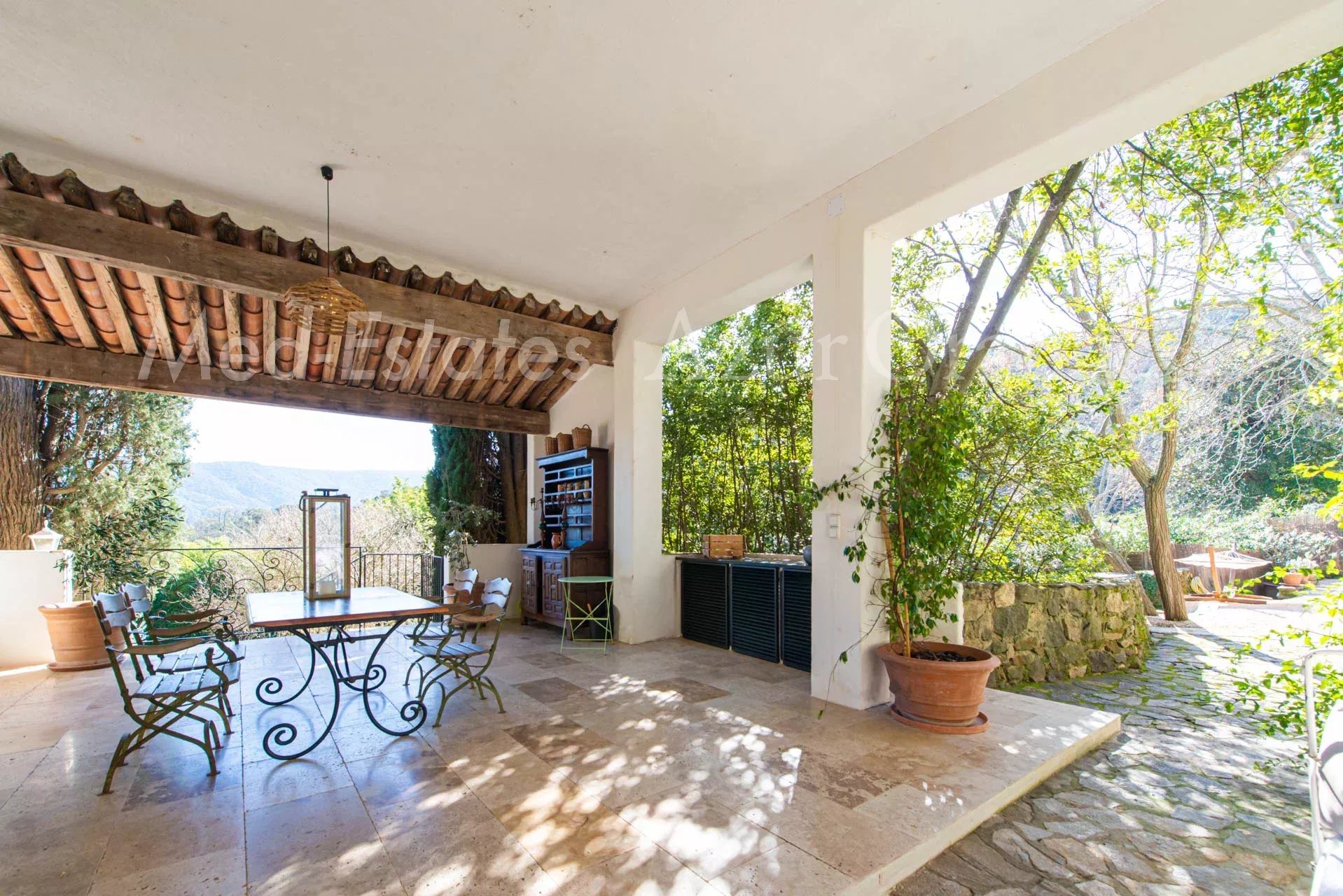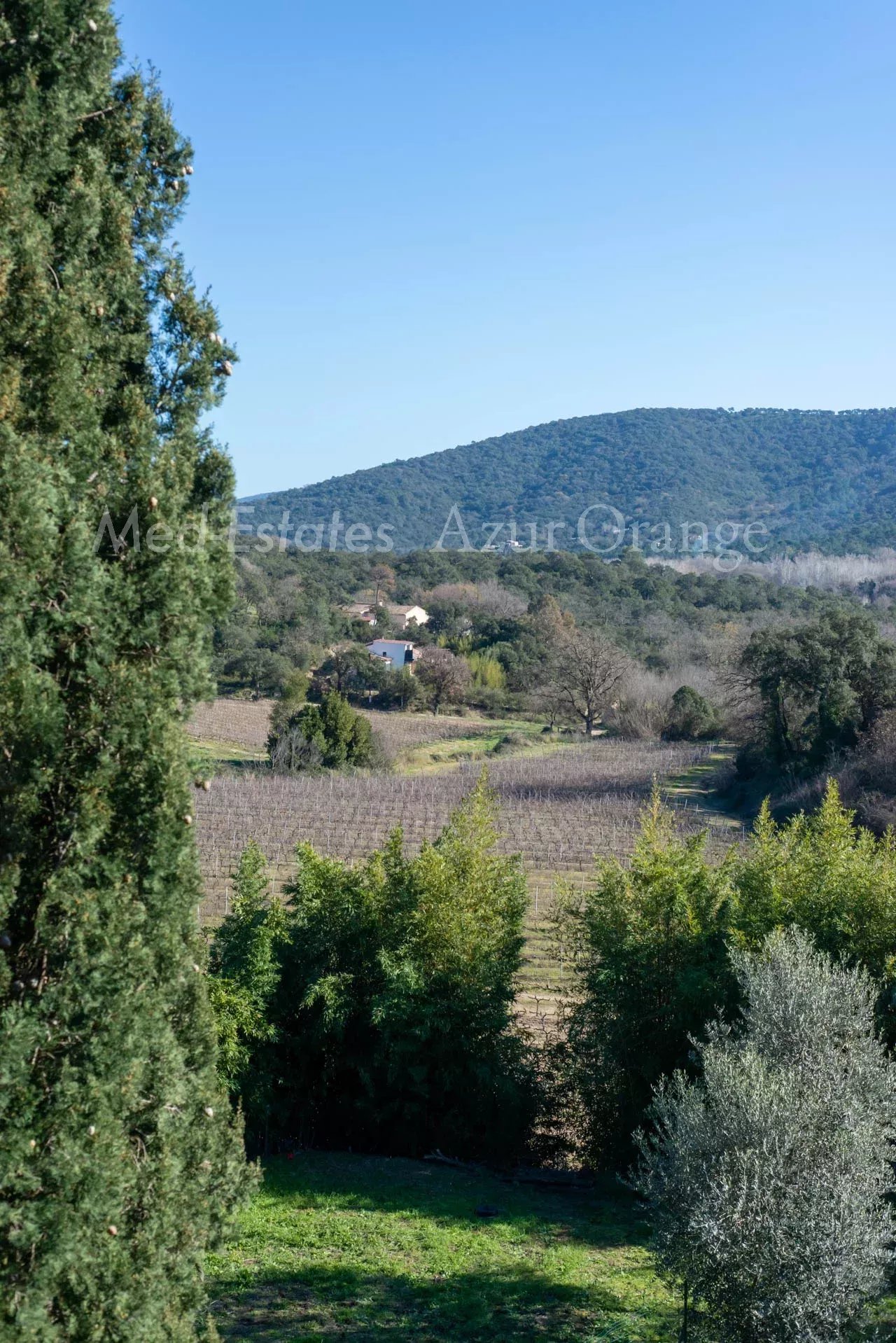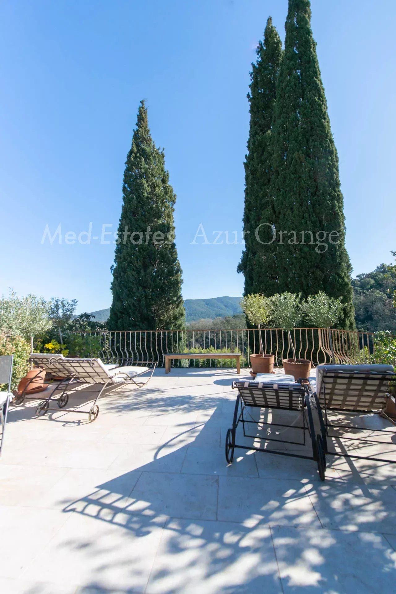 COGOLIN | EN PLEINE CAMPAGNE | MAISON DE CHARME AVEC GITE INDEPENDANT ET DEPENDANCES - VUE IMPRENABLE SUR LES ENVIRONS Charmante propriété entourée des vignes, pins, chênes-lièges sur une terrain d'environ 1689m²,... à 3 km du centre du village de Cogolin et des plages. La propriété se compose d'une maison principale de deux étages et d'un gîte, d'une surface habitable d'environ 200 m². Décoration particulièrement soignée et raffinée ! Une oasis de calme, à proximité immédiate des plages, du centre ville, de St. Tropez (12 km), des sublimes plages de Pampelonne. La maison Rez-de-chaussée : grand séjour avec très grande cheminée, exprimant le caractère à la fois rustique et raffiné de la propriété. Cuisine lumineuse. Accès à la terrasse.La terrasse extérieure d'environ 48 m², couronnée d'un auvent, surplombe le panorama du Massif des Maures.Niveau inférieur : 3 chambres avec une salle de bains ou une salle d'eau. Accès à l'étage du gîte. Le gîte : Entrée indépendante par le jardin. Une grande cuisine d'été couverte (+/- 60 m²). Rez-de-chaussée : espace de vie avec une très belle vue. Cuisine et cellier, ouverts sur le salon/salle à manger avec accès au jardin. Une salle voûtée, avec sol en marbre. La chambre, équipée d'une salle de douche et de toilettes indépendantes, s'ouvre sur la terrasse couverte. A l'étage : une pièce très lumineuse. Une grande salle de bains. Vue intime sur le jardin. Annexes : une cave voûtée, un bûcher, une pièce et un hangar (+/- 60 m ² sur deux niveaux).Possibilité de construire une piscine..