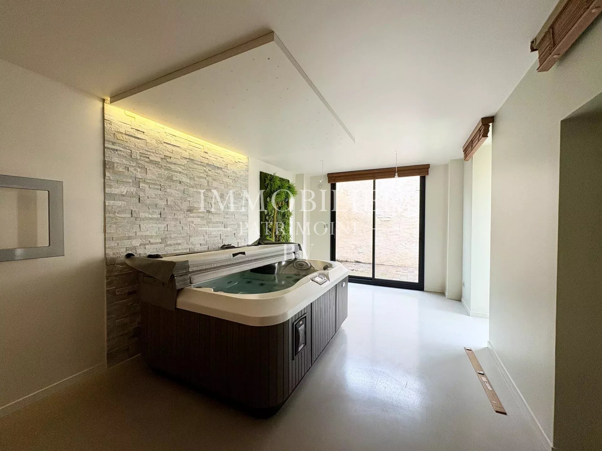 Le rez-de-chaussée dessert un salon/salle à manger, une cuisine entièrement aménagée et équipée ouvrant sur une cour close de murs, ainsi qu’un second salon avec un coin bar et un espace SPA.