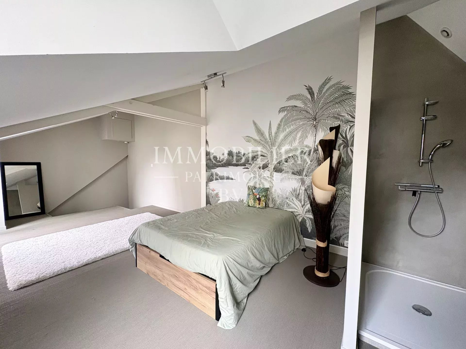 Le premier étage comprend une chambre avec salle d’eau privative et accès au balcon/terrasse, ainsi qu’une suite parentale avec un dressing et deux salles d’eau. Le palier permet également un accès direct à l’extérieur.