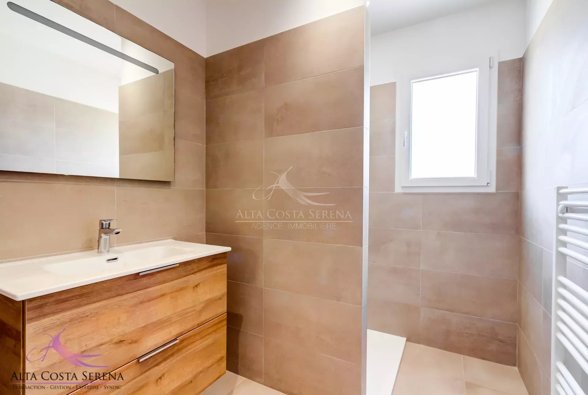 Conforme aux normes RT 2020, elle est équipée d'un chauffe-eau thermodynamique, de volets électriques, de la climatisation et la fibre est prévue prochainement.