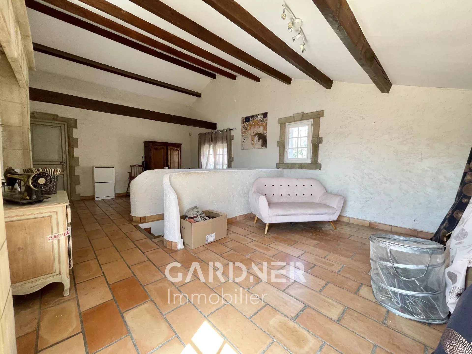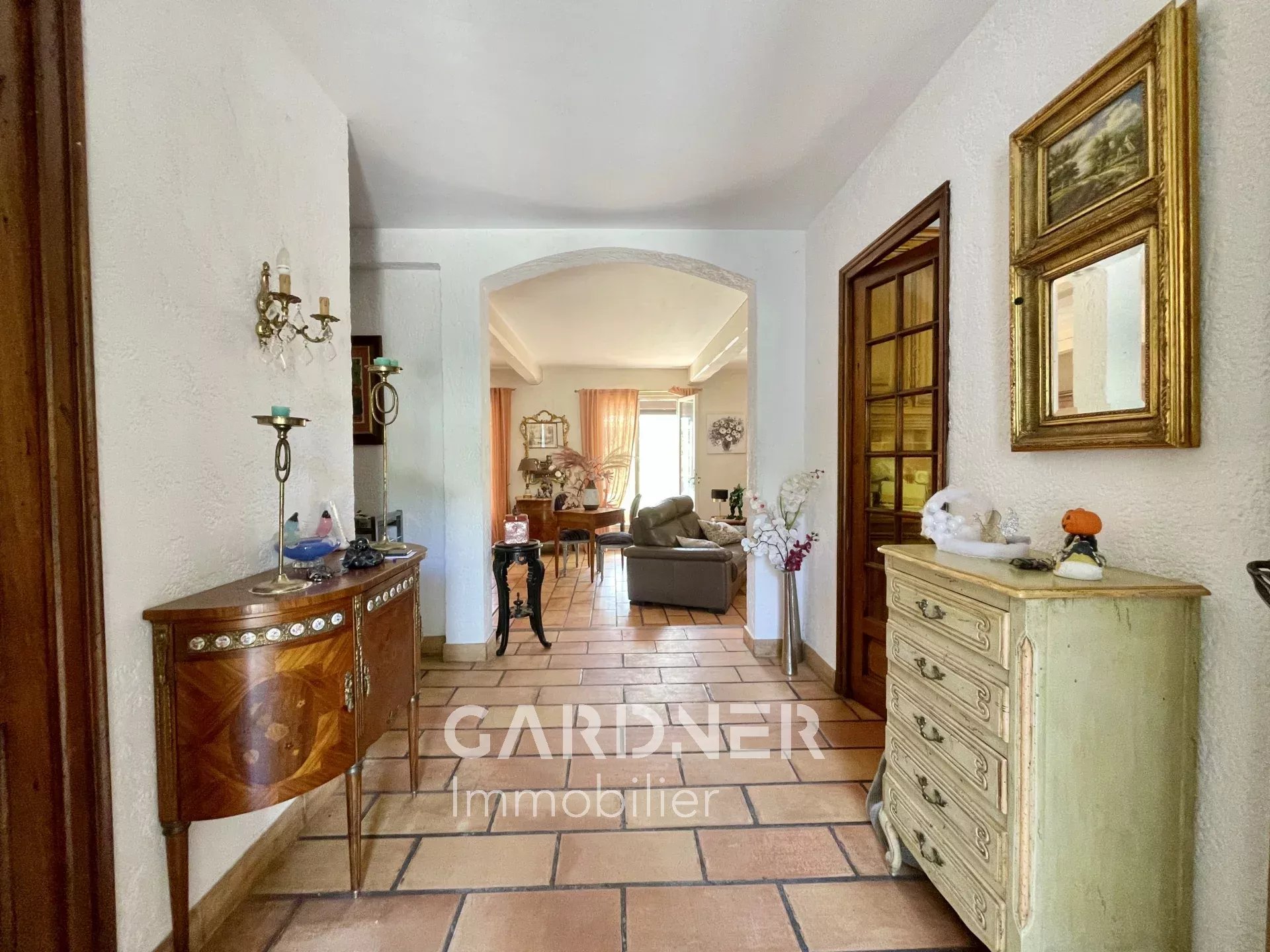 En rez-de-chaussée, vous découvrirez une belle entrée donnant sur la pièce à vivre avec plusieurs ouvertures dont la principale est au SUD. Le séjour donne sur le jardin et la terrasse.