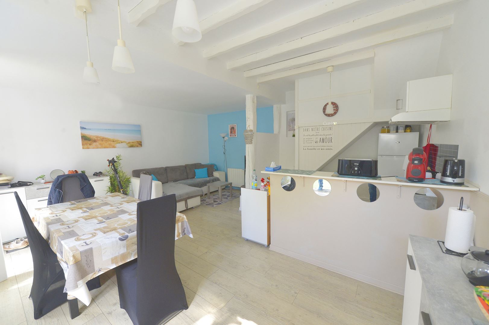 Saint-Georges de Didonne - Maison de ville dans l'hyper centre d'environ 60m² sur 2 niveaux. Au rez-de-chaussée le séjour avec cuisine ouverte donnant sur un extérieur au calme. Au 1er étage, un dégagement avec placard, 2 chambres, salle d'eau et wc séparé. Une petite allée devant la maison mène à un petit jardin partagé avec cabanons. Plage à 200 mètres !