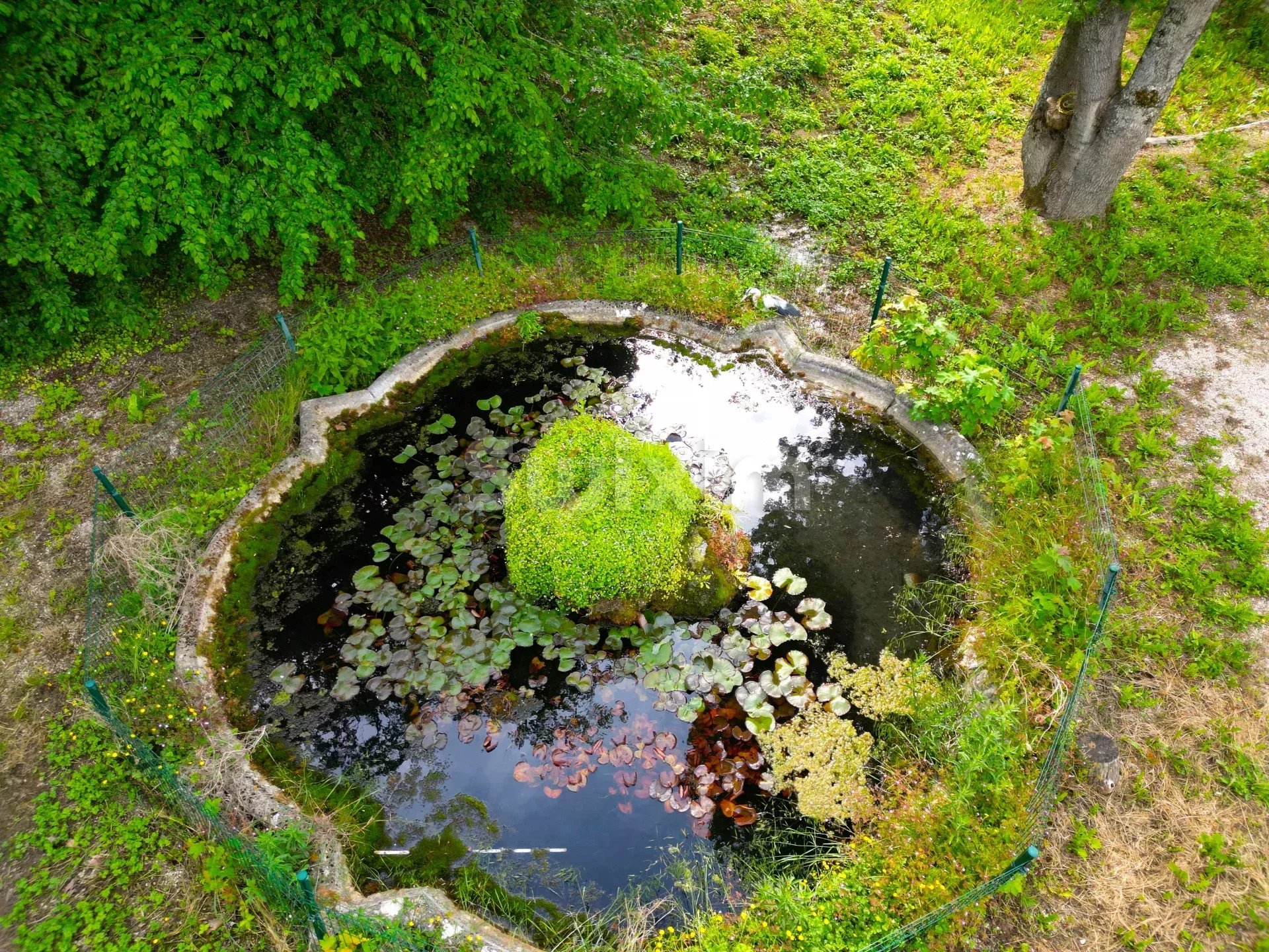 maison élevée sur cave, garage, cabane, bassin avec source.