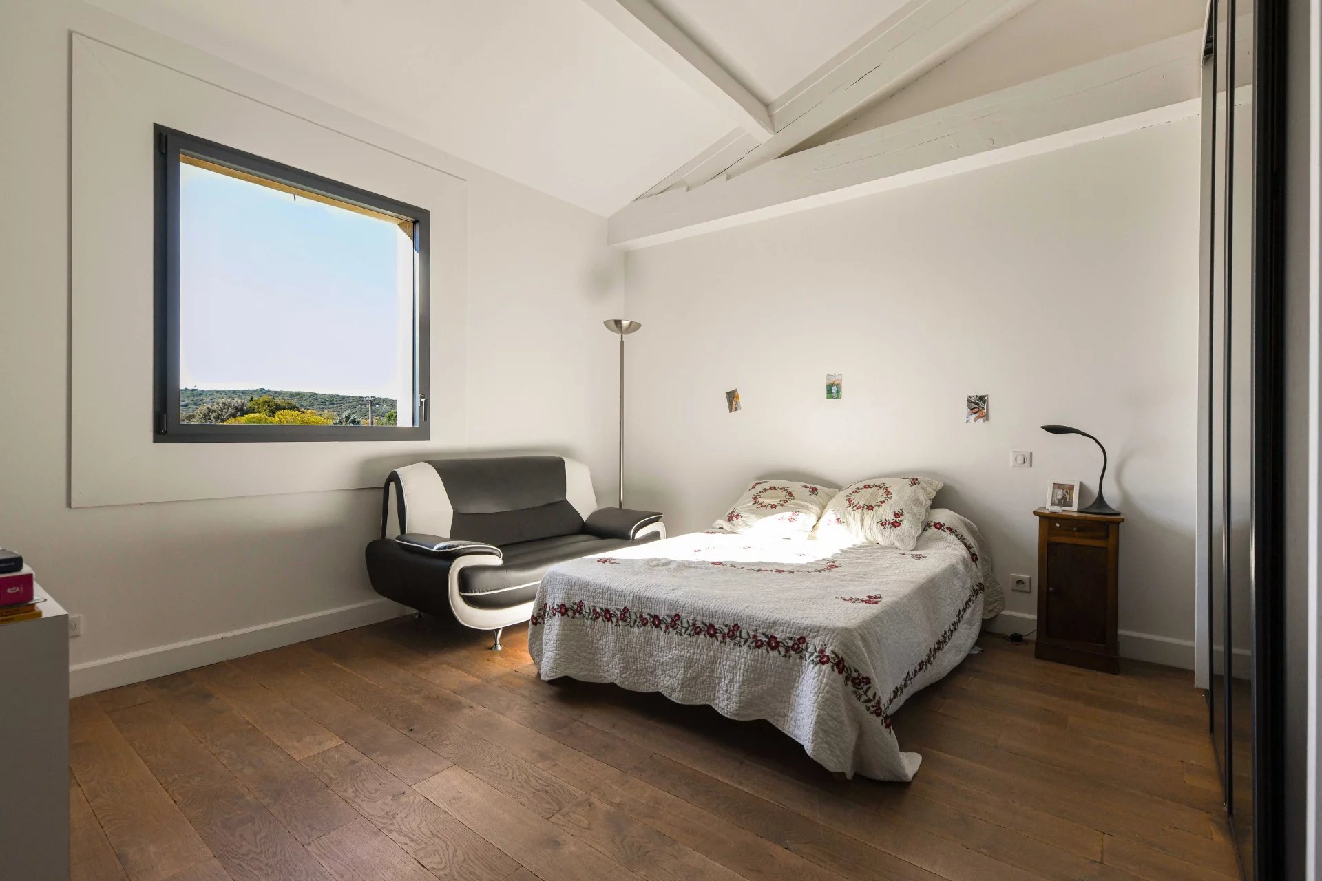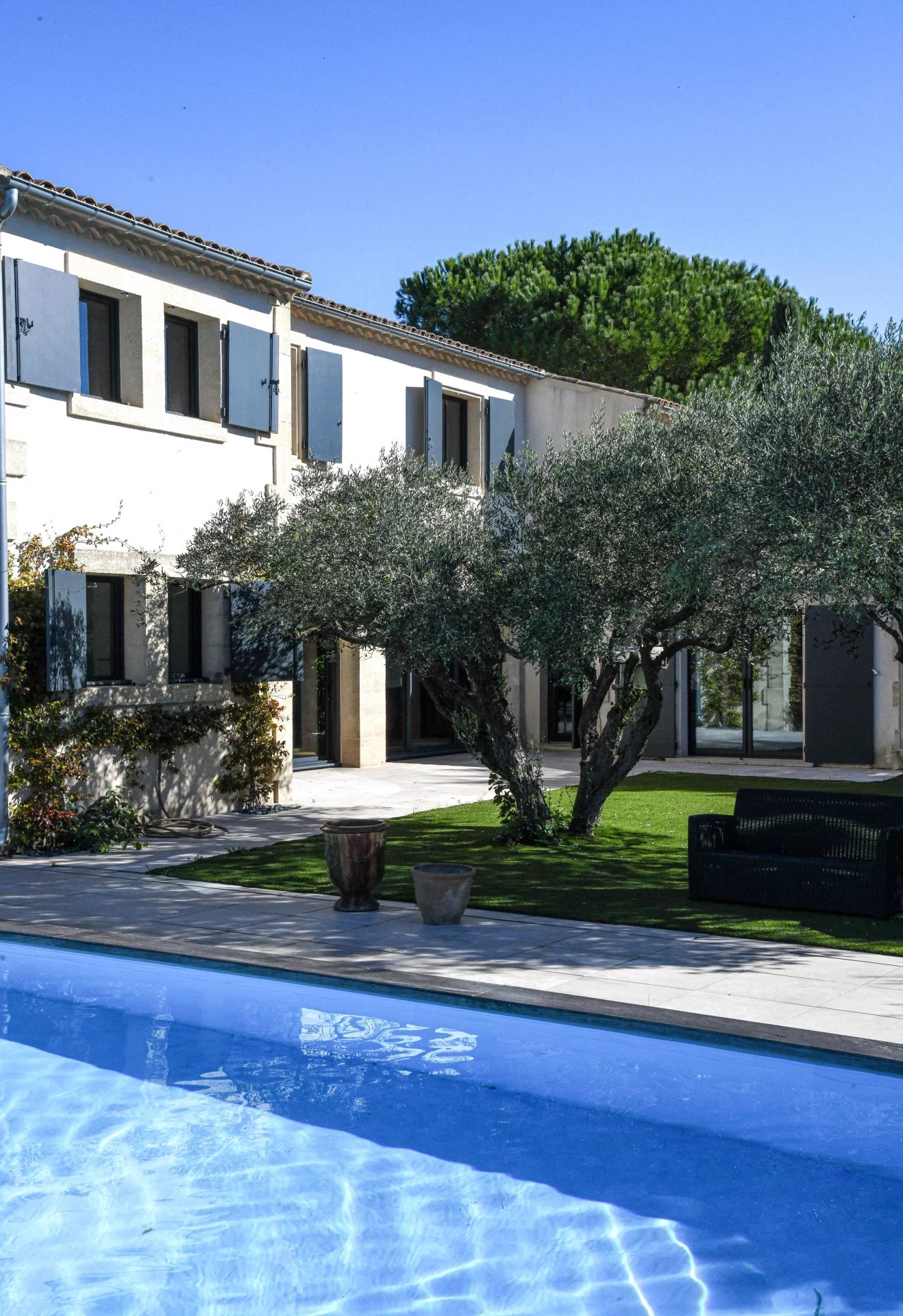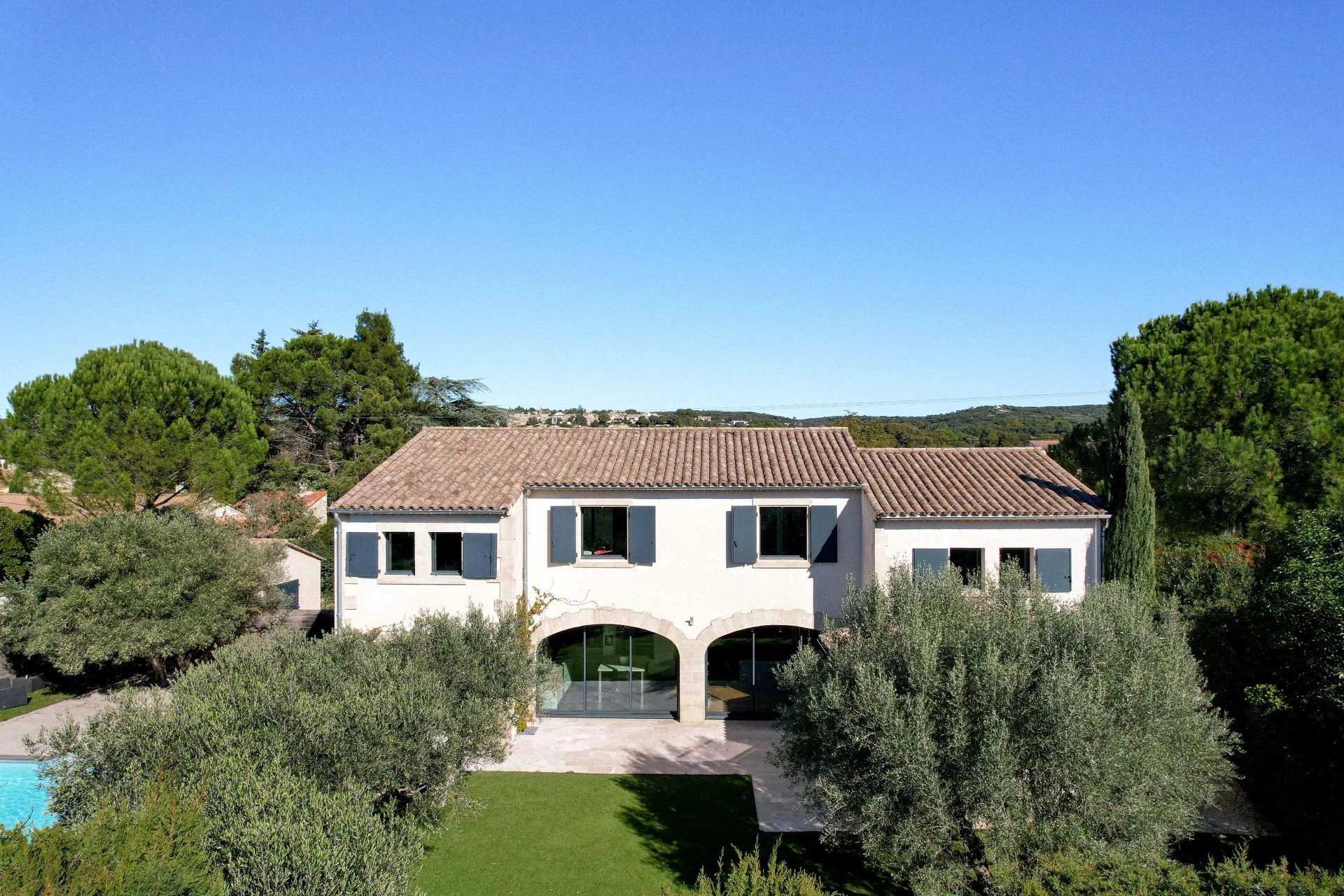 Ensemble de réception de 100 m² ouvert sur le jardin et la terrasse piscine 5 chambres, 3 salles de bains dont une suite de plain-pied Jardin arboré et paysagé de 1500 m², piscine 10 x 5 m, Garage. Dans un village prisé, à 5 km d’Uzès et 2 km des commerces