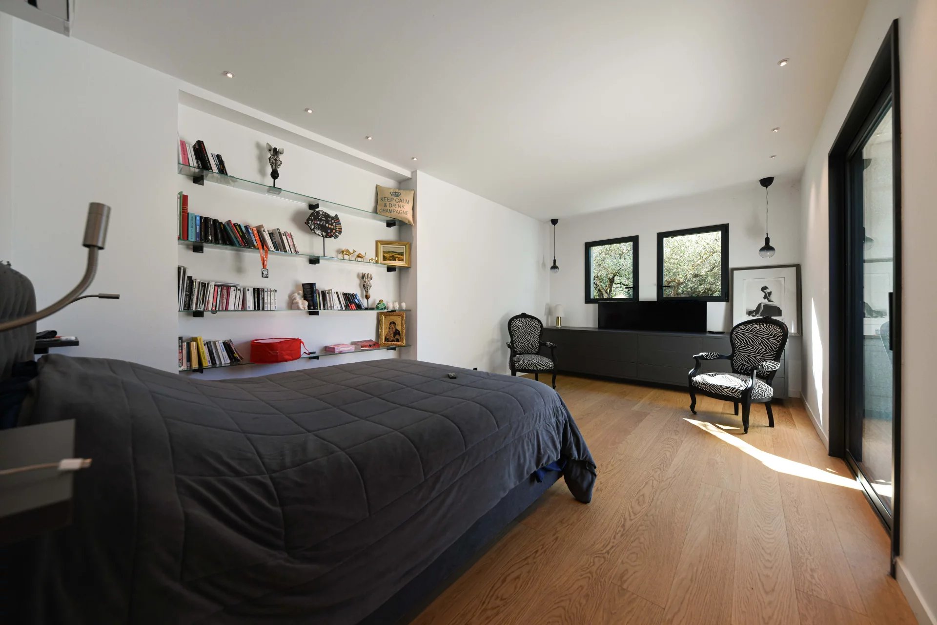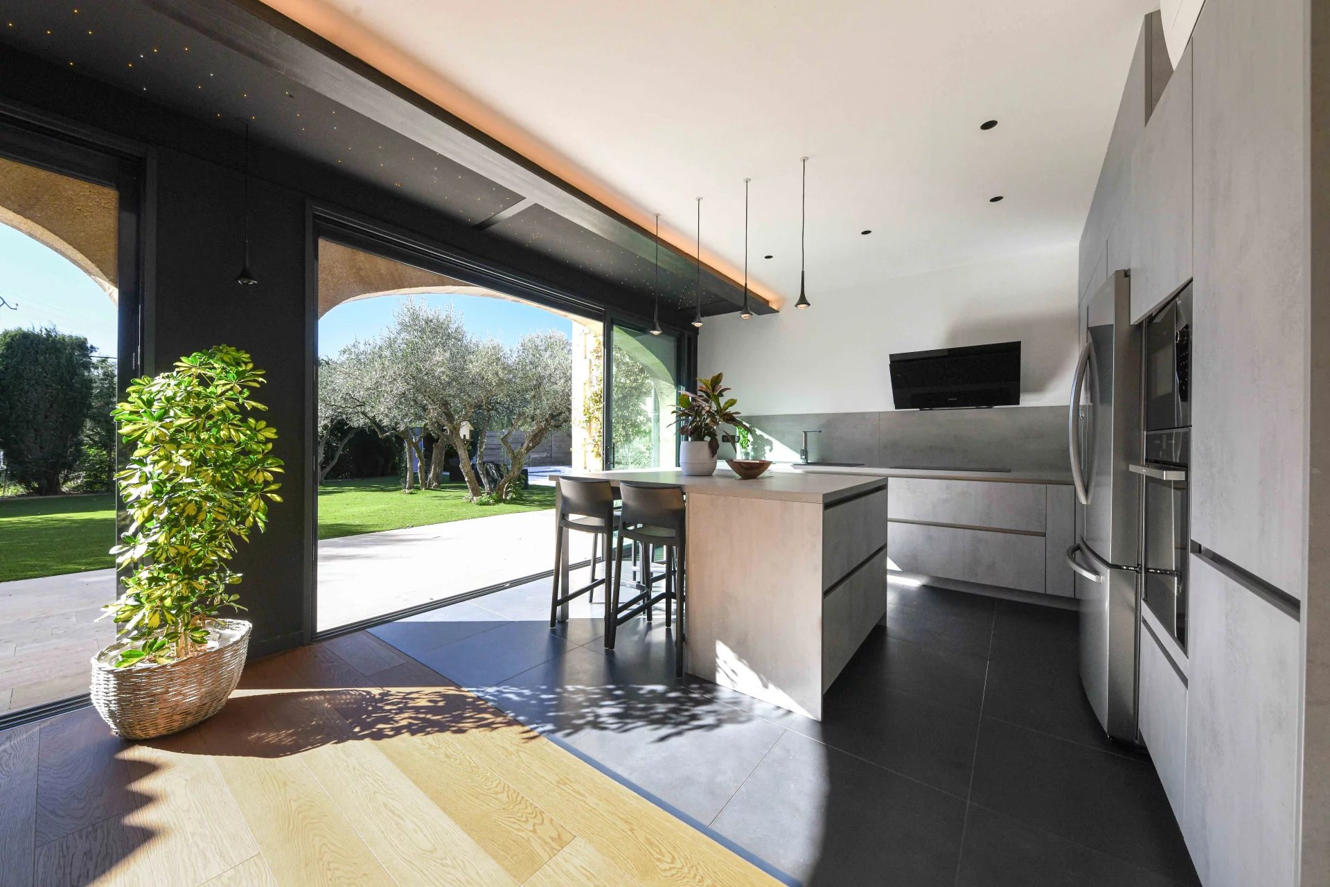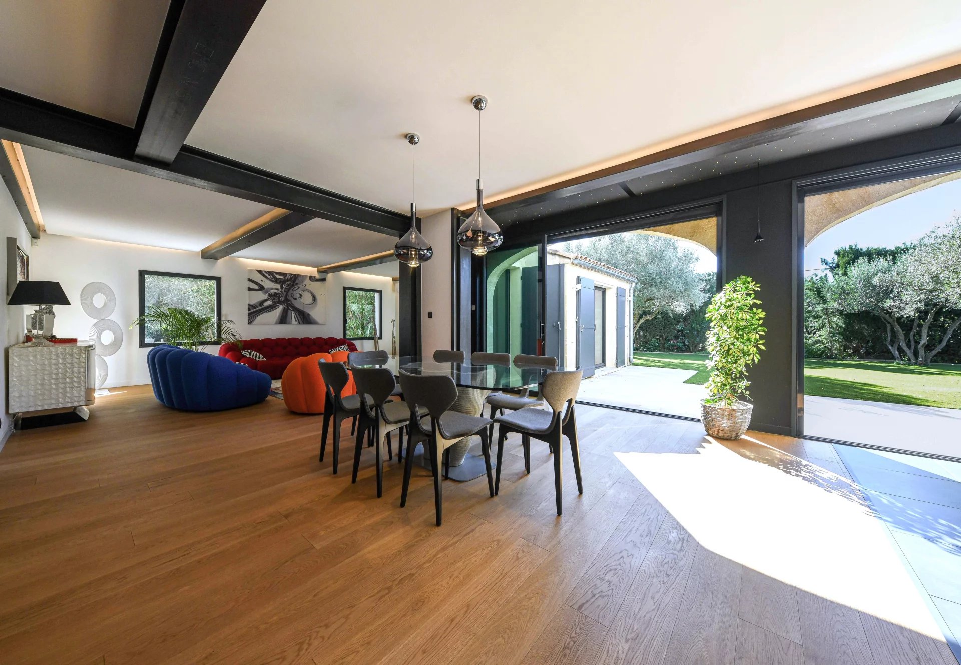 Ensemble de réception de 100 m² ouvert sur le jardin et la terrasse piscine 5 chambres, 3 salles de bains dont une suite de plain-pied Jardin arboré et paysagé de 1500 m², piscine 10 x 5 m, Garage. Dans un village prisé, à 5 km d’Uzès et 2 km des commerces