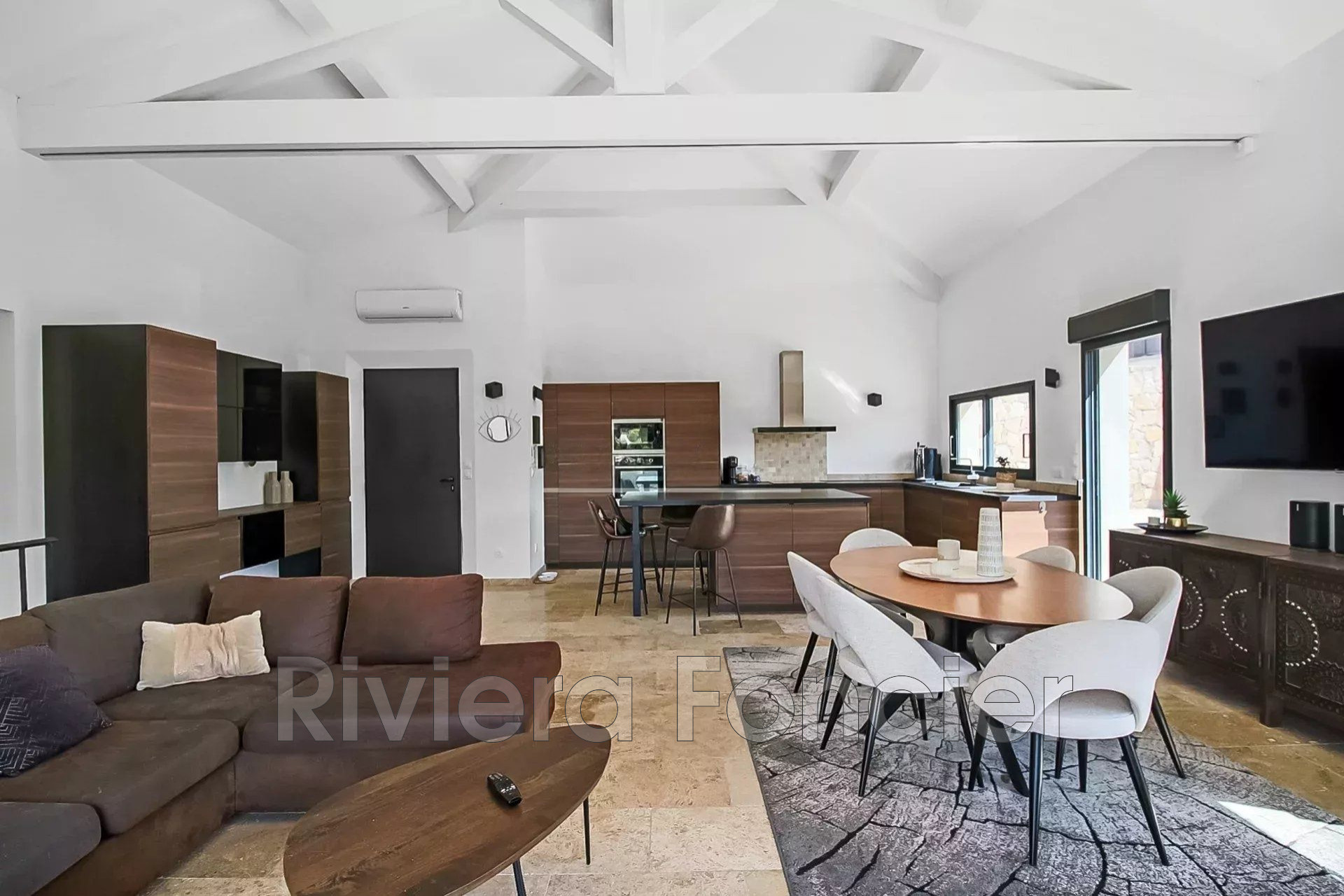 La maison offre un vaste espace de vie baigné de lumière avec salon, salle à manger et cuisine ouverte entièrement équipée, s'ouvrant sur une belle terrasse avec vue dégagée sur les collines.