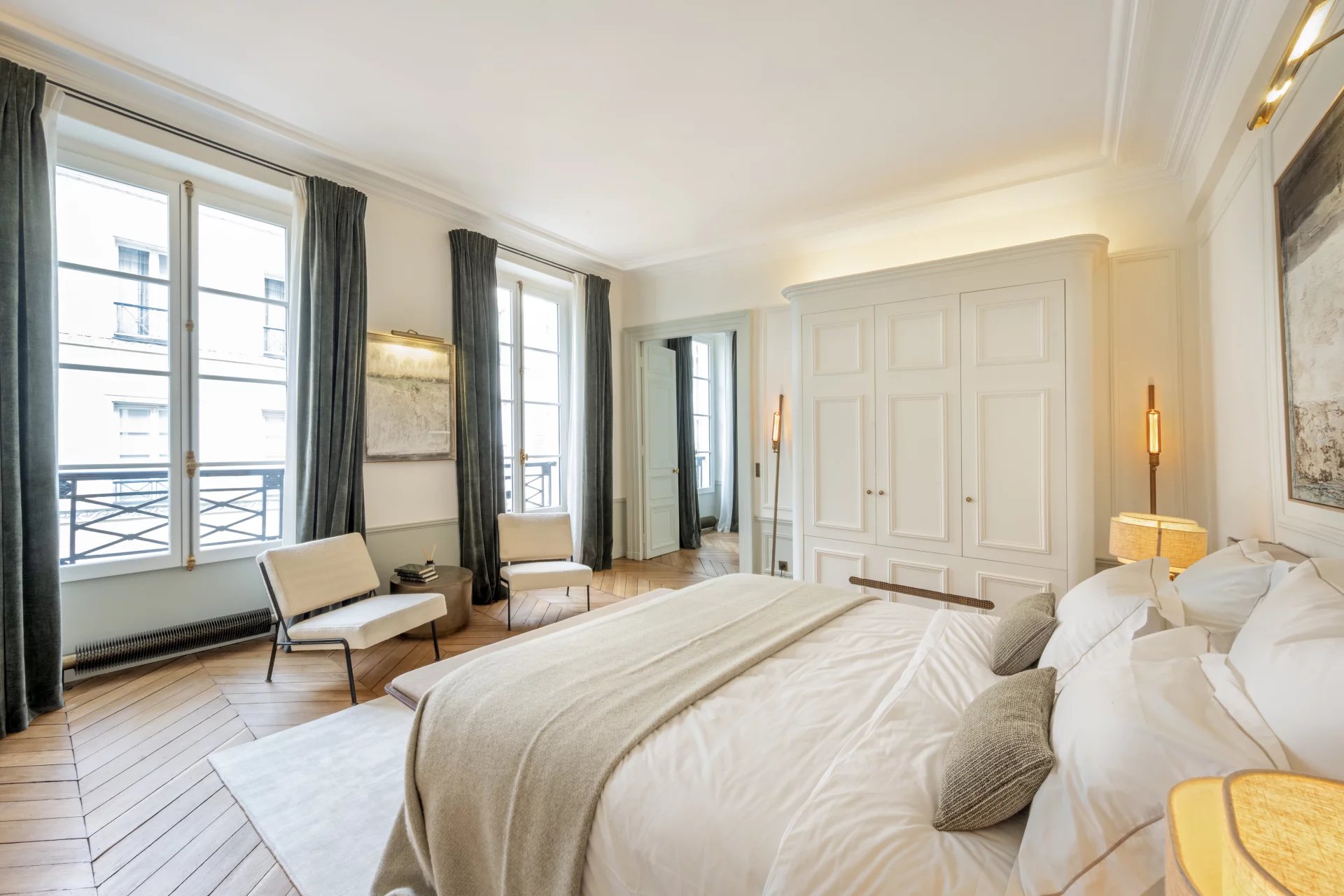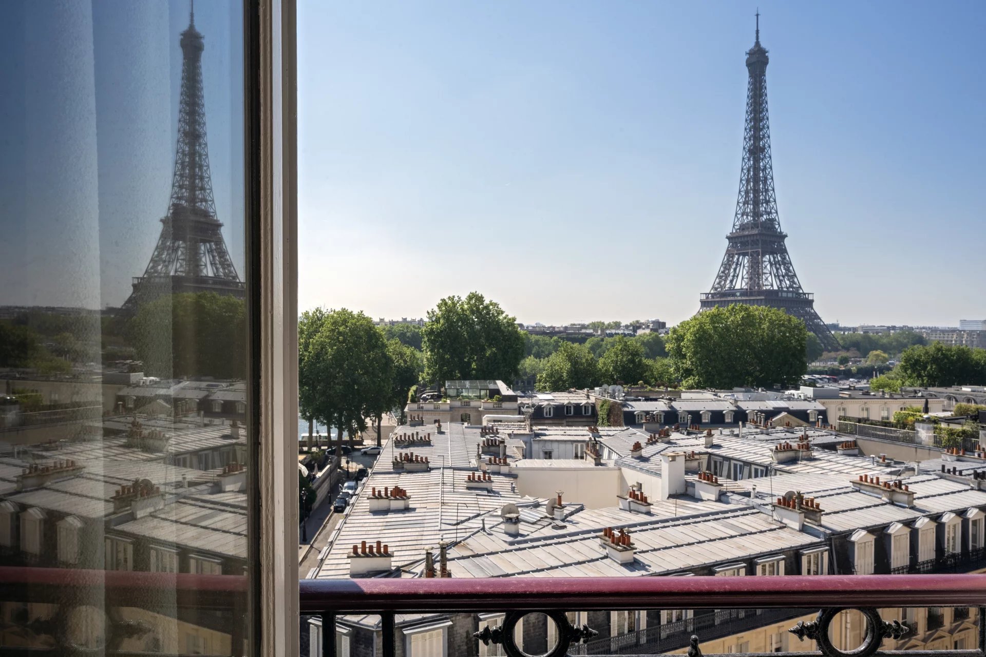 Triangle d'Or/Seine : appartement d'exception de 100m2 (96,36m2 loi Carrez, 98m2 au sol et balcon de 8m2) entièrement rénové et climatisé, disposant de magnifiques vues de la Seine et de la tour Eiffel. Il est composé d'une entrée avec rangements, d'une pièce de vie de 40m2 avec balcon filant, d'une cuisine américaine équipée, de deux chambres en suite avec chacune sa salle d'eau et son dressing et de toilettes indépendantes. L'appartement surplombe une voie privée calme, il est exposé sud-ouest. Il est vendu meublé et équipé. Parking sécurisé dans la voie privée et grande cave. Immeuble haussmannien en pierre de taille avec gardien et ascenseur.