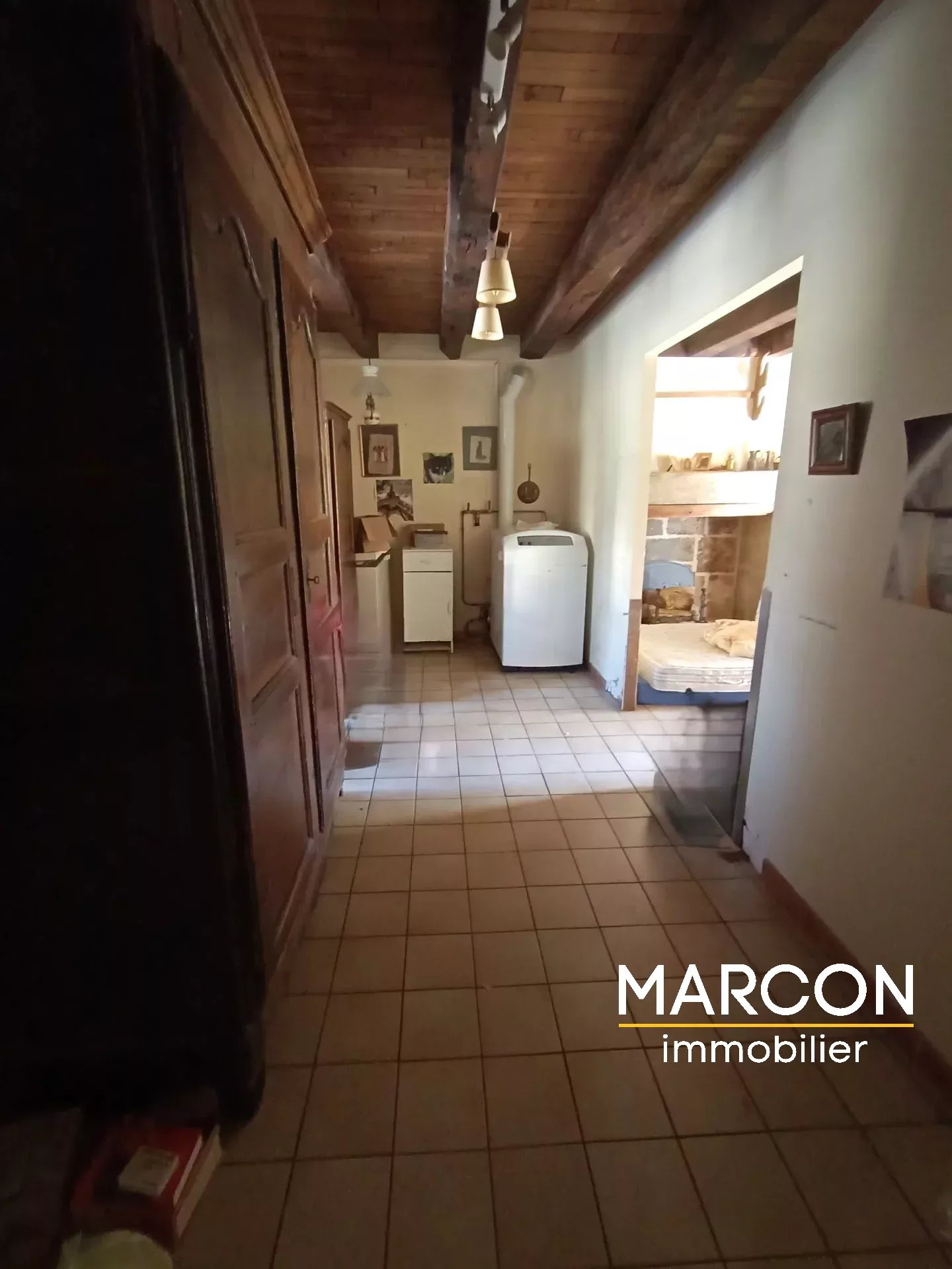 Une entrée accueillante qui donne sur une grande cuisine et salle à manger avec une cheminée avec insert à bois, un wc, un grand dégagement, une grande pièce avec cheminée et coin salle d'eau avec wc.