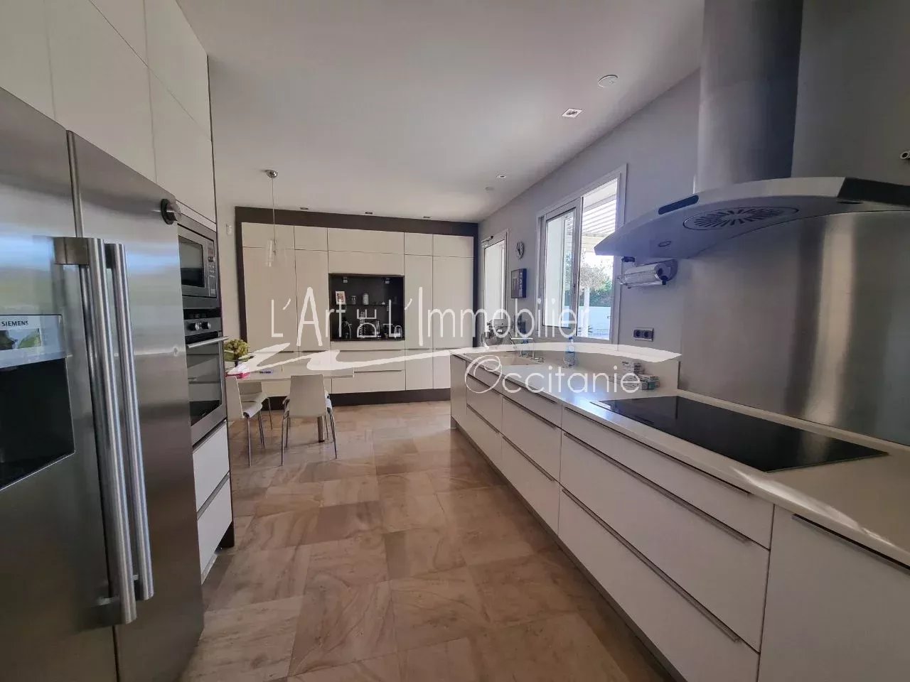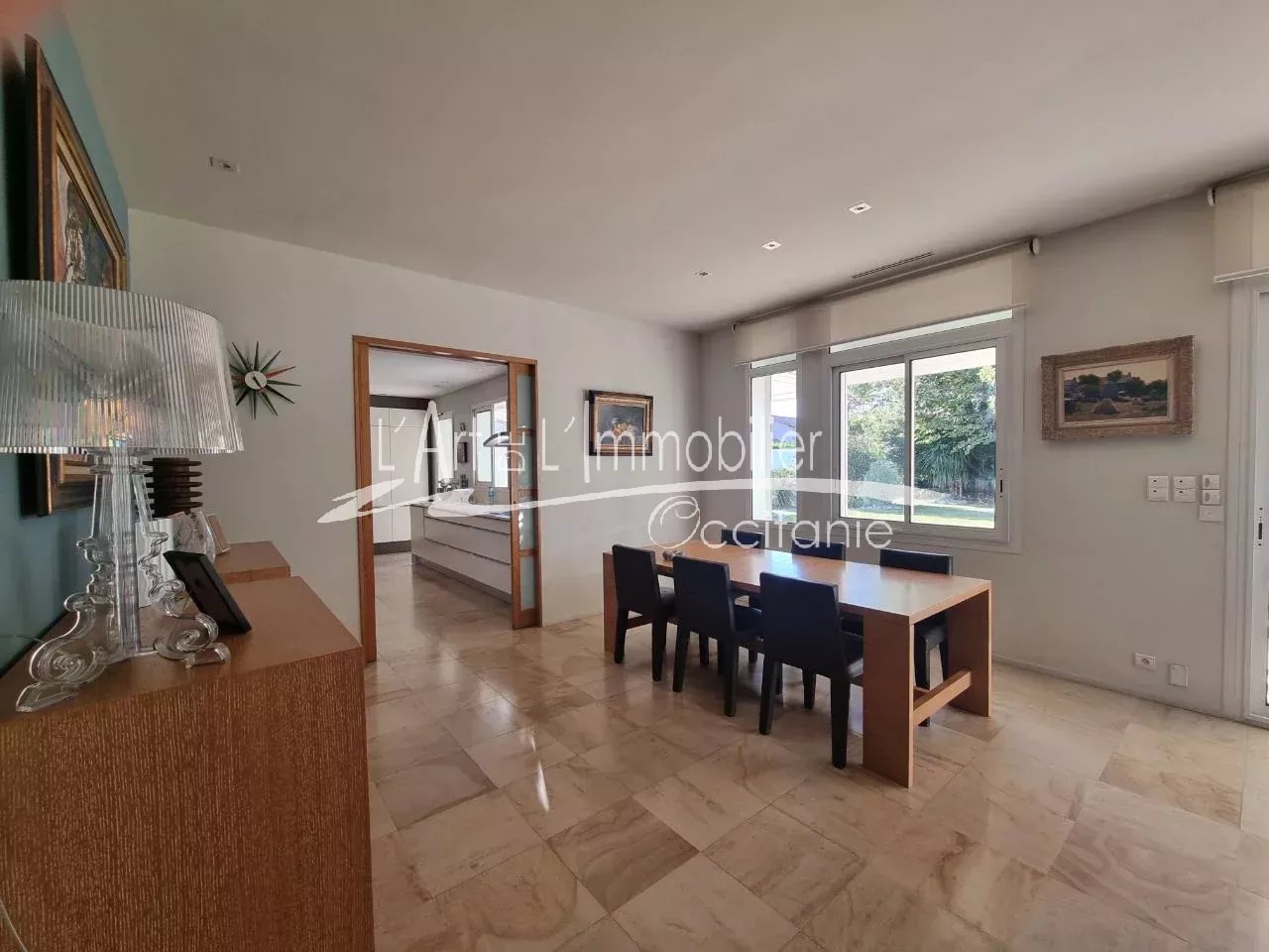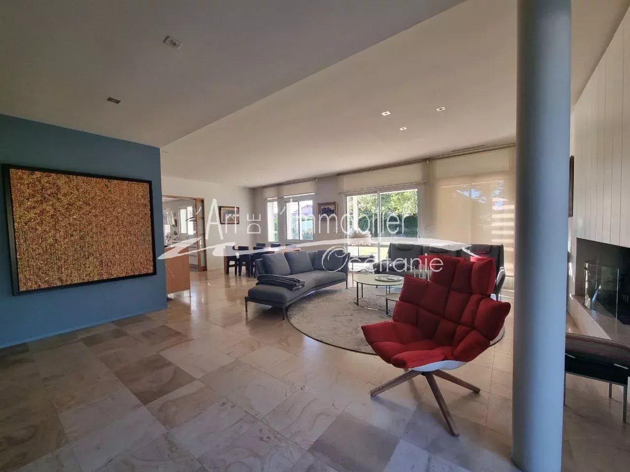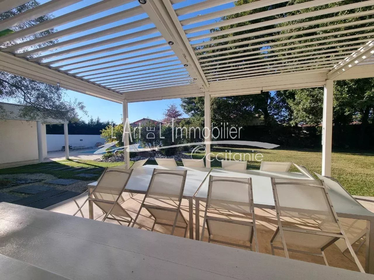 Très belle maison contemporaine développant 250 m² environ de superficie habitable. Prestations haut de gamme. Son entrée, dégagement, placards, cuisine équipée haut de gamme, ouverte sur séjour, avec possibilité de fermer avec de belles portes à galandage. Beau séjour lumineux, réhaussé de sa cheminée à foyer ouvert. L'ensemble des pièces de vie est ouvert sur sa belle terrasse de 50 m² environ, pergola climatique, avec vue sur le parc et sa piscine 11/5.20. Sa partie nuit du rez-de-chaussée se compose de sa belle chambre, sa salle de bains, toilettes/sas, bureau, salle de sport, nombreux rangements. A l'étage, son espace nuit vous propose 3 chambres, bureau, toilettes, salle de bains, salle d'eau, une pièce jardin d'hiver ouverte sur une terrasse sur le toit, vue sur le parc et piscine. Un grand garage de 69 m² env., cellier/salle d'eau. Puits. Arrosage intégré. L'ensemble édifié sur un beau terrain boisé, paysager de 2000 m² env.