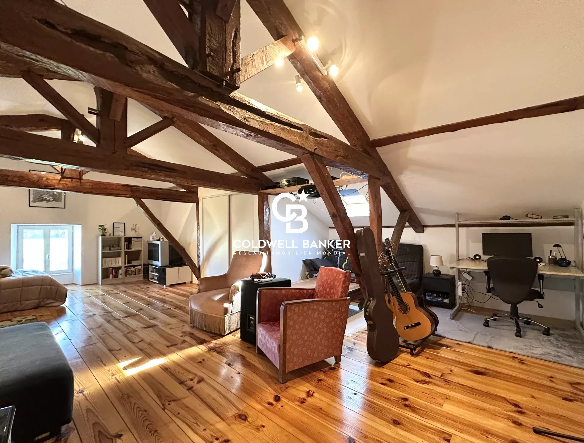 De plain-pied, la bâtisse s’articule autour d’un vaste séjour à l’atmosphère chaleureuse, sublimé par un insert, et prolongé par une cuisine. Ce niveau accueille également deux chambres, un bureau, une salle de bains et un WC indépendant, conjuguant confort et fonctionnalité.